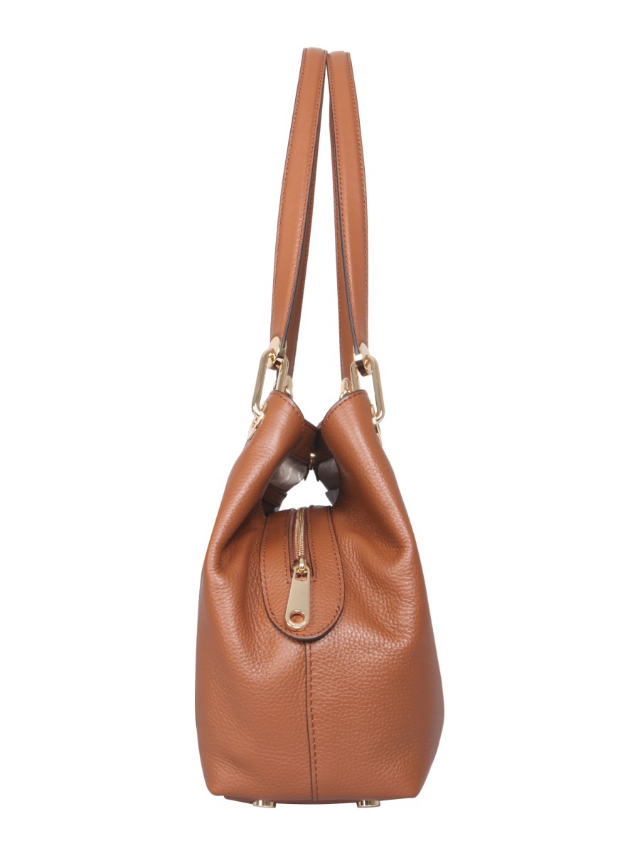 This classic bag from Michael by Michael Kors is hand-crafted in Italy and features a snap button and zip closure, double leather handle, and a hammered shoulder bag. It is perfect for the modern woman who wants to add a touch of class to her outfit. The handles of the bag are made from calf leather and are hammered for a unique look.