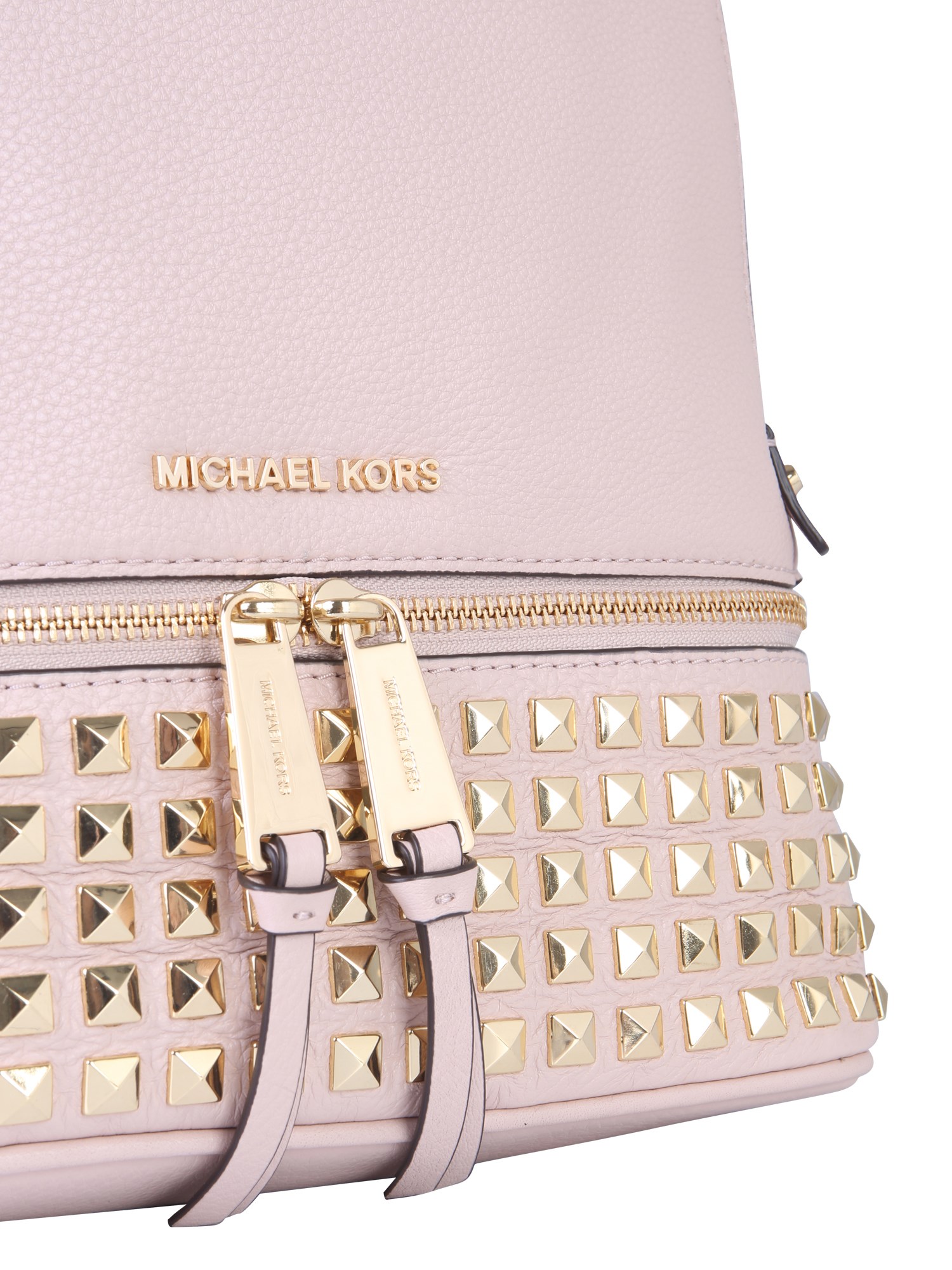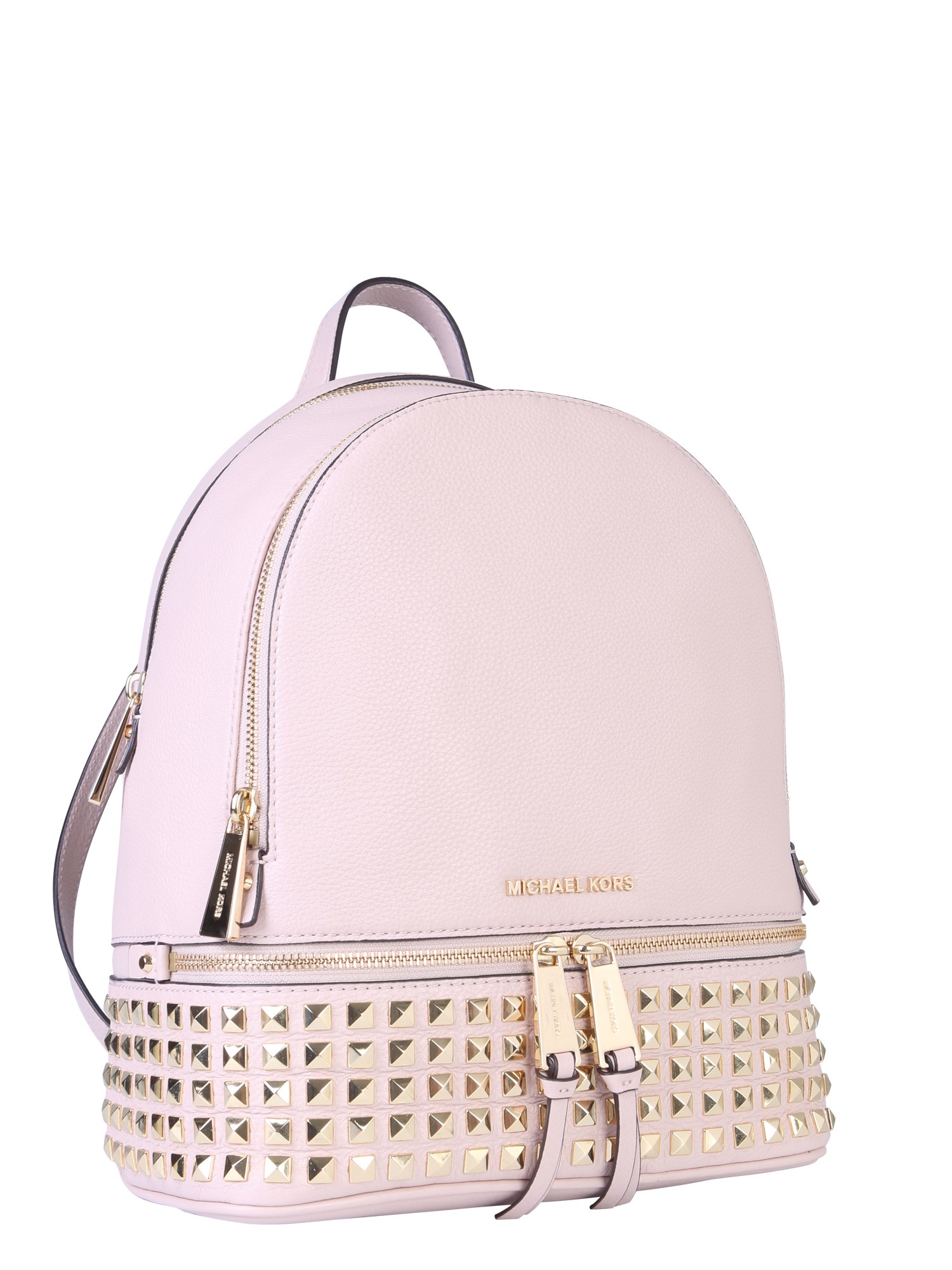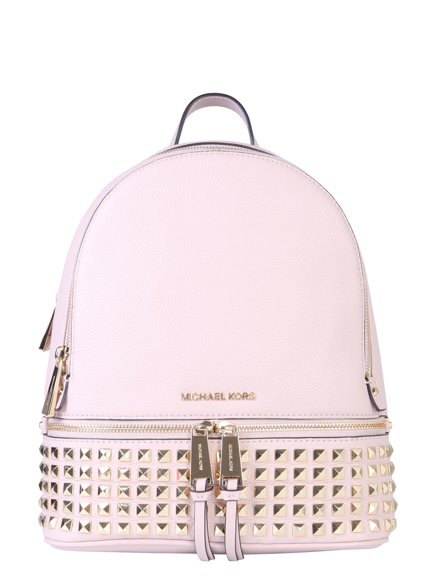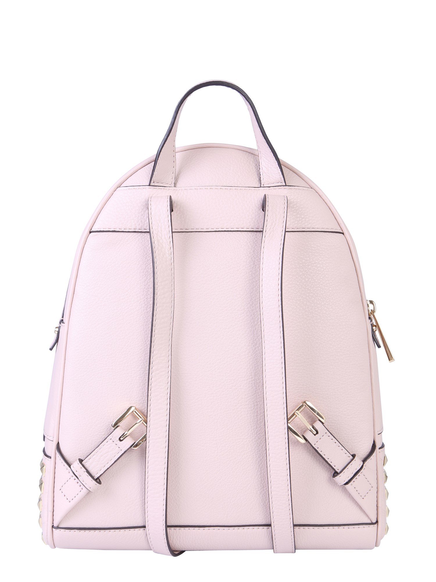 Excite your accessory collection by adding this medium rhea zip backpack from the collection of Michael by Michael Kors. The bag comes with two upholstery pads with a handle on the top to carry it conveniently. It features gold-finished metal accessories that lend a refining touch to its design. Having multiple pockets, this bag can carry all your belongings.