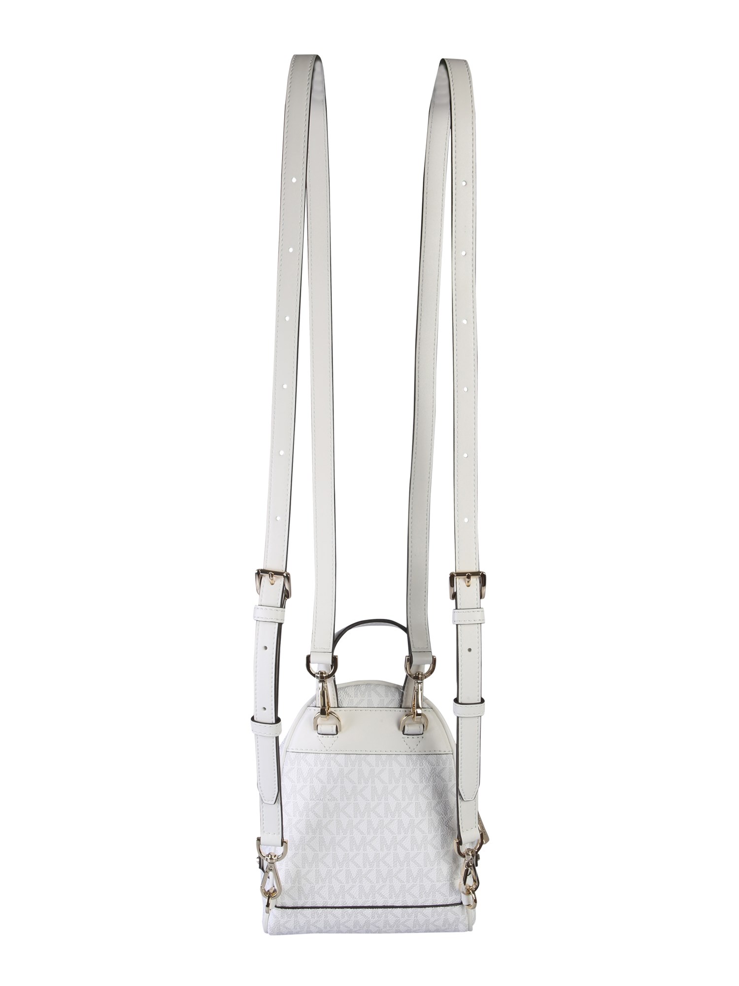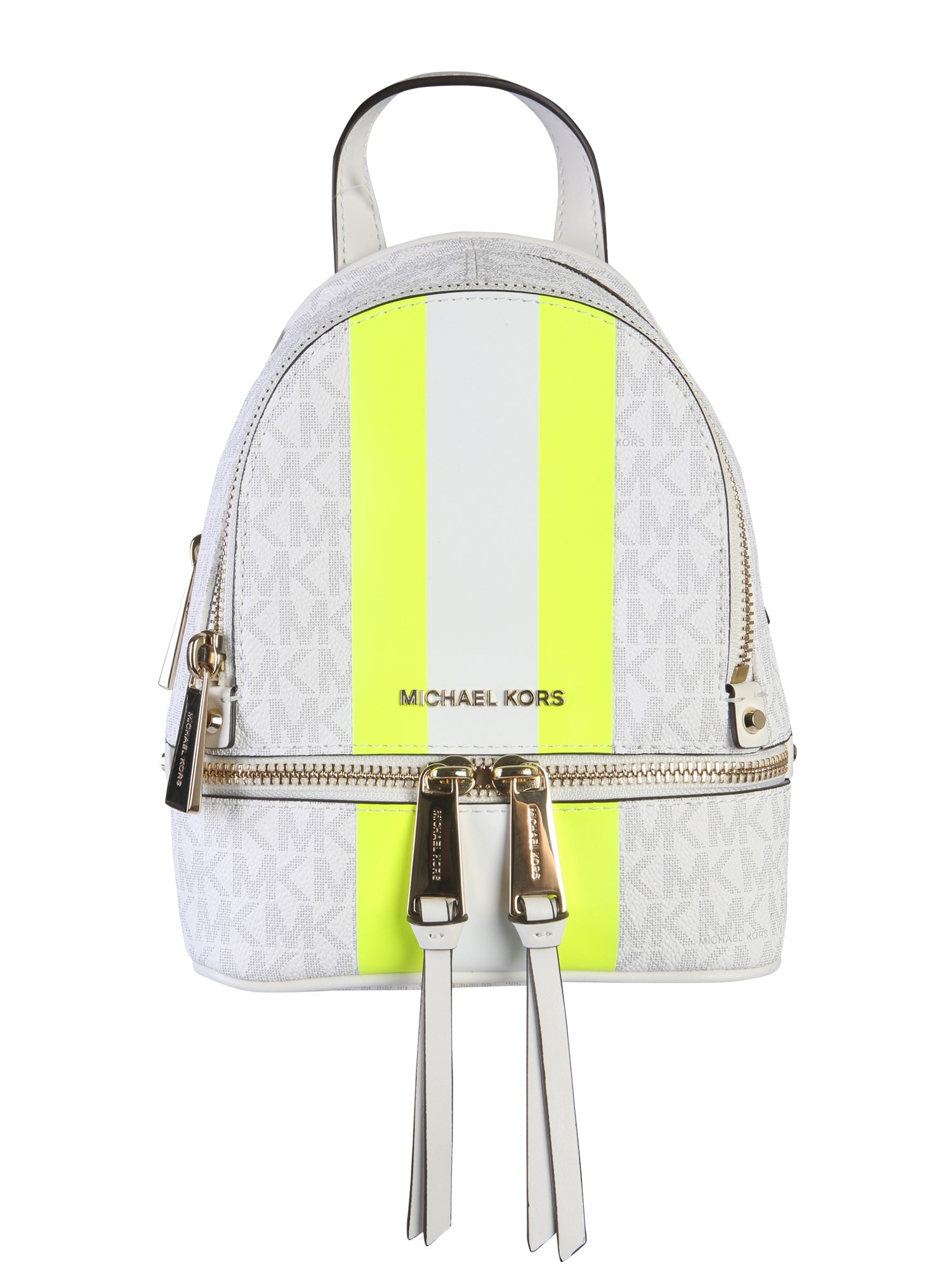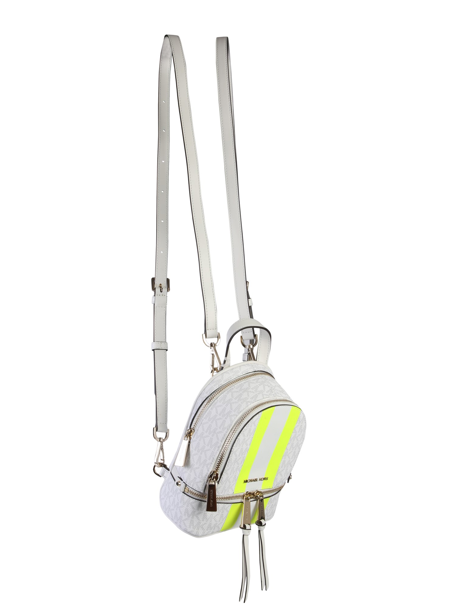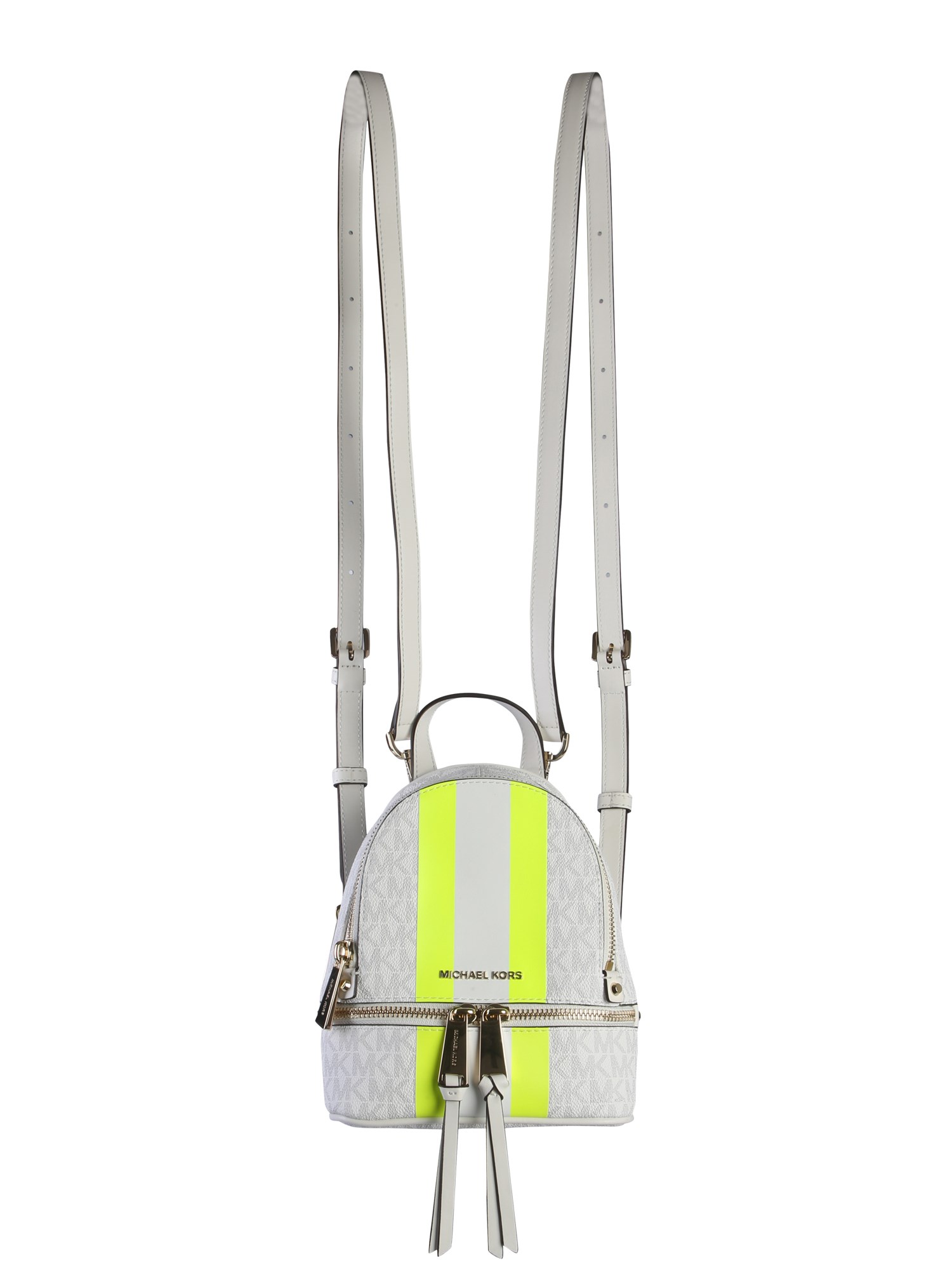 Upgrade your accessory collection with this rhea zip backpack from Michael By Michael Kors. The bag is made of a mix of PVC, polyester, cotton and polyurethane that guarantees long life. Its front features a logoed surface with contrasting stripes that give it a unique appeal. The two adjustable shoulder straps make it your perfect companion for dates, trips and parties.