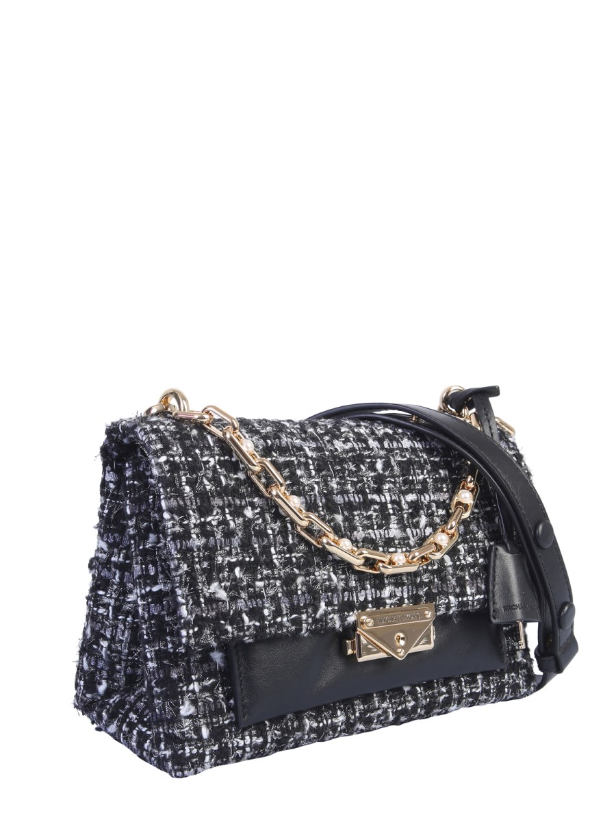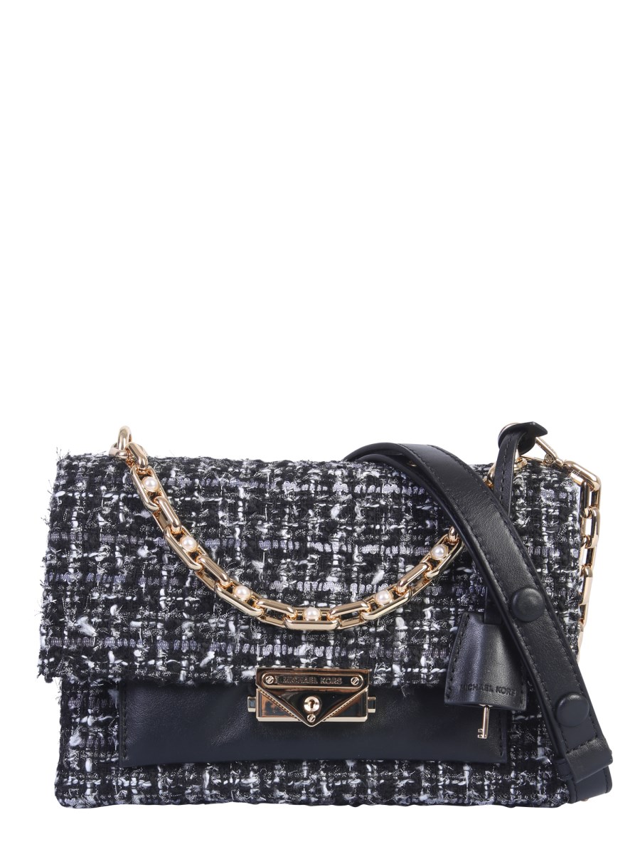 The Cece bag from Michael by Michael Kors is a fashionable accessory to flaunt everywhere you go. It has an exquisite exterior with tweed texture in a plaid pattern and gold-plated metal accents. The lined inner with two compartments and central zip is secured with a flap and click closure.