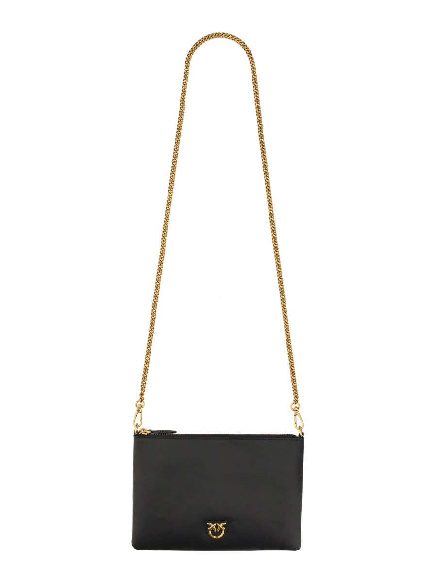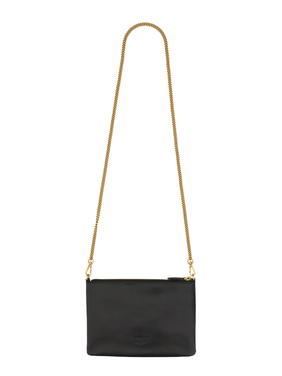 This bag from Pinko is made of cowhide leather and features a classic sling design. It has a zipper closure, a removable metal chain shoulder strap, and a zipper pocket in the front of the bag. The bag is light and easy to carry with its removable chain strap. The cowhide leather is the exterior material.