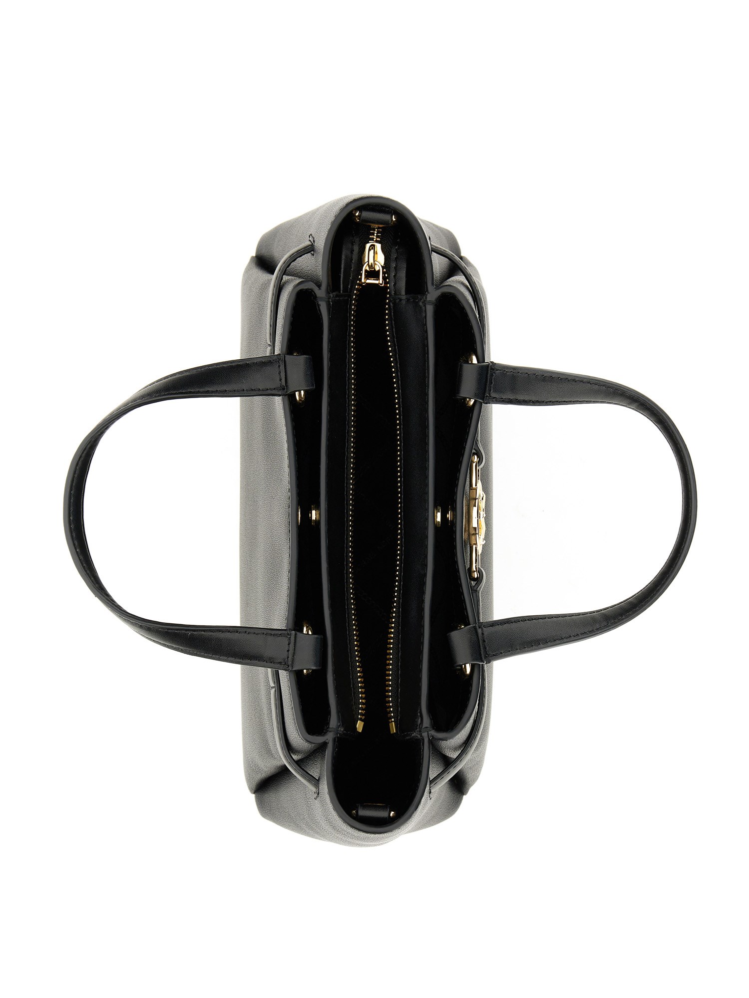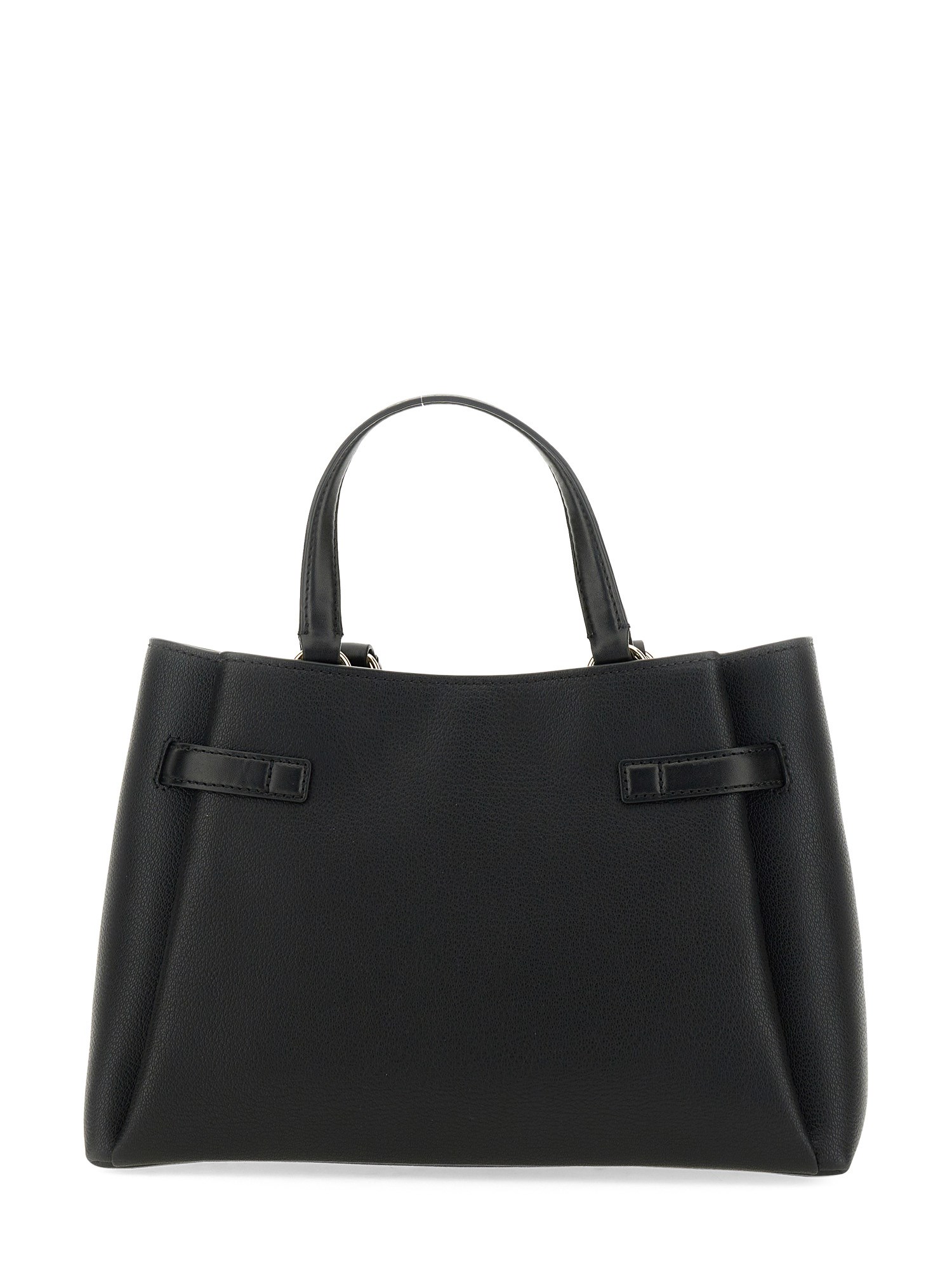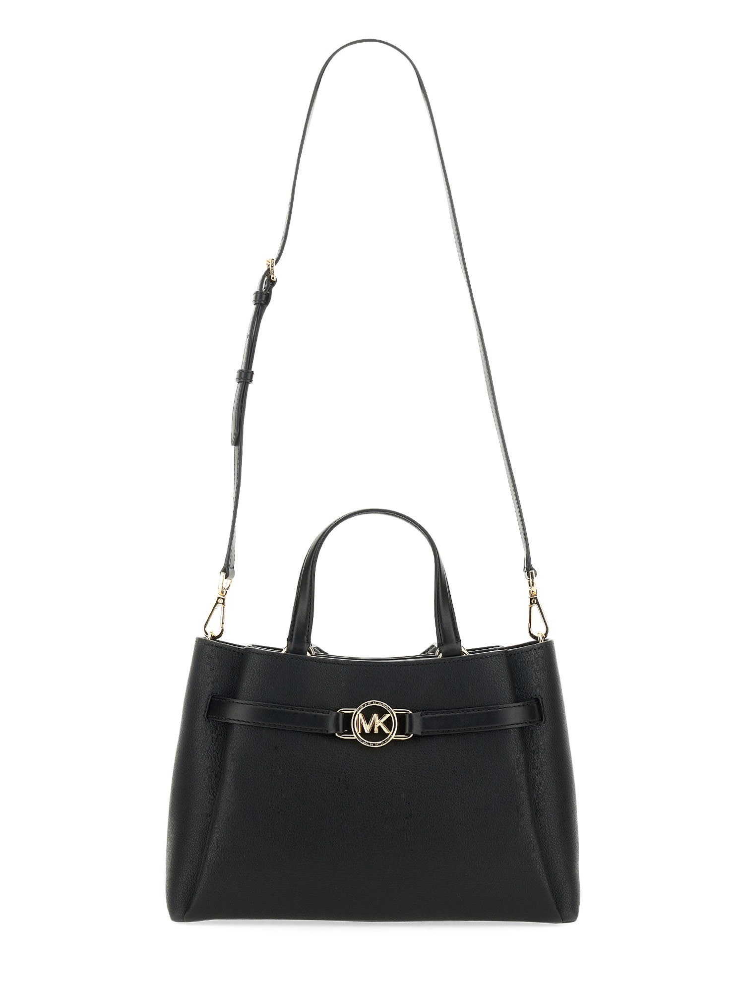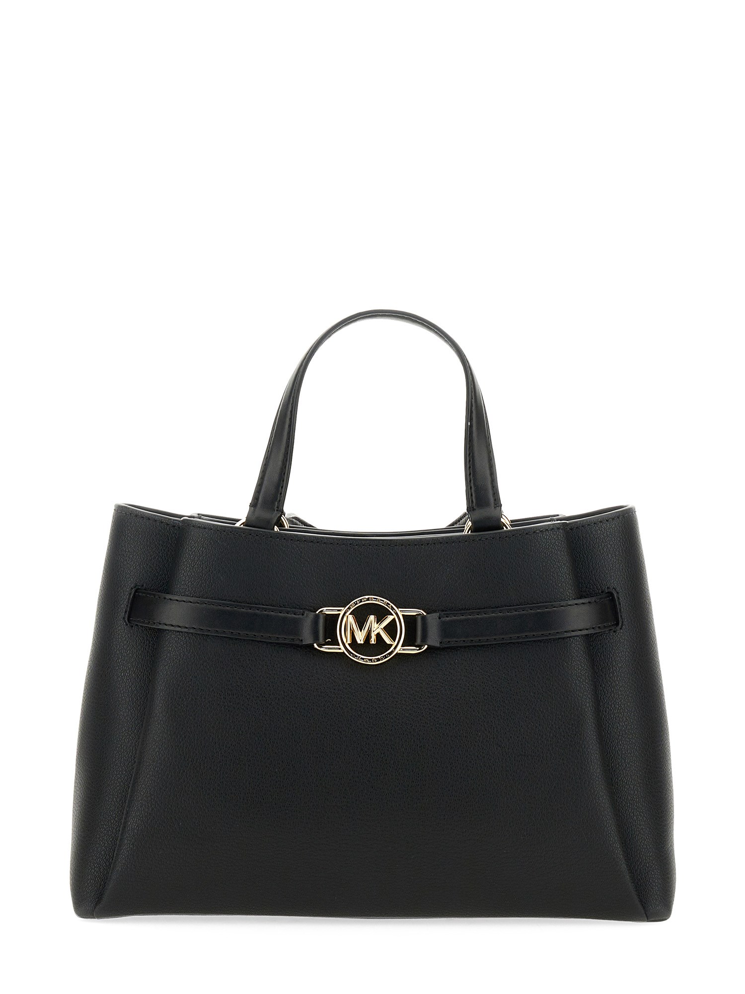 This bag from Michael by Michael Kors is made of genuine leather and has a traditional design. The double handles make this bag easy to carry. This sleek, double-handle leather bag is the perfect accessory for a night on the town. This leather bag has two handles and is a traditional style, with top zipper closure.