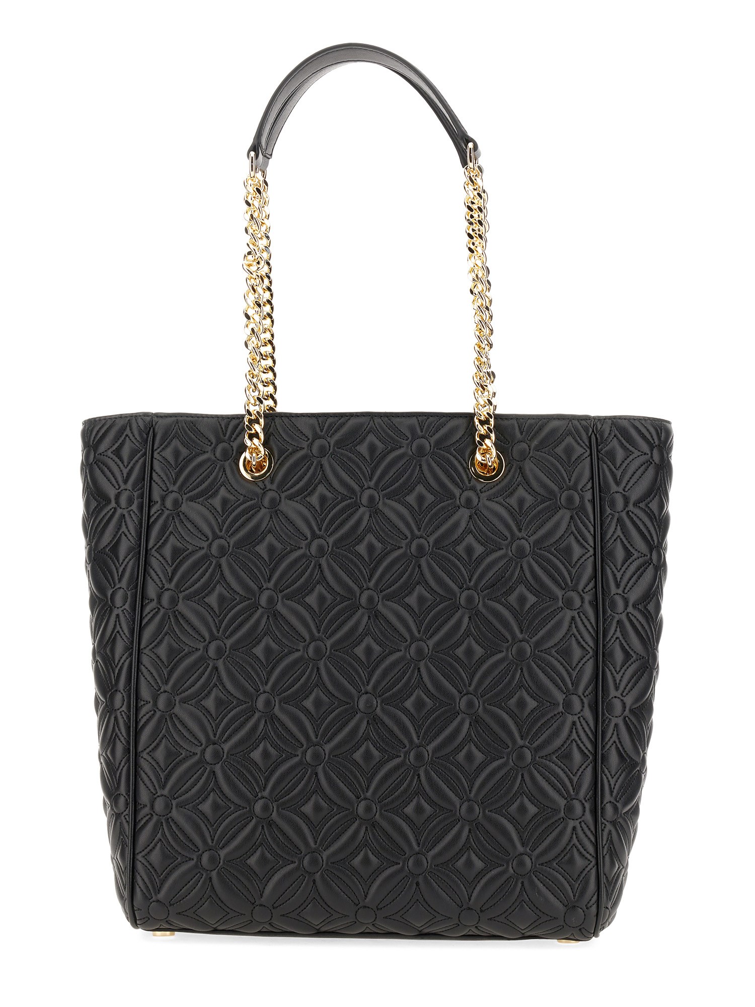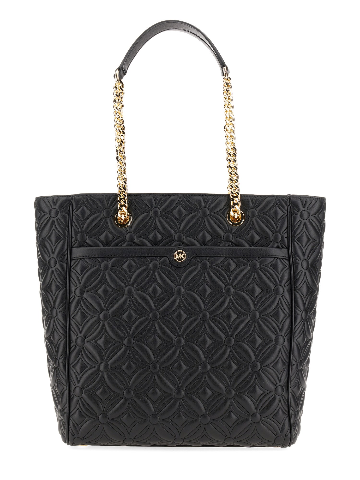 This leather handbag from Michael by Michael Kors has a sleek design with an elegant and sophisticated look. The bag is made from quality leather and has a double top handle and chain strap. It features a metal logo on the front, one front pocket, and a zipper closure.