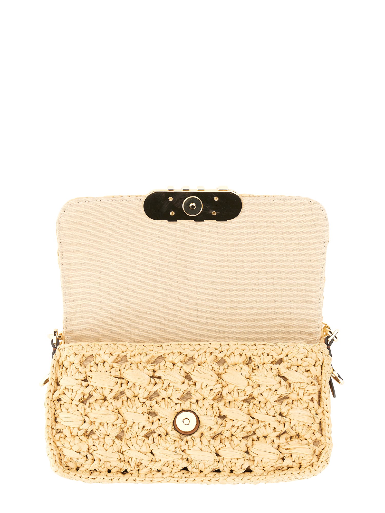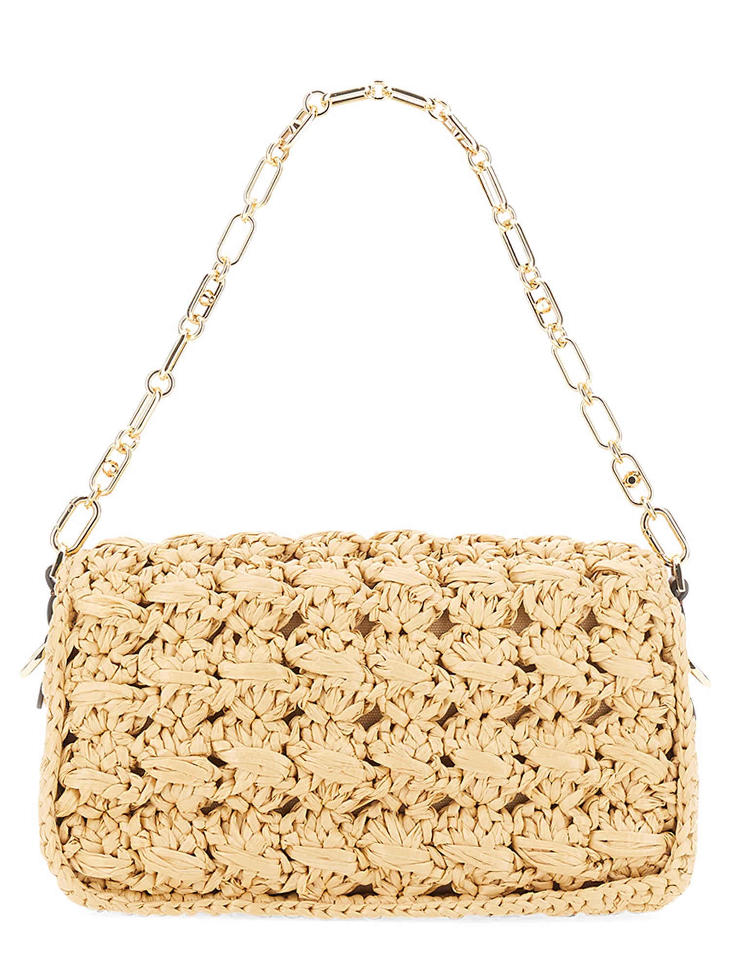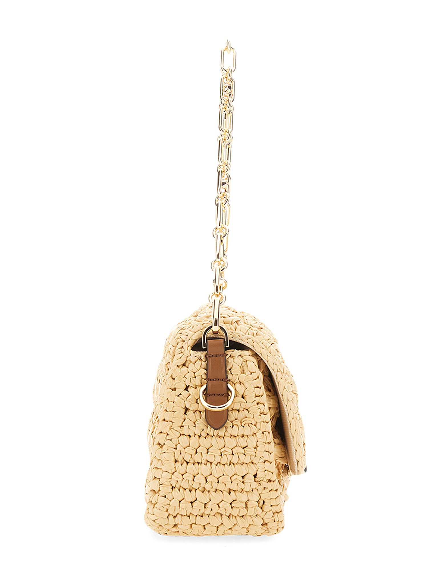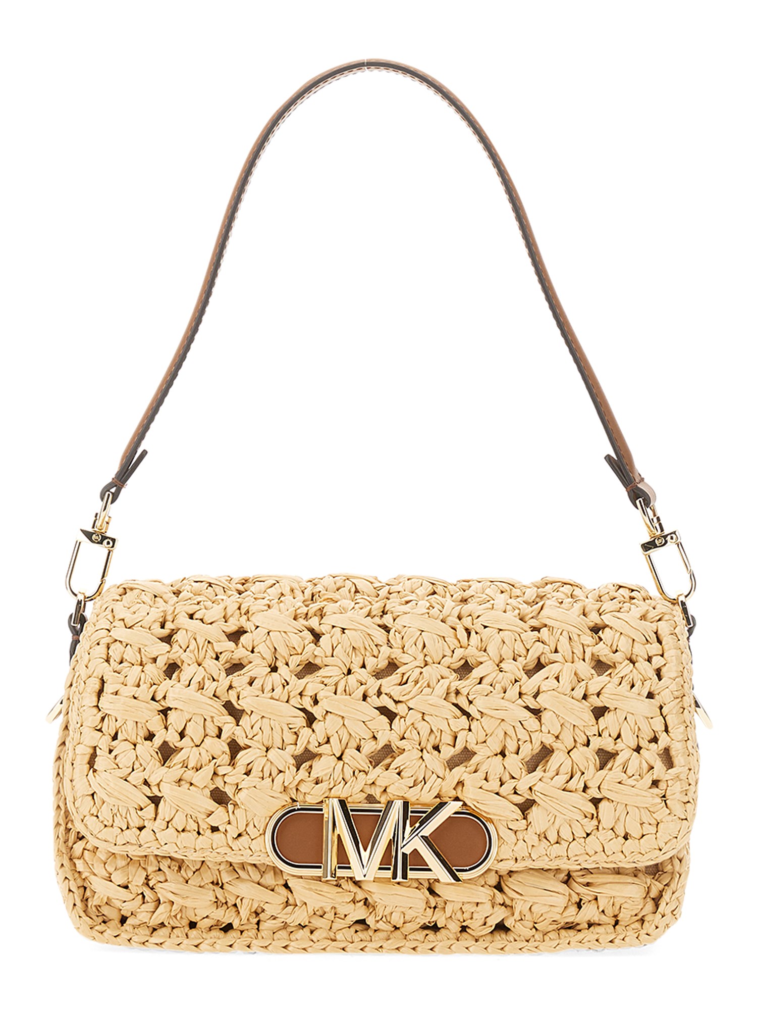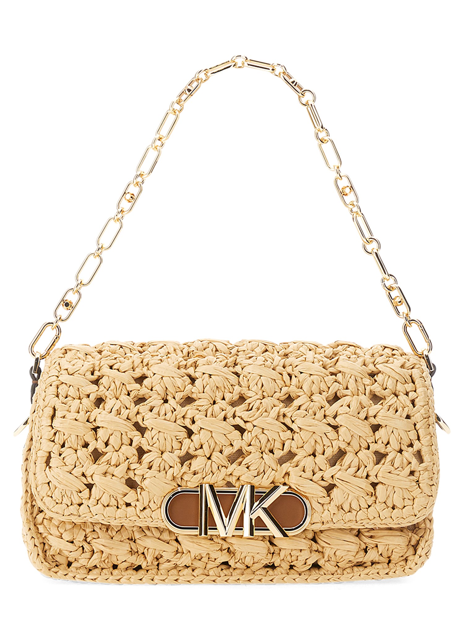 A simple, yet functional bag from Michael By Michael Kors that is a must-have for any outdoor excursion. It features a removable leather shoulder strap and chain shoulder strap. The bag has a magnetic closure with a flap and is adorned with a front logo plaque and braided design. The medium size is perfect for most outdoor needs.