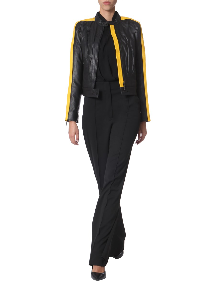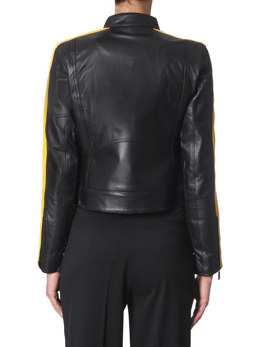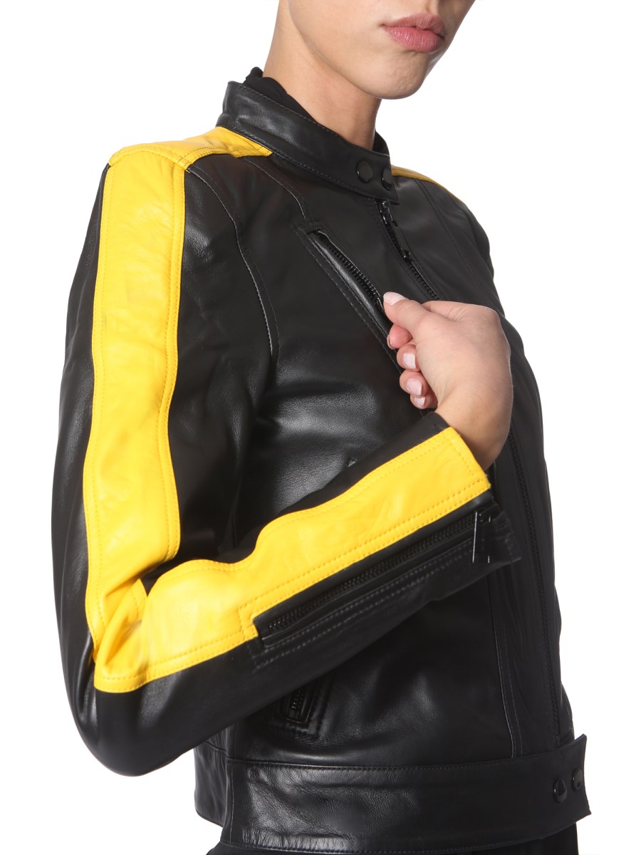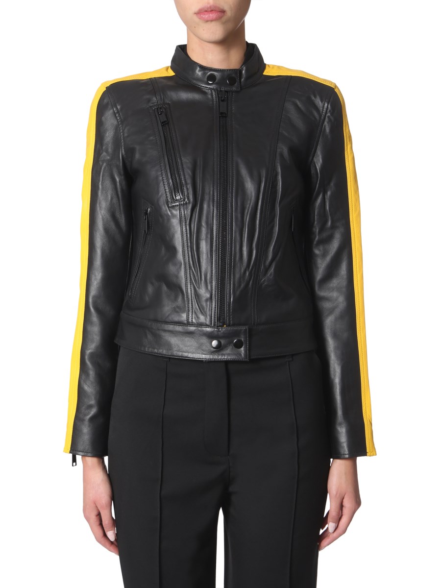 The leather jacket from Michael by Michael Kors is for sporty and stylish people. Its contrast detailing and zip on the sleeves are designed to add glamour. This jacket has a zip closure at the front and lined inner. Made of 100% leather, this apparel has a smooth and glossy texture.
