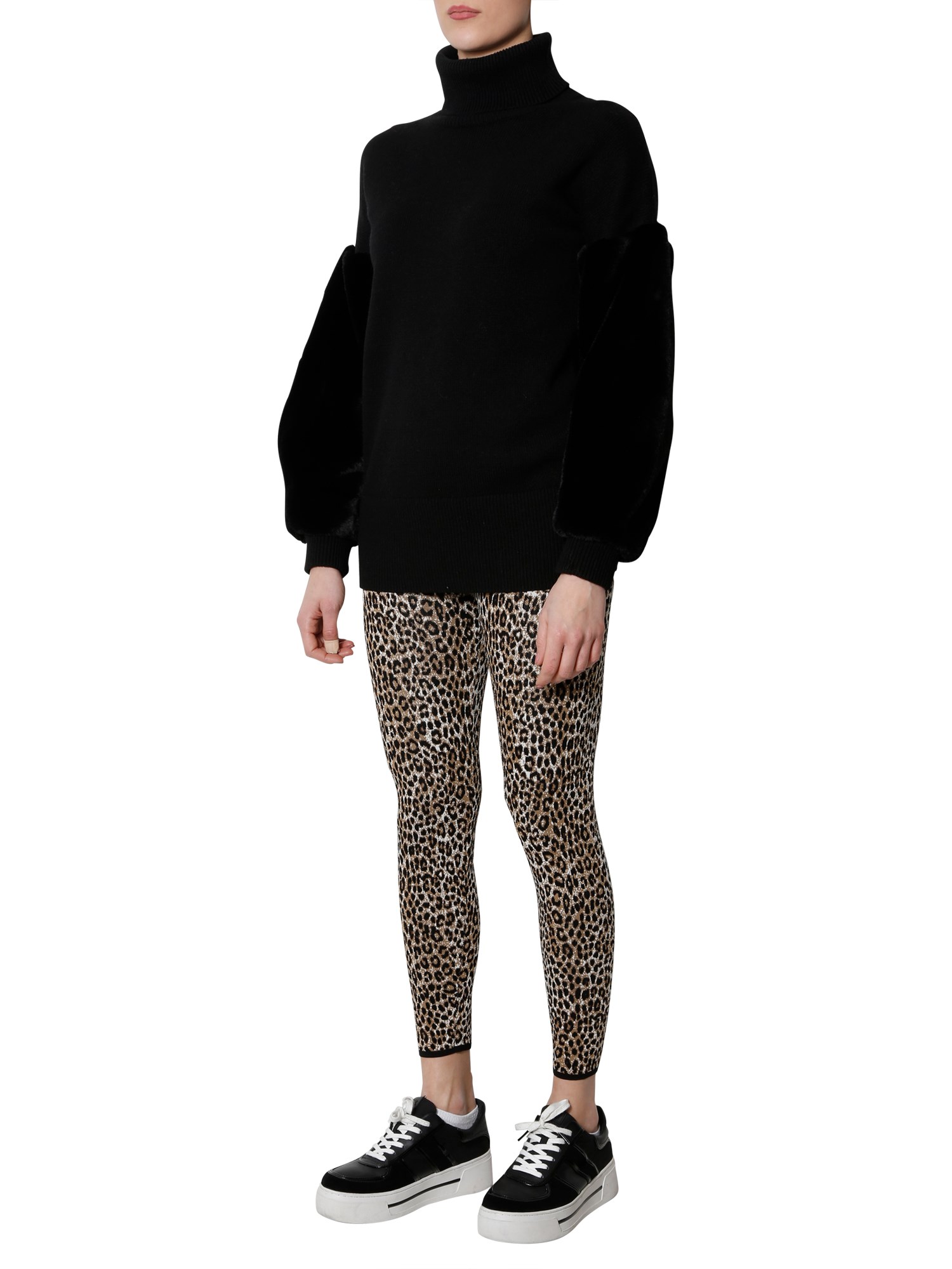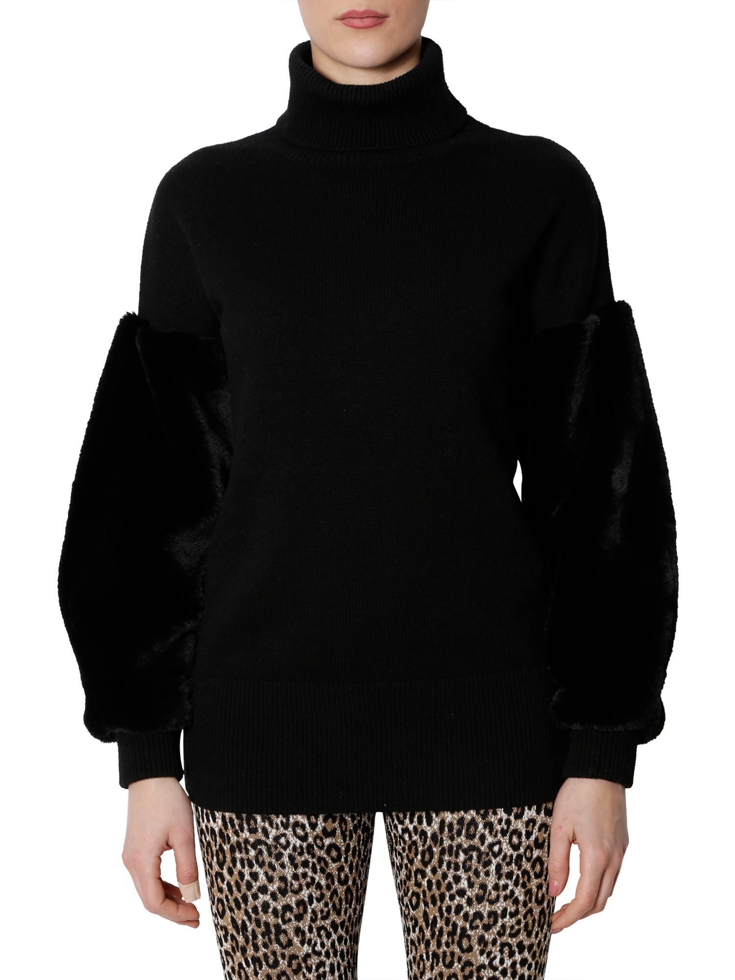 This woollen high-neck sweater from Michael by Michael Kors exhibits a refined look with velvety-fur sleeves. The woollen body is accompanied by a polo neck and ribbed bottom. Snug and warm, this sweater completely transforms the look of your collection. The oversize fit of this sweater looks best with a pair of slim-fit trousers or jeans.