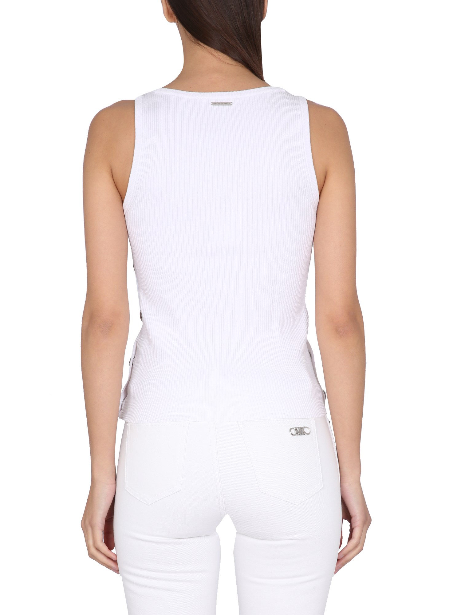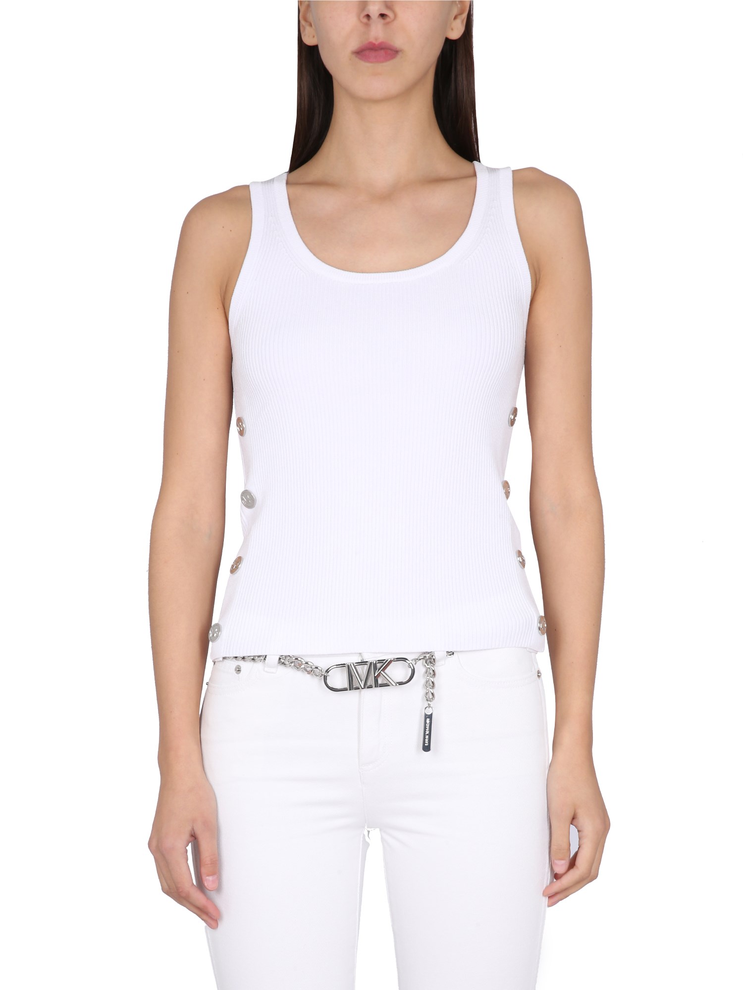 You'll be ready for any summer event in this white tank top with a crew neck and sleeveless cut from Michael by Michael Kors. This cotton top is perfect for the pool, the beach, and beyond. The basic white tank top is a versatile staple for any wardrobe. It's perfect for any occasion.