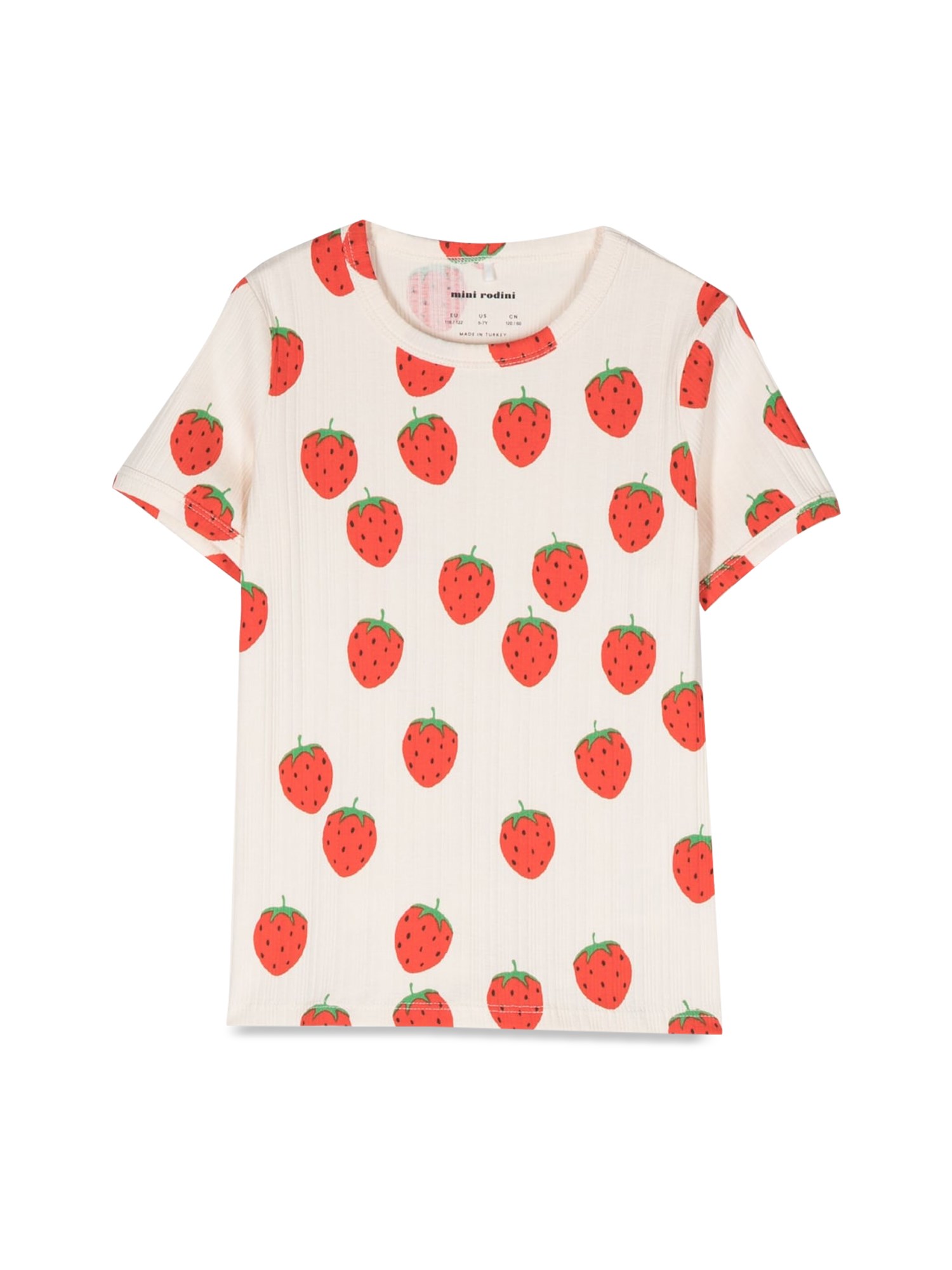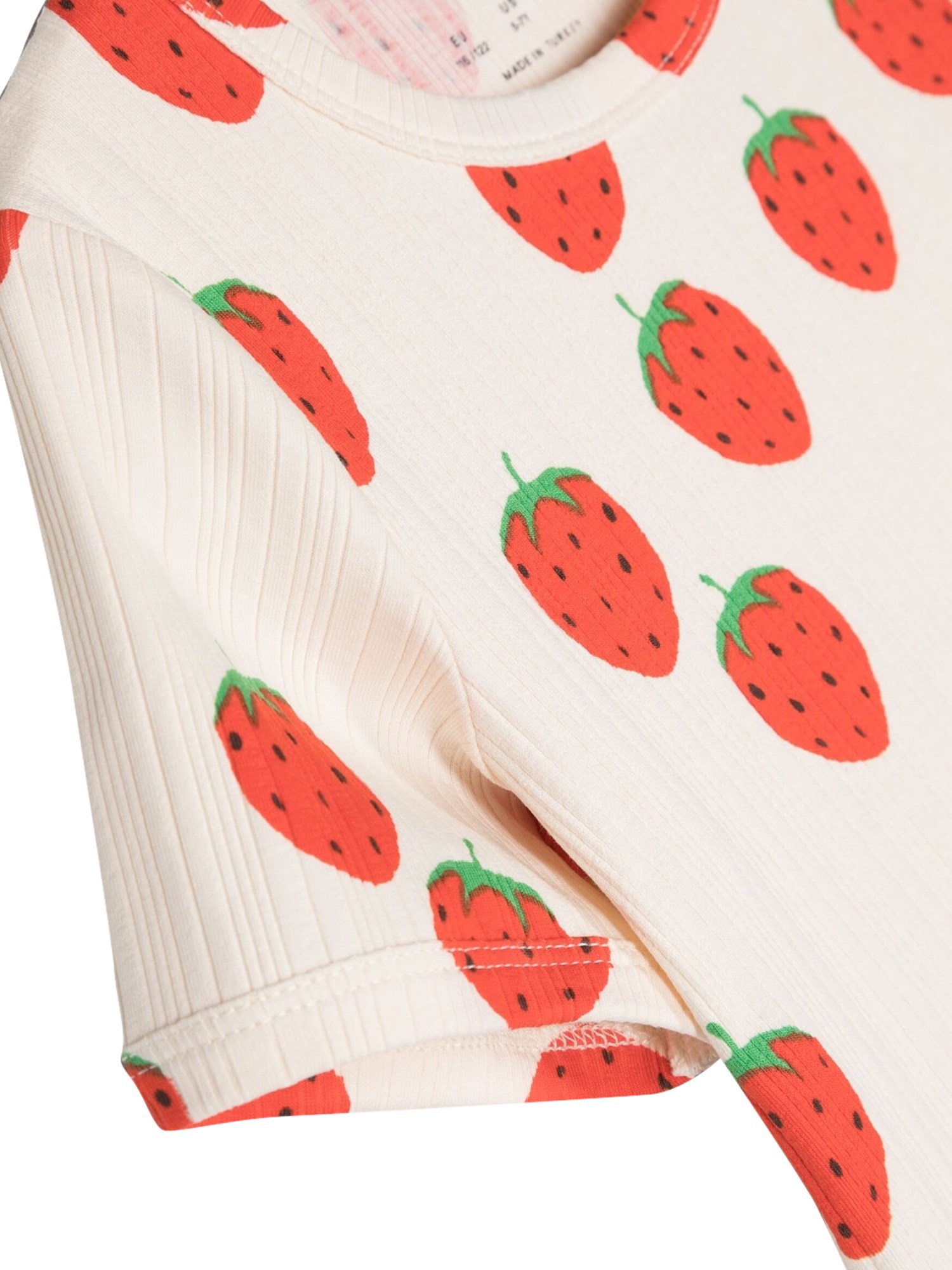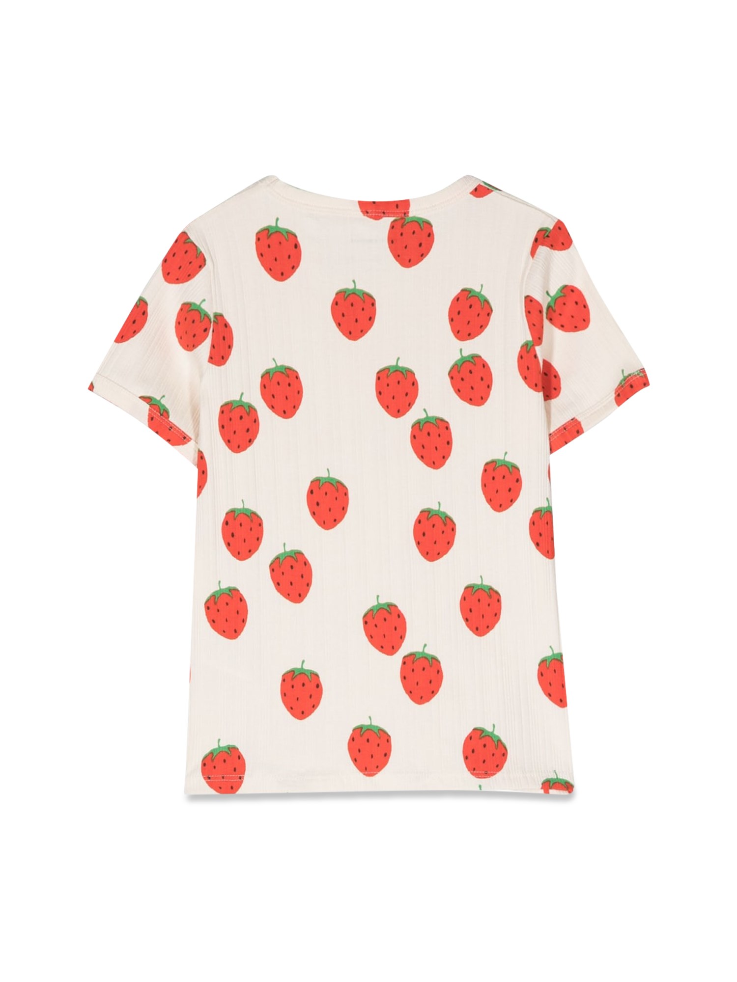 The crew neck cotton strawberry print T-shirt from Mini Rodini is a must-have for any kid’s closet. This casual, stylish shirt is a versatile addition to any outfit. This T-shirt is made of soft cotton, with a strawberry print that is both classic and fun. It's a great T-shirt to wear when you're going to a strawberry festival or just looking for a shirt that's as cute as can be.