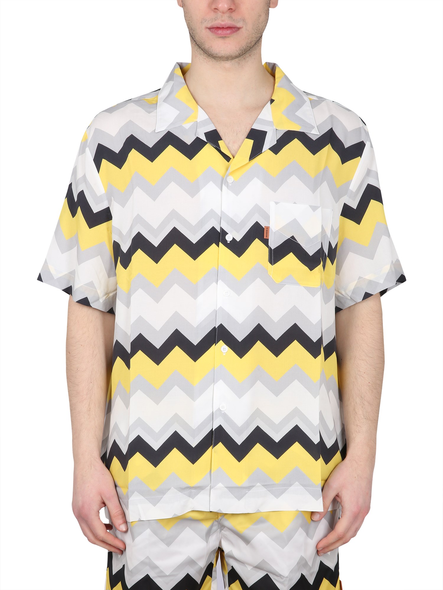 The bowling collar front button closure viscose striped shirt from Missoni is a cool shirt that has a retro look. It is a simple and classic shirt that will be a perfect addition to any outfit. It is a collared shirt that will keep you cool and comfortable in the summer. Pair this with denim and some leather shoes for a stylish, laid-back look.