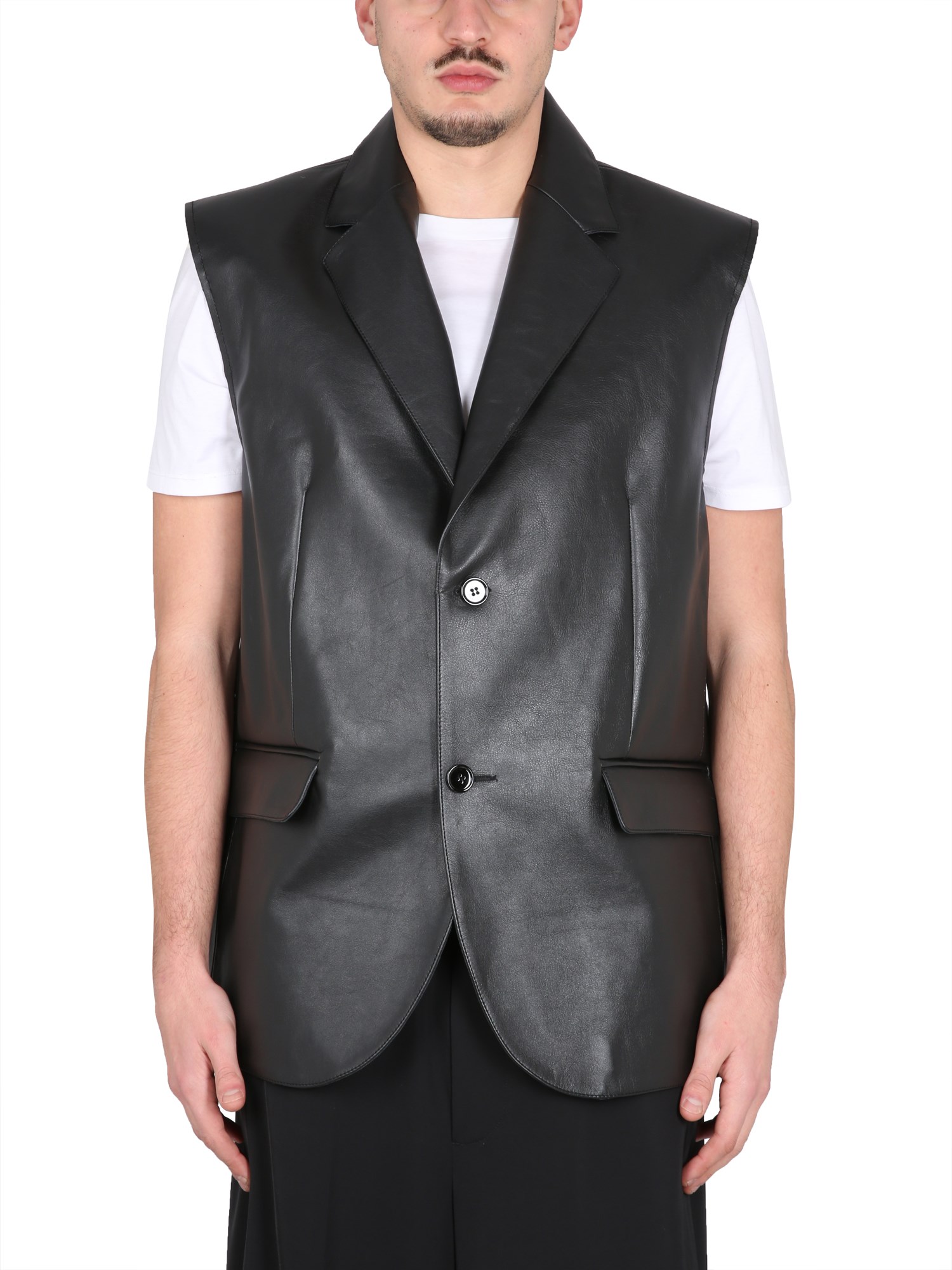 This leather vest from Masion Margiela features a notched lapel with a button closure. It has a sleeveless silhouette with a straight cut, so it can be worn with both business and casual attire. The design is classic and timeless, with just enough detail to make it stand out from the rest.