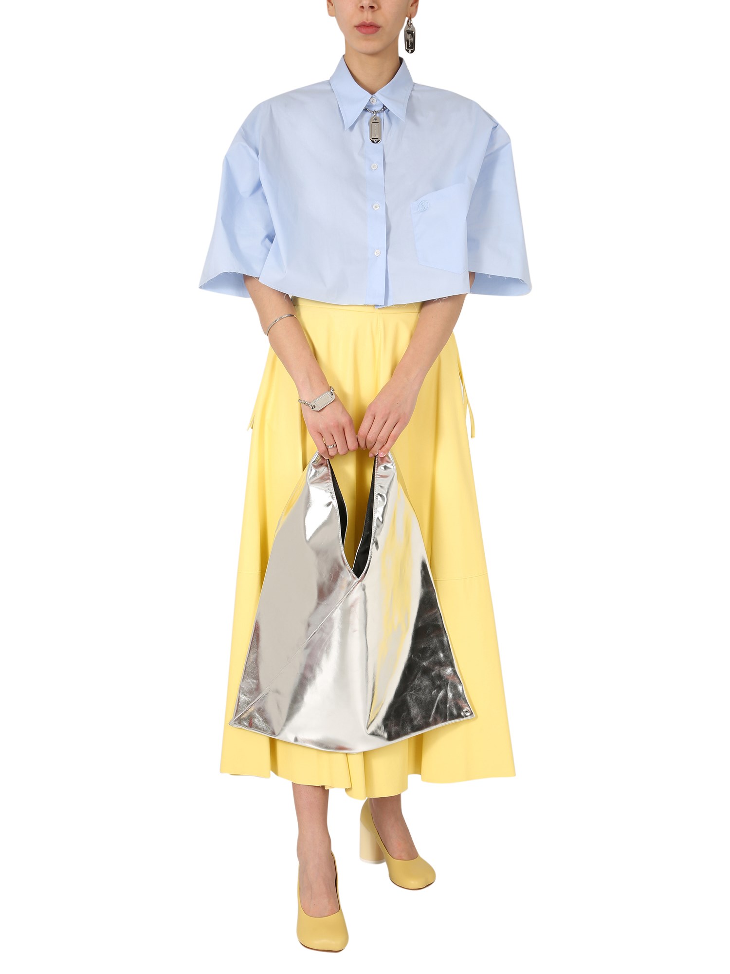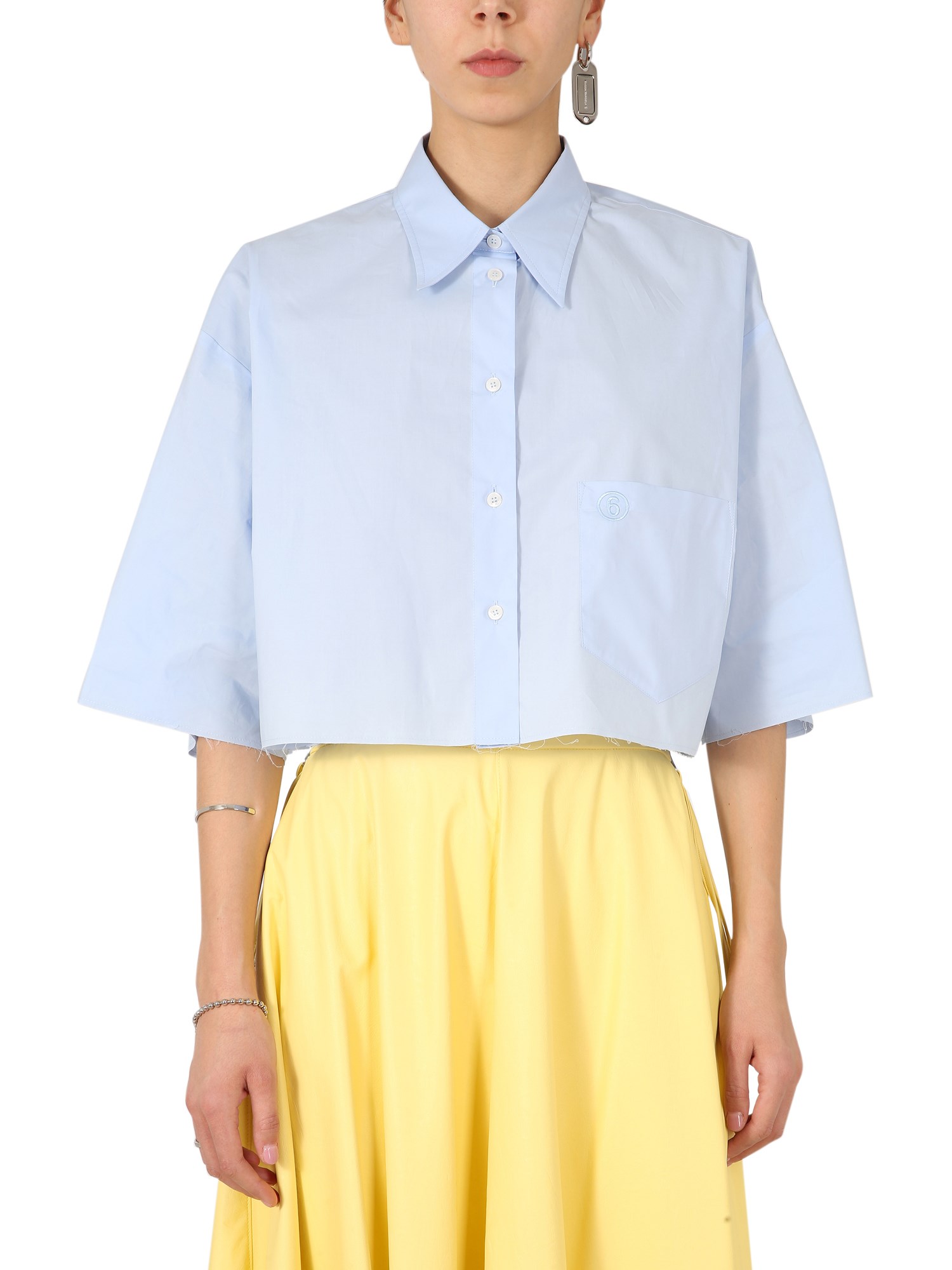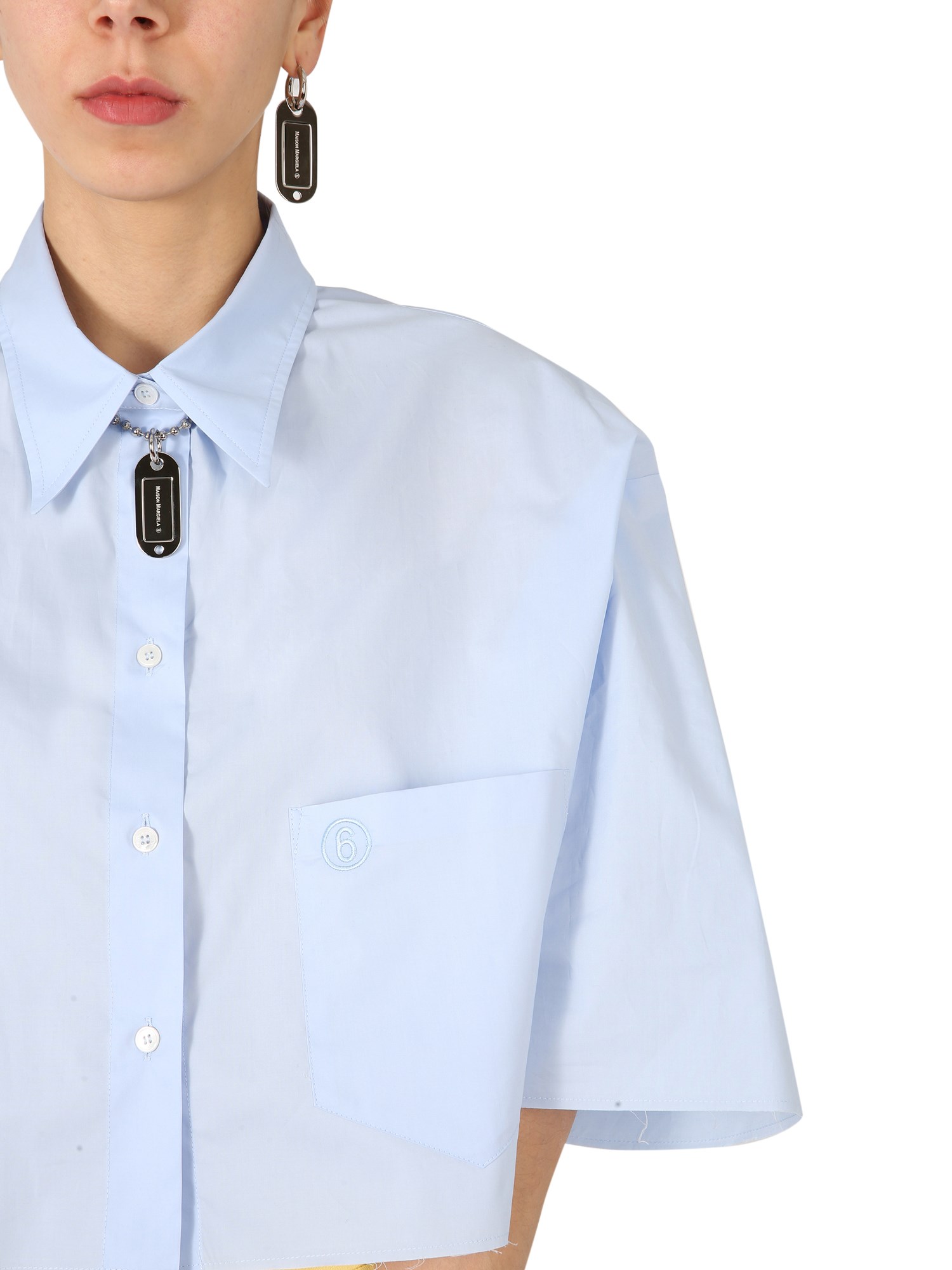 This is a cotton poplin cropped shirt by MM6 Maison Margiela. It is light, breathable, and stretchy. The shirt has a classic collar, front buttoning, and a pocket with an embroidered logo of “6”. The sleeves are 3/4 length and the hemline is cropped. The oversize fit is trendy and shows live-cut profiles.