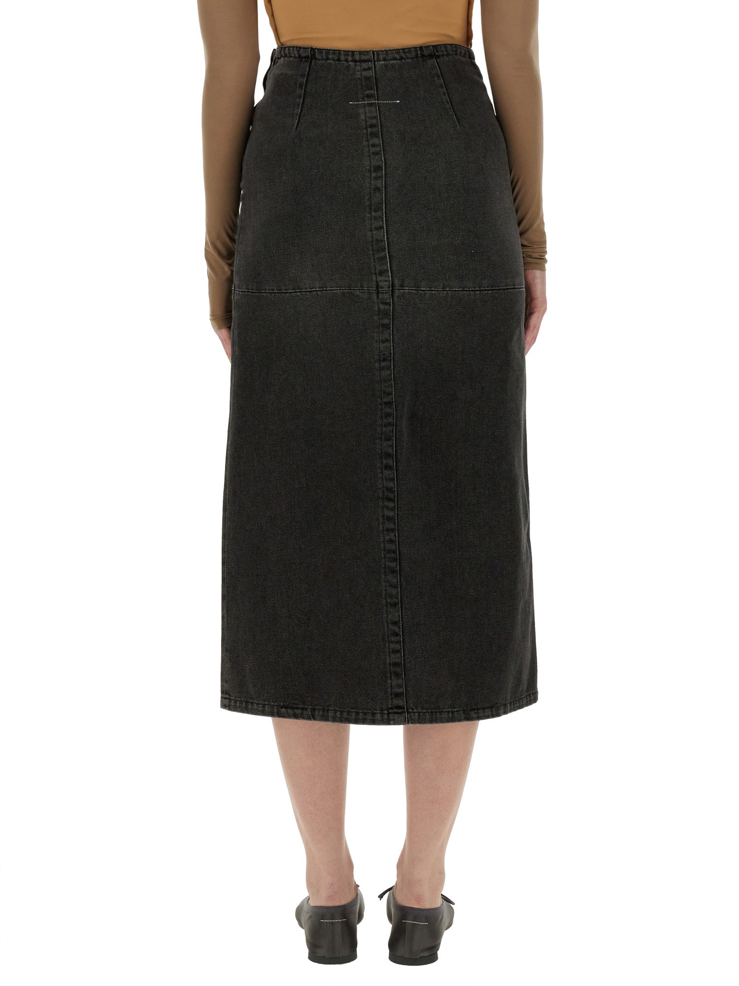 Introducing the cotton blend midi skirt from MM6 Maison Margiela, a versatile addition to your wardrobe. The midi length adds a touch of elegance, making it suitable for both casual and formal occasions. With its timeless design, this skirt features a classic silhouette that flatters all body types. Pair it with a blouse and heels for a chic office look or dress it down with a T-shirt and sneakers for a more relaxed vibe.