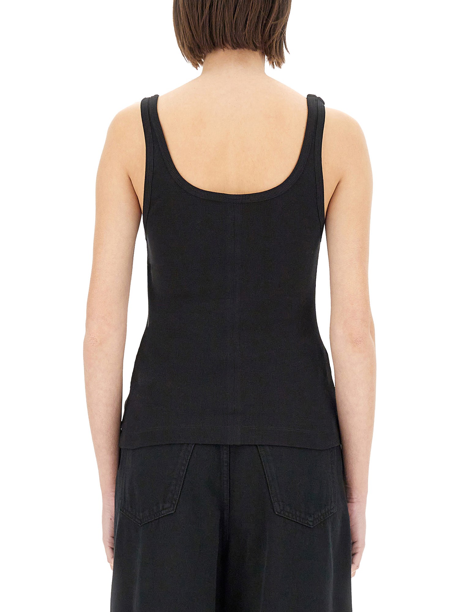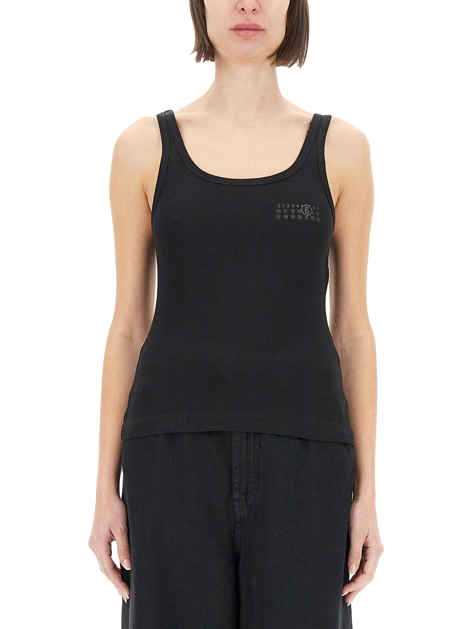 Elevate your casual wardrobe with the MM6 Maison Margiela Logo Tank Top, a perfect blend of style and comfort. Crafted from high-quality materials, this tank top features a striking logo that adds a touch of contemporary flair to any outfit. Its relaxed fit ensures all-day comfort, making it ideal for layering or wearing solo. Whether you're heading to a brunch or a night out, this versatile piece effortlessly transitions from day to night, making it a must-have addition to your collection. Embrace modern elegance and make a statement with this chic tank top.