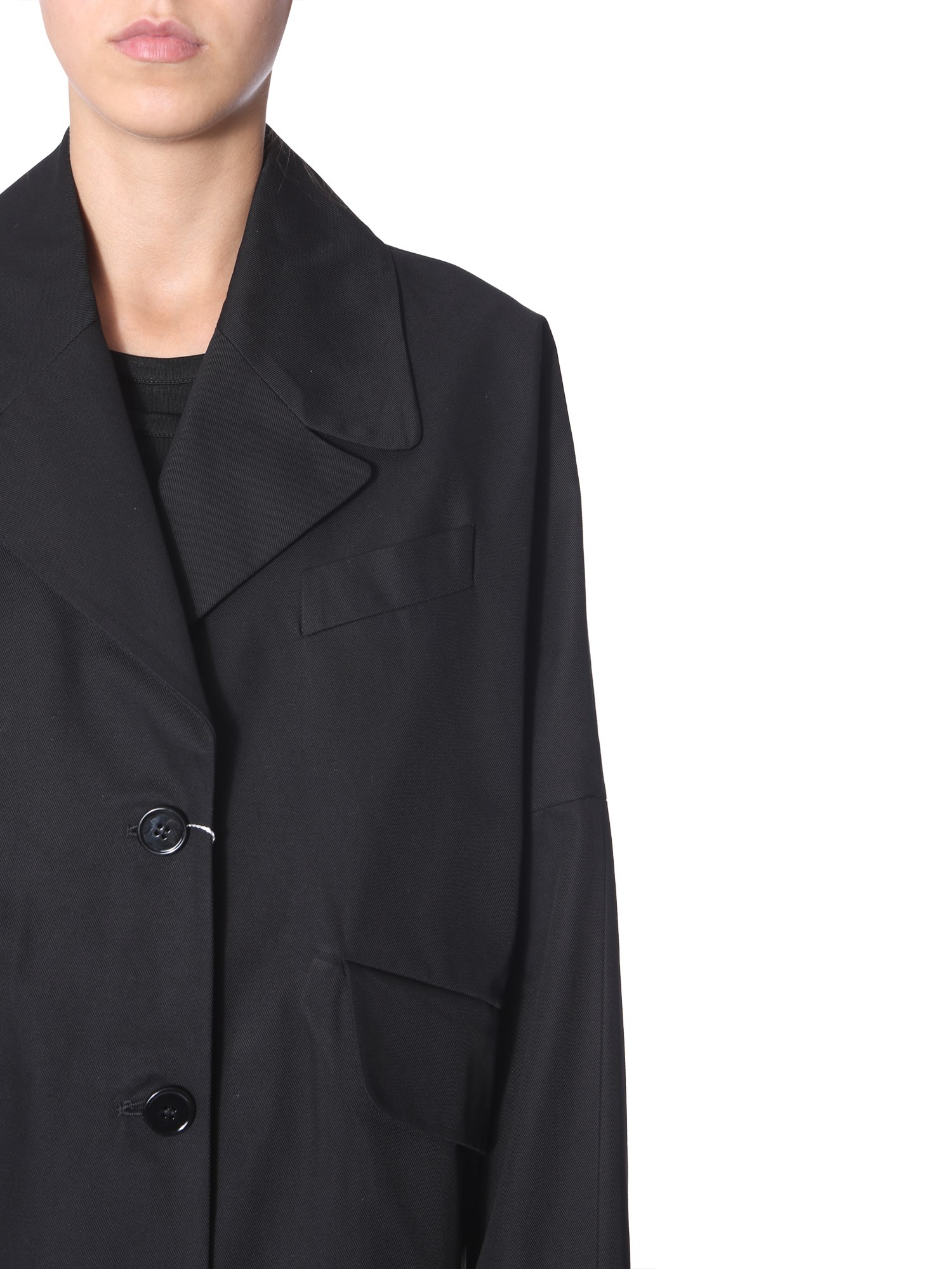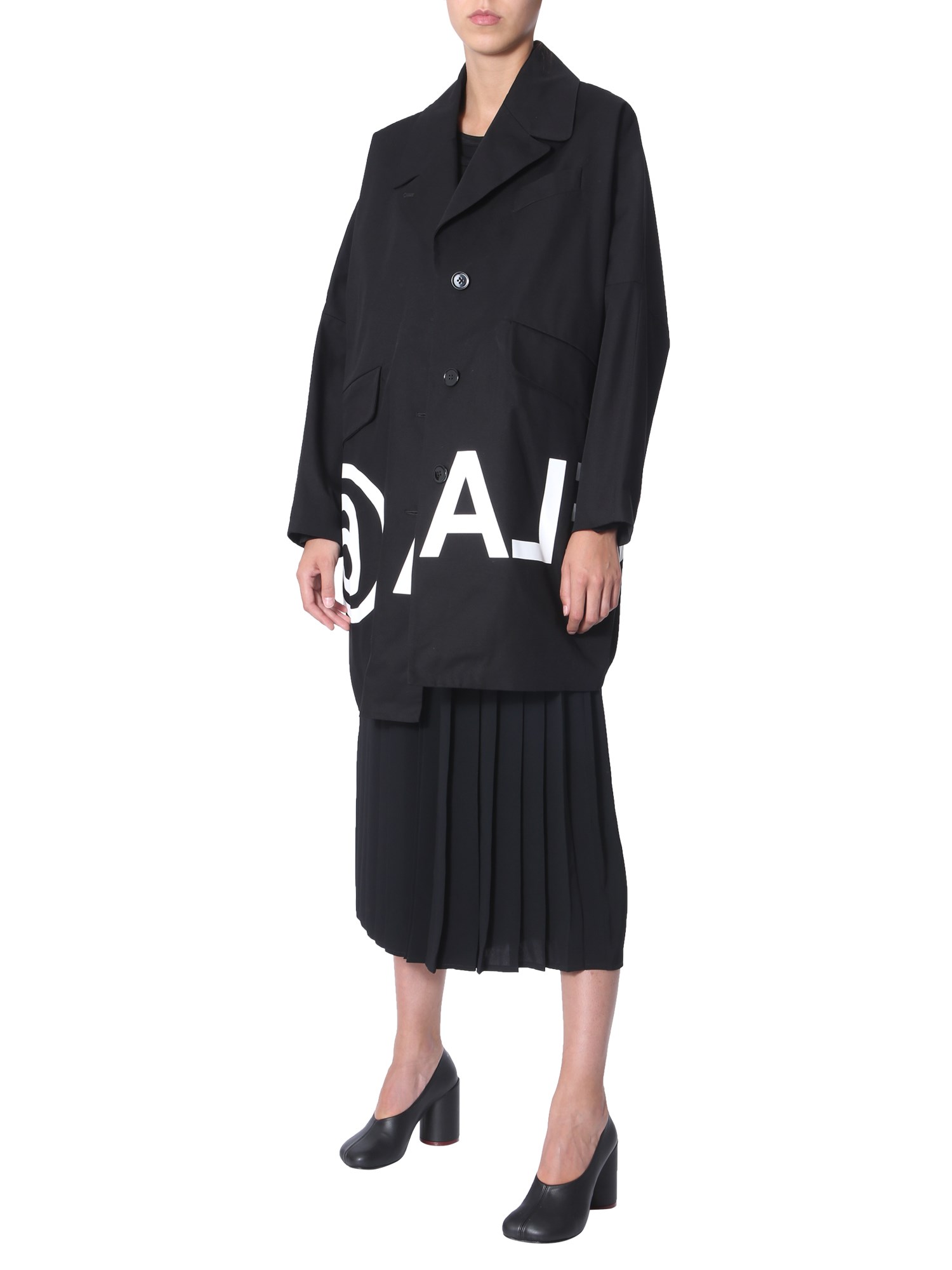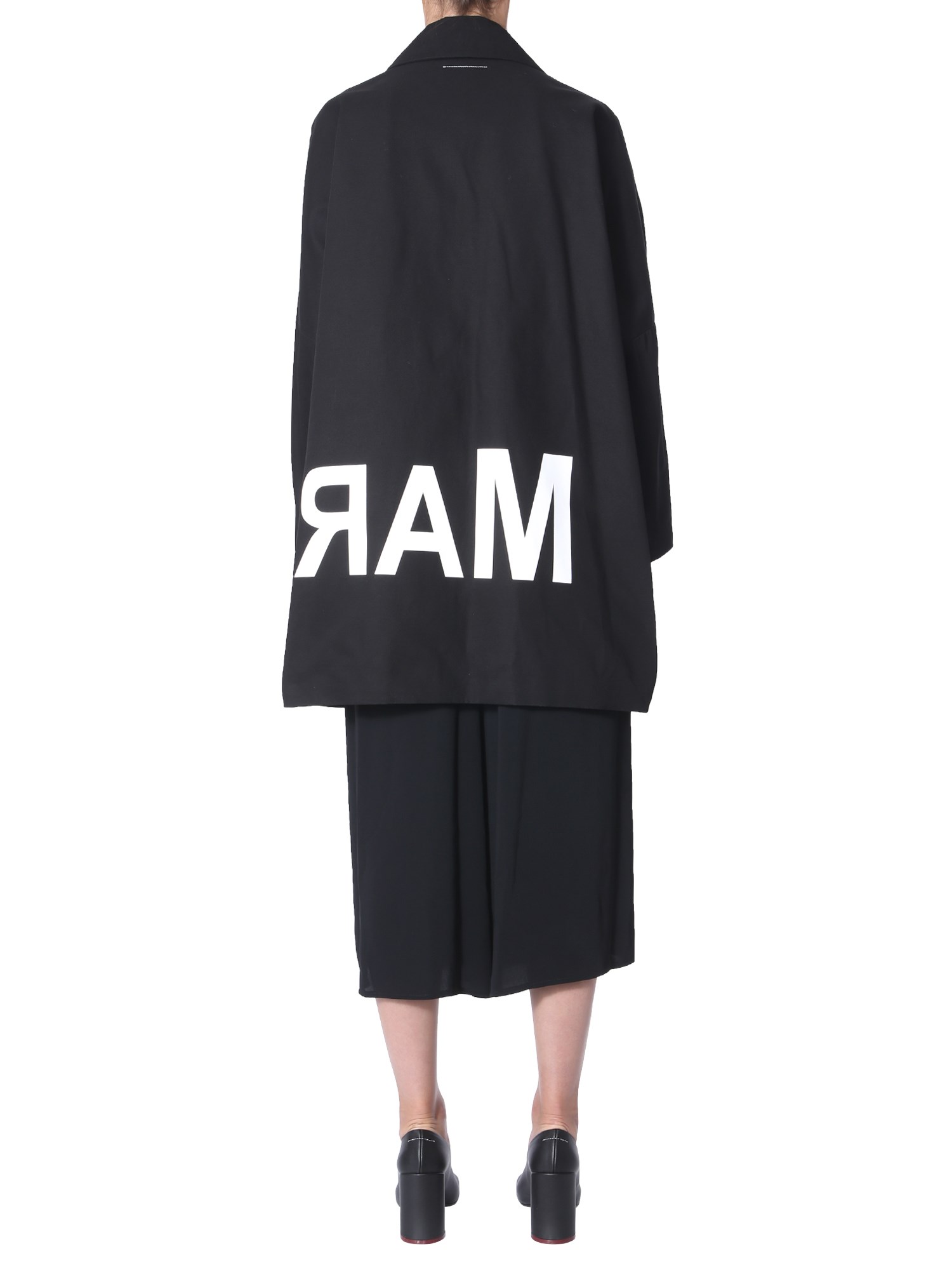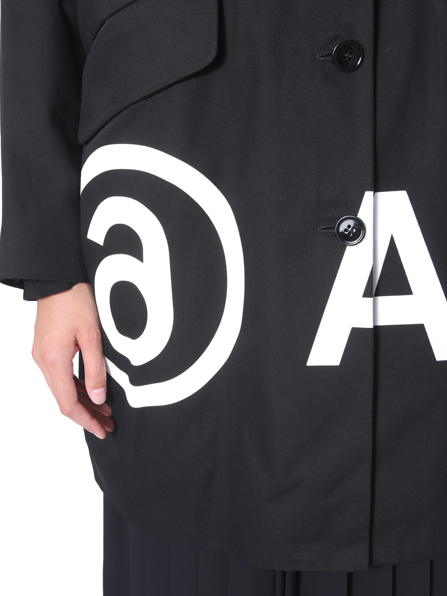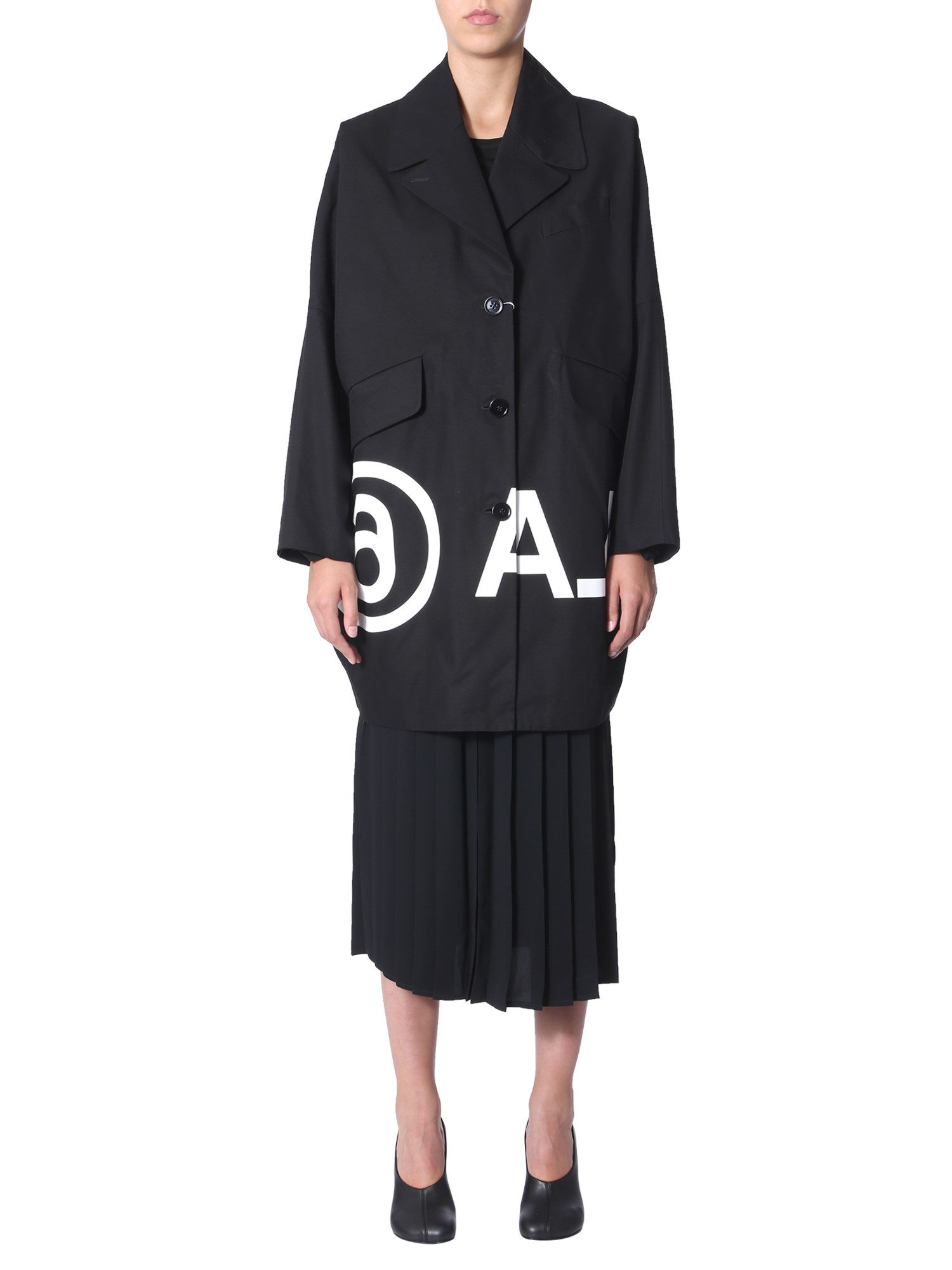 Keep the winter ensemble stylish and warm with this coat with logo from MM6 Maison Margiela. The coat has a classic notched lapel front with two oblique pockets for a unique touch. This oversized fit coat has a minimalist design which is perfect for official meetings and events. You can style it with bellbottom pants and high heels to look your best.