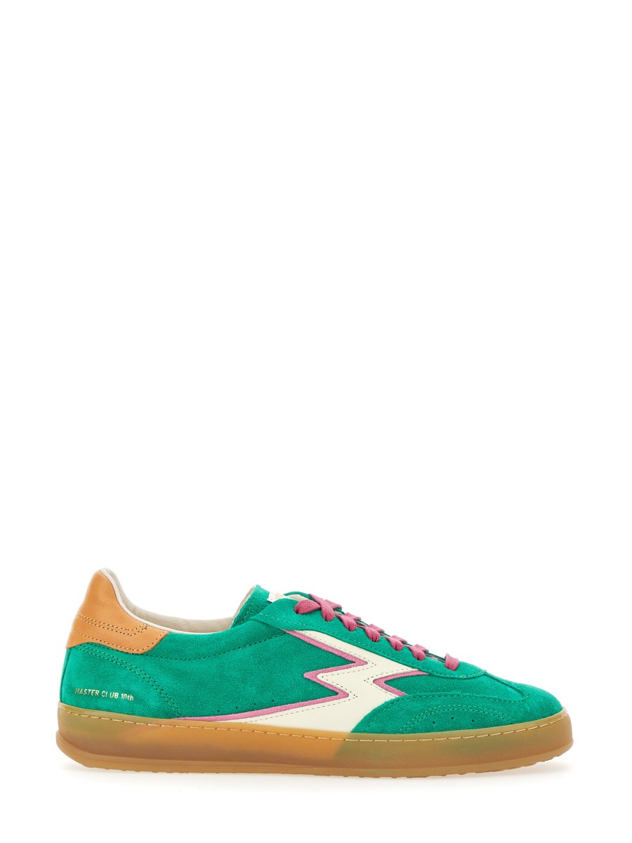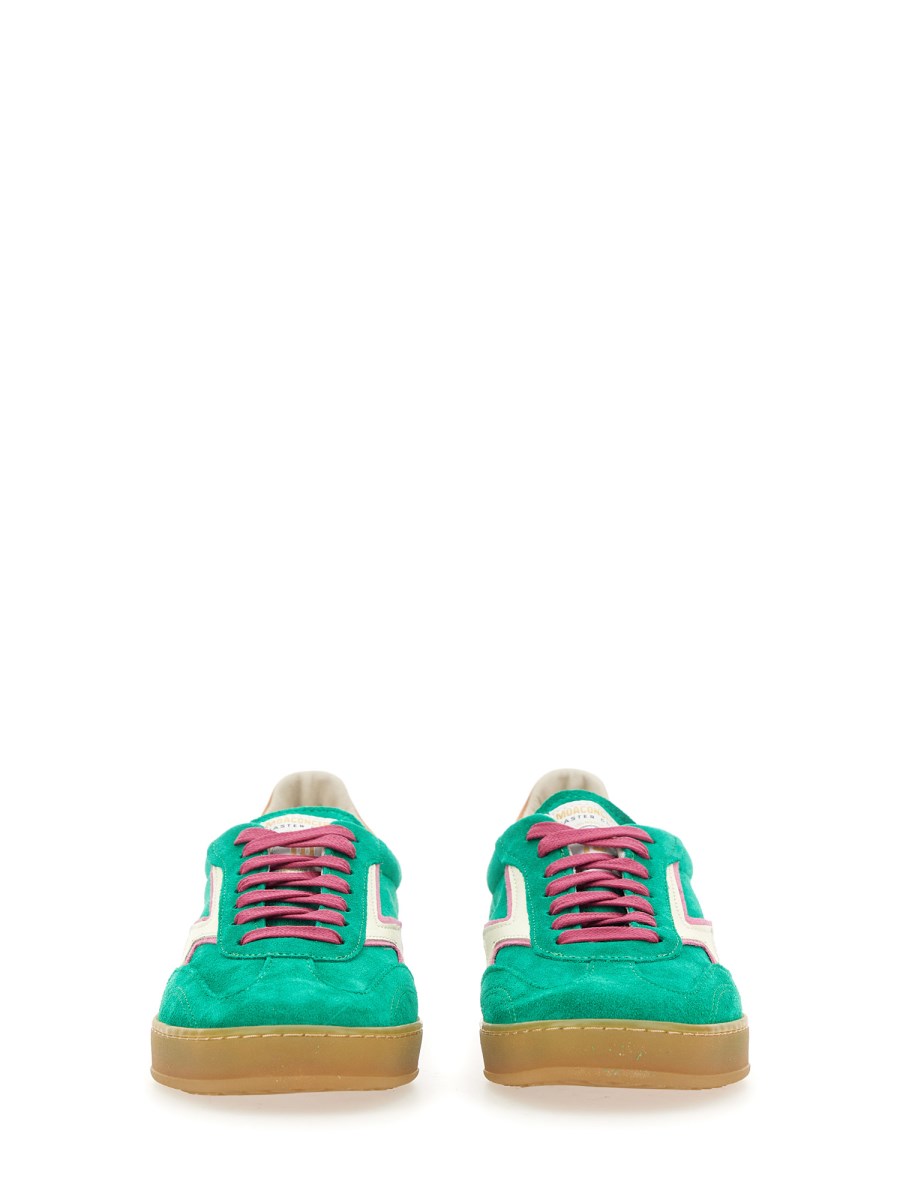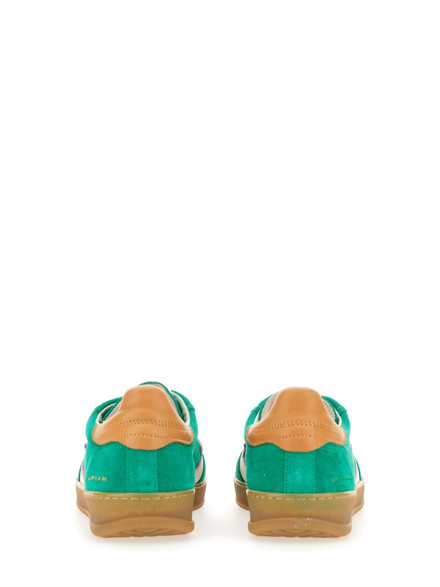 Discover these exquisite women's sneakers crafted in Italy, featuring an elegant emerald green suede upper. The sneakers showcase the iconic MOACONCEPT logo on the side in off-white leather with raspberry suede profiles. They also include a stylish tan leather backtab and raspberry-colored cotton flat laces. The perforated suede tongue is adorned with an off-white label embroidered in gold, celebrating the 10th ANNIVERSARY. For added comfort, you'll find a light gray leather lining and a cream-colored leather insole with an imprinted logo. These sneakers are grounded by a honey sole, measuring 3.4 mm in height, and offer a regular fit for your everyday wear.