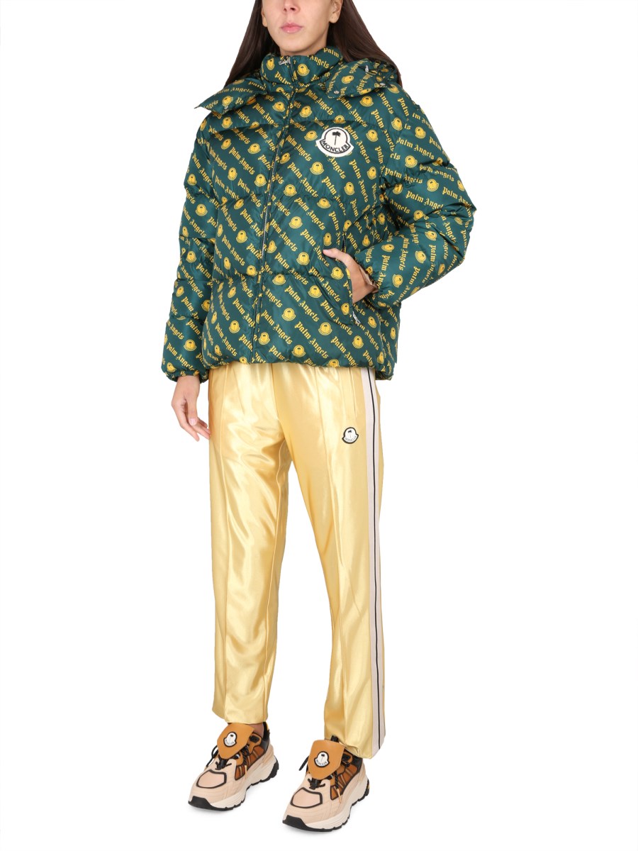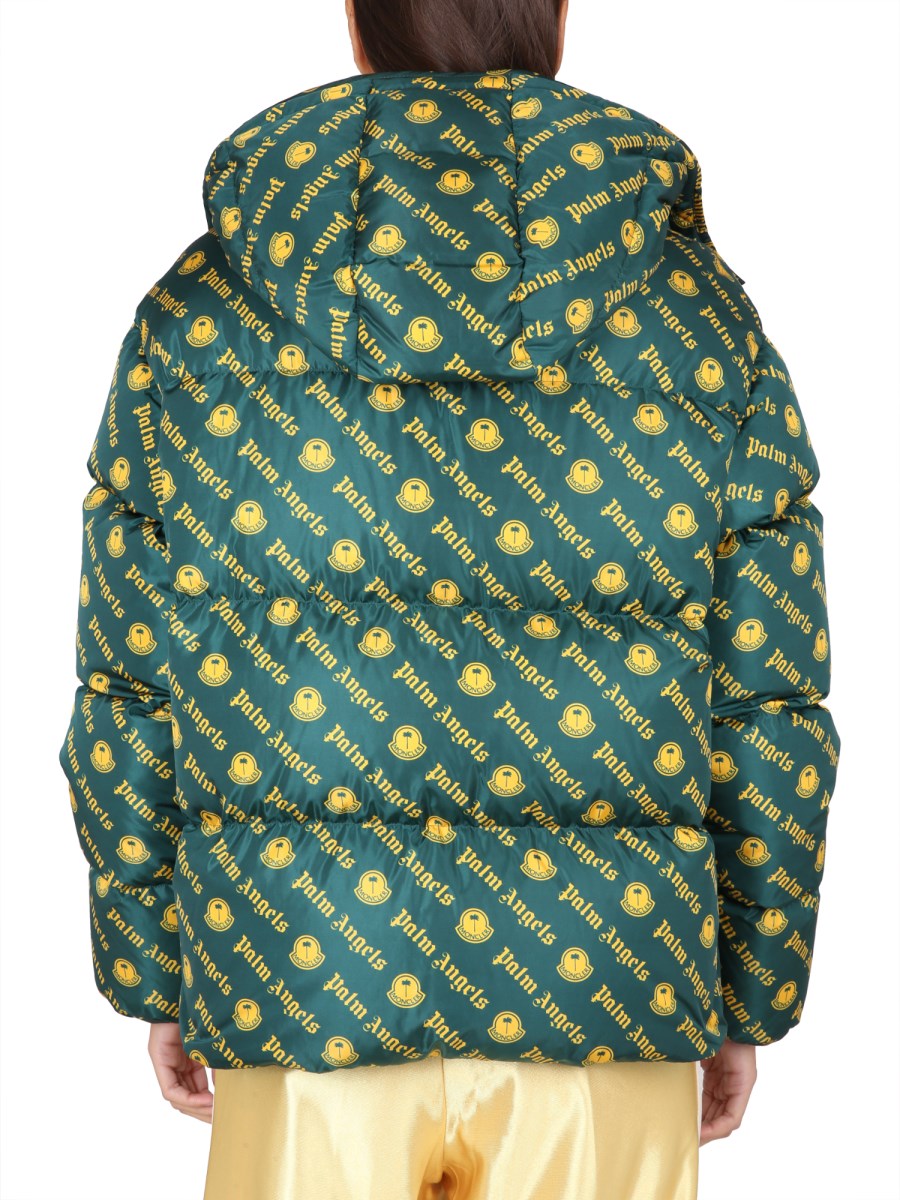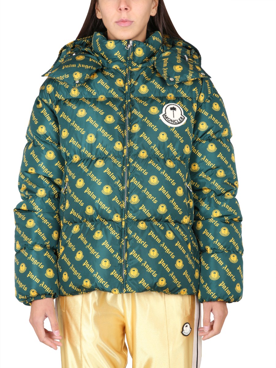 A cocooning design, the Thompson down jacket comes in a loose fit and is enhanced with a large, down-filled hood. Crafted from nylon technique, the short puffer boasts an all-over, diagonal print boasting the Moncler Genius collaboration logo. The jacket boasts an internal Palm Angels® label depicting a field hockey pitch.