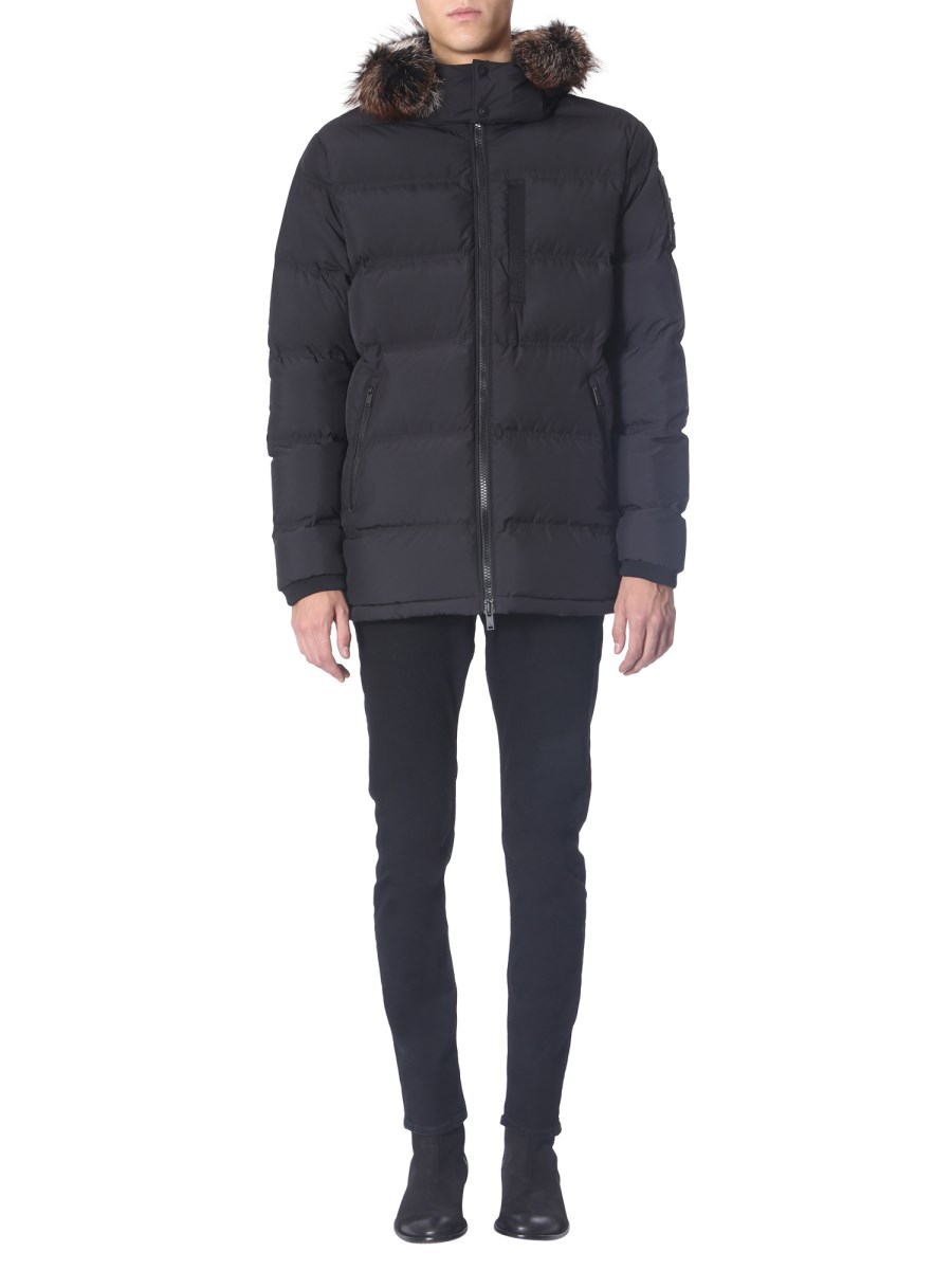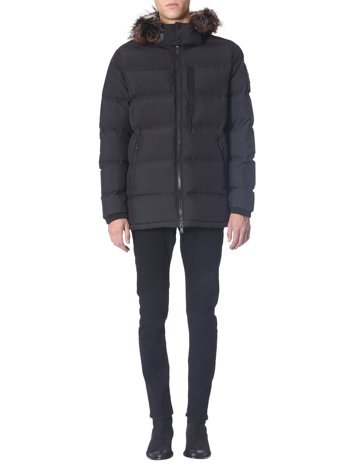 Enhance your look with the Southdale jacket from Moose Knuckles that also has a furry, hooded neckline. The tufted assembly of this jacket includes a polyester cover with birds’ feather padding for maximum insulation during cold weathers. The front is secured with a zip closure ending on two pressure buttons on the neck.