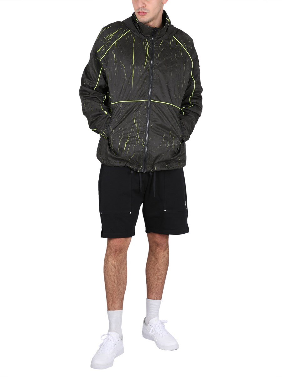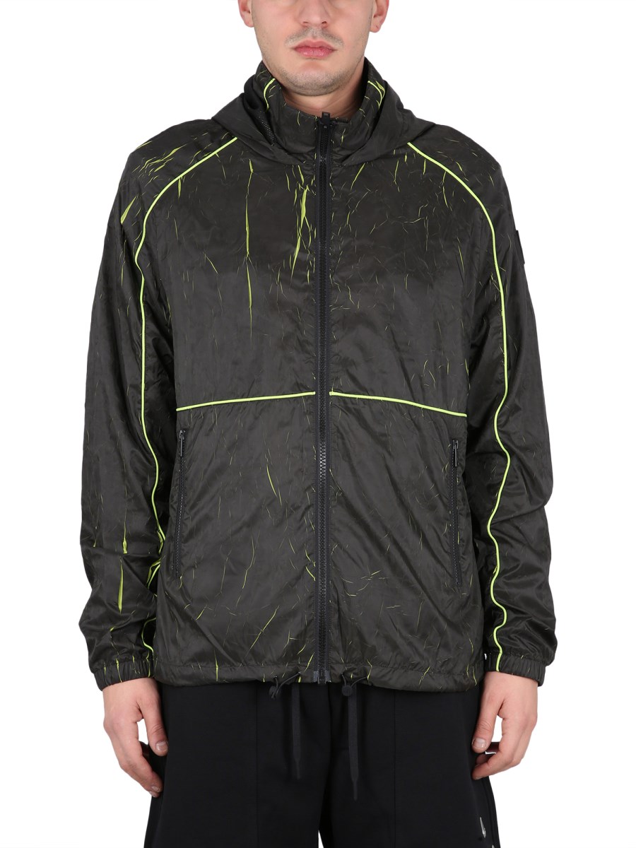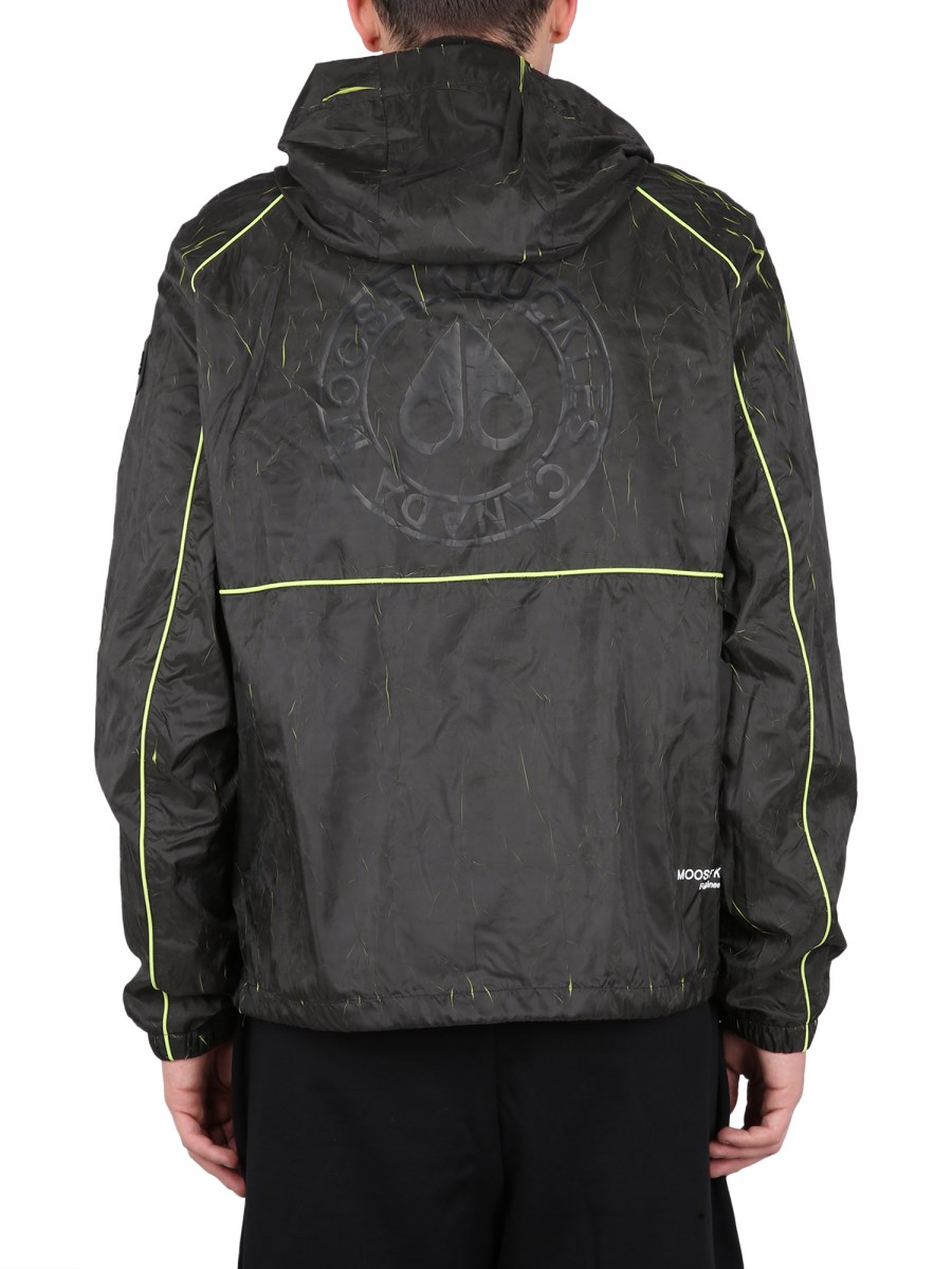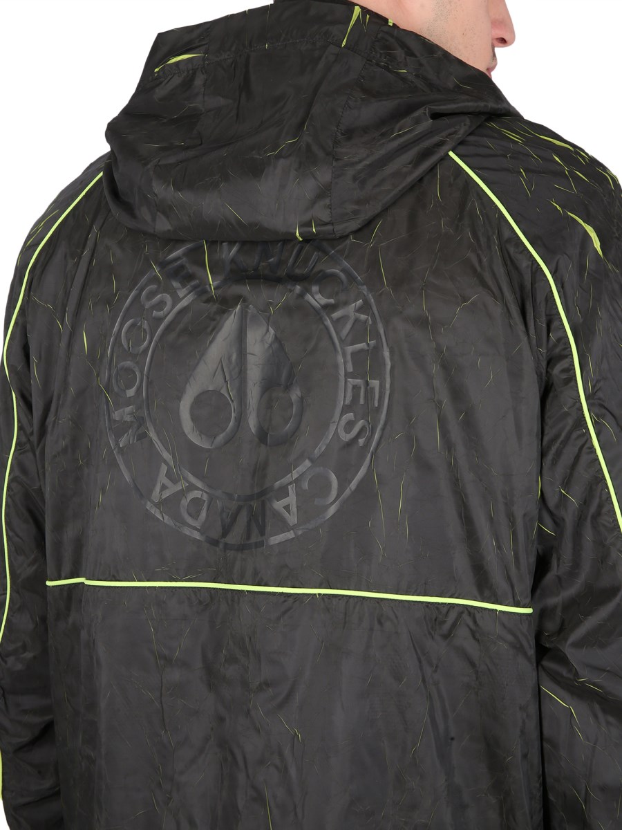 This black jacket from Moose Knuckles is ideal for cold weather with its lightweight and soft material. With a high neck and hood, this jacket is designed for protection. It is made from polyamide, a lightweight material that is tough and durable. The jacket features fluo inlays that make the jacket pop.