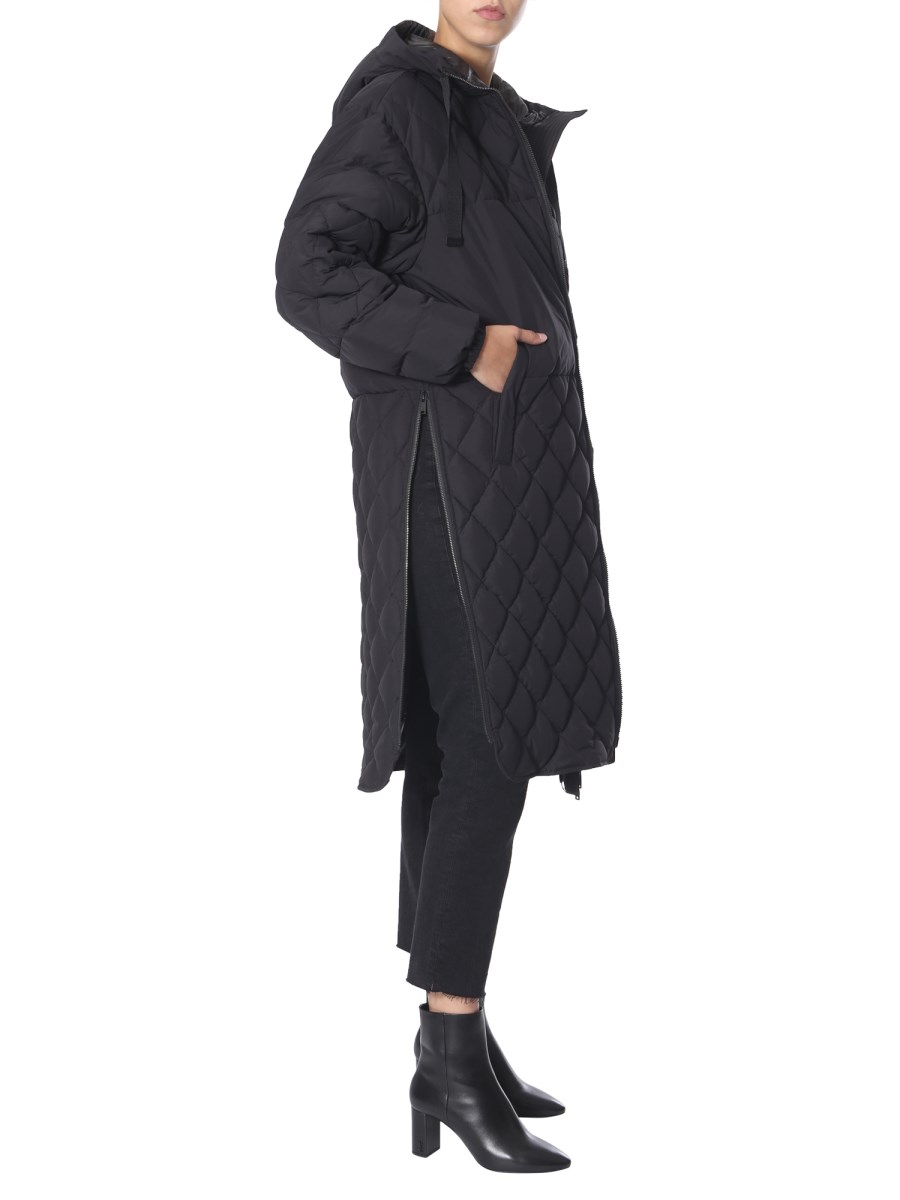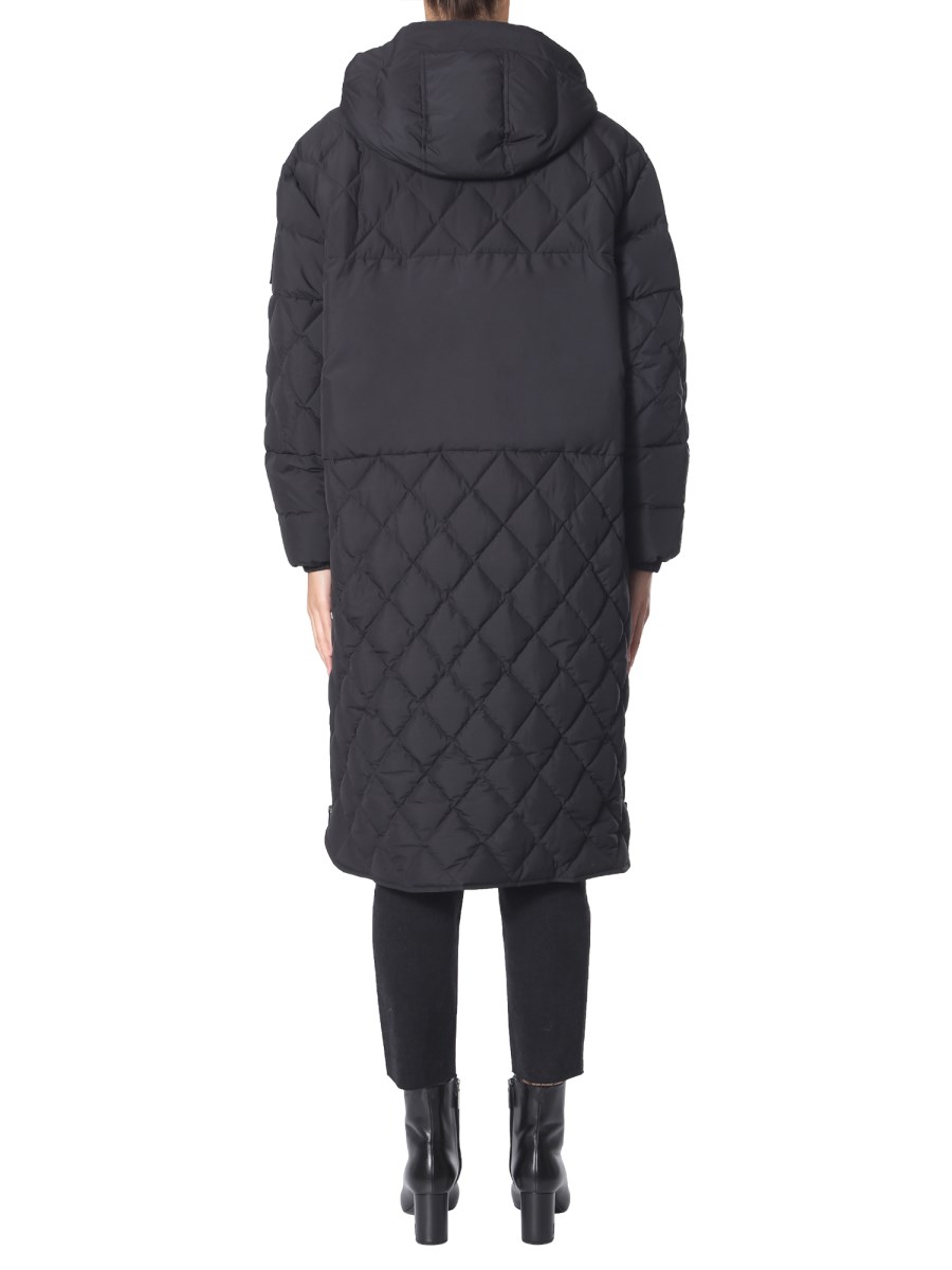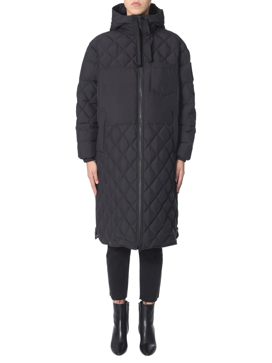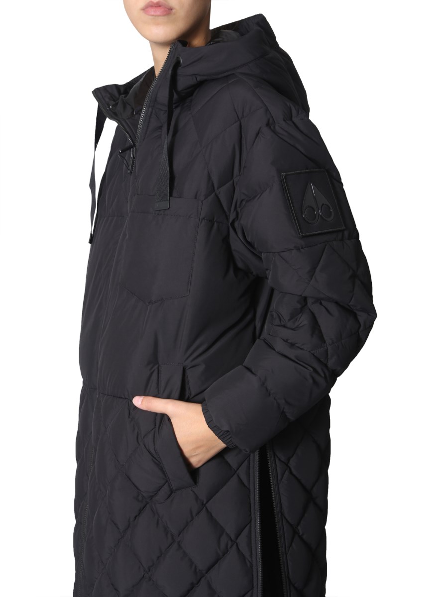 This Marquis jacket from Moose Knuckles has an all-quilted assembly for maximum protection against cold. It presents a unique structure with an elongated hooded neckline and side slits with a zip closure. The hood is secured with flat laces while the pockets at both sides and chest are taped for security purposes.