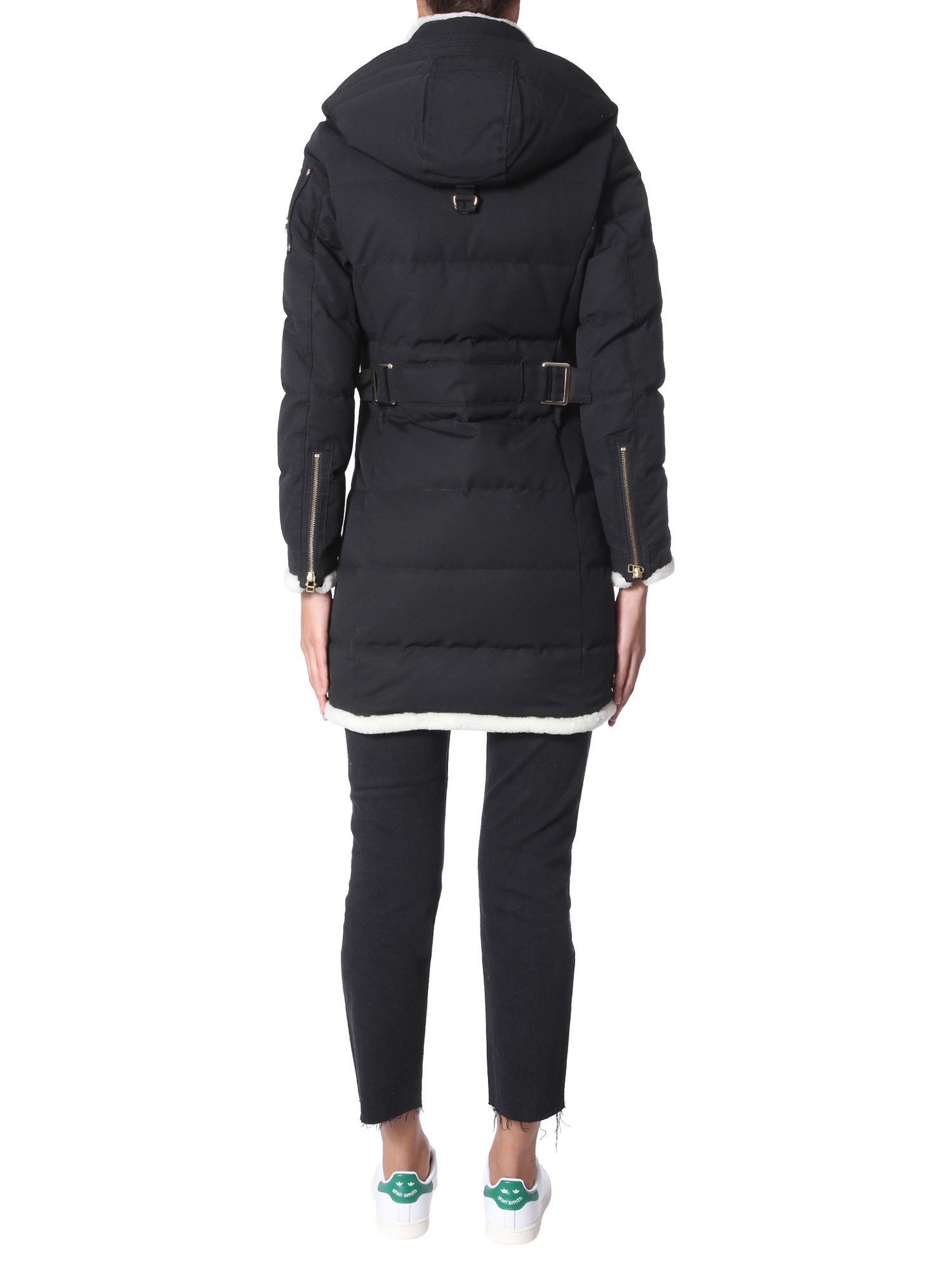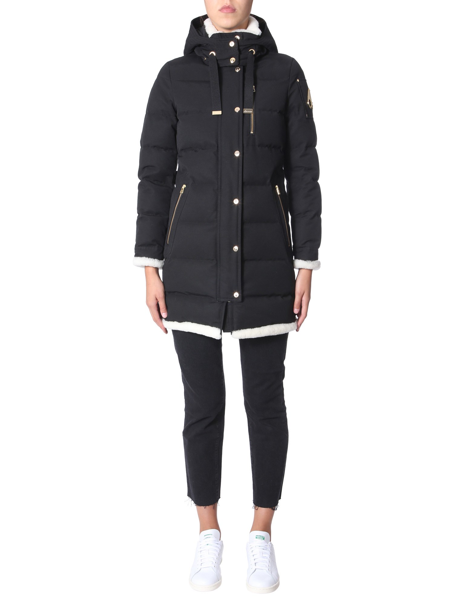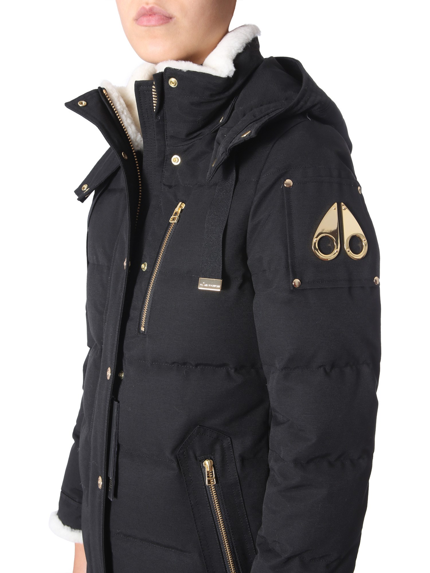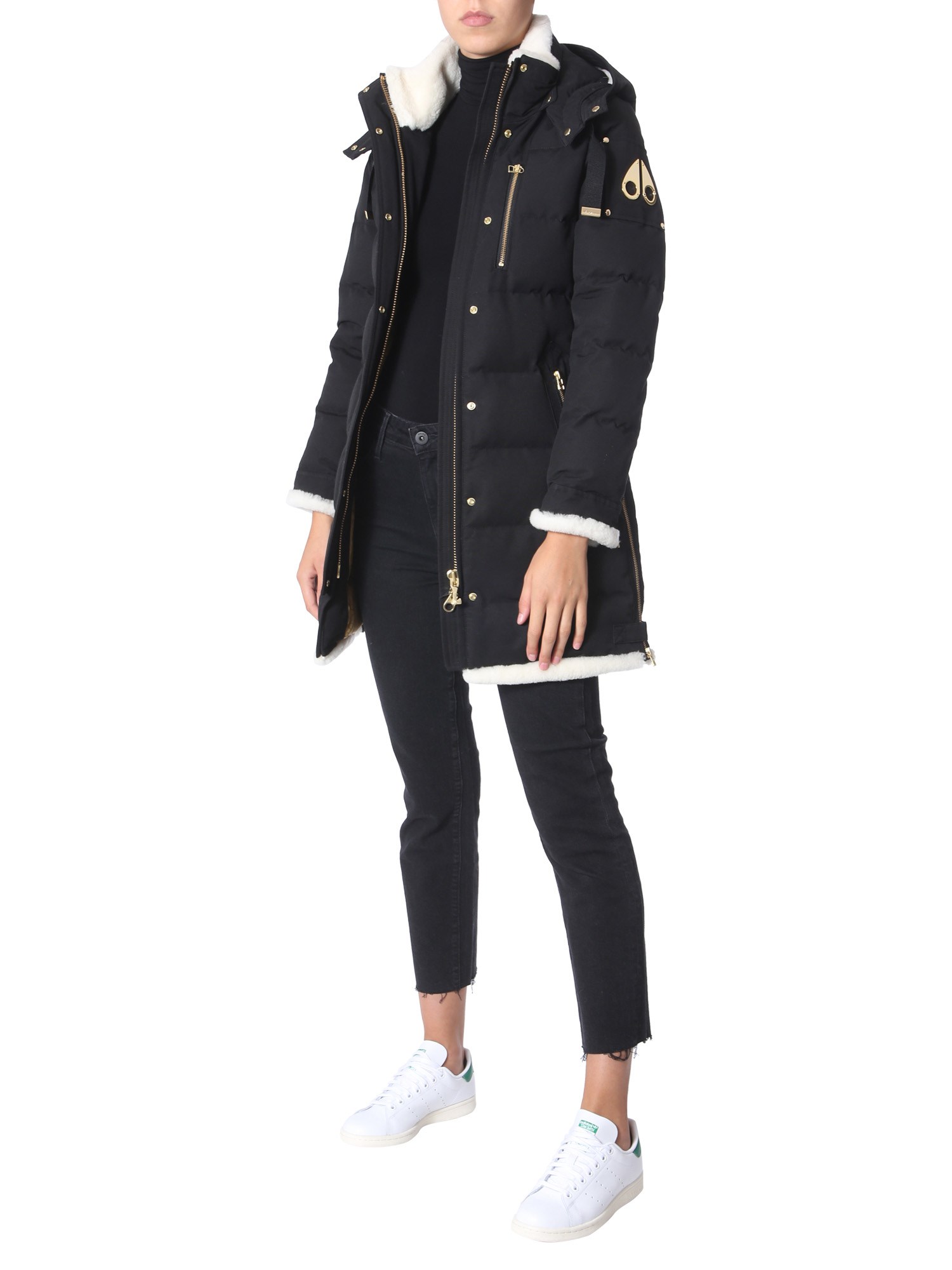 The Mont Joli parka by Moose Knuckles is what you need this season for protection against wind and cold weather. This parka jacket has shearling detailing, hooded high neck, and zip with pressed buttons closure. It includes four front and two inner pockets to keep all the essentials safe. Made with a blend of cotton and nylon, the parka is a must-have this season.