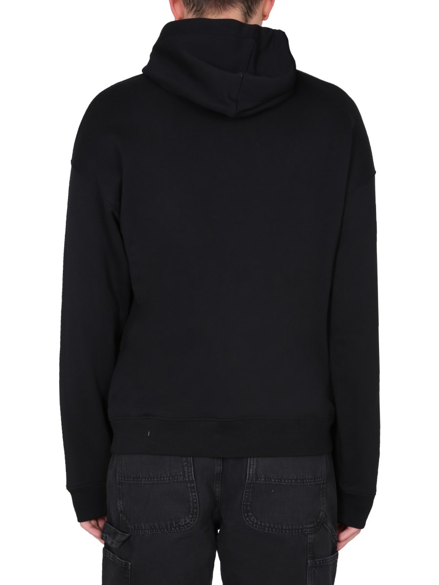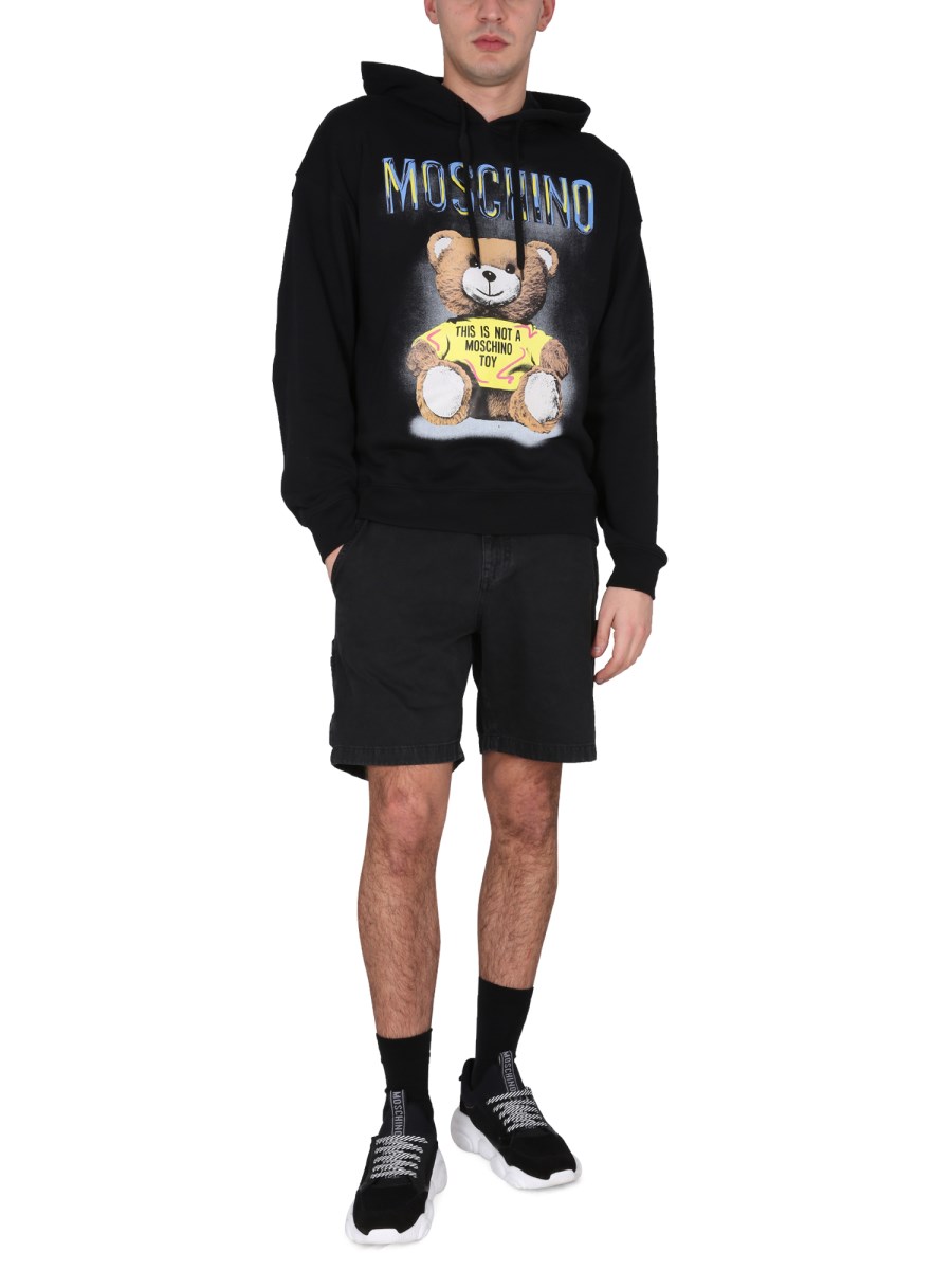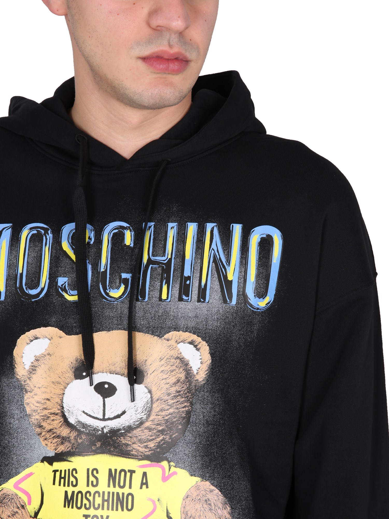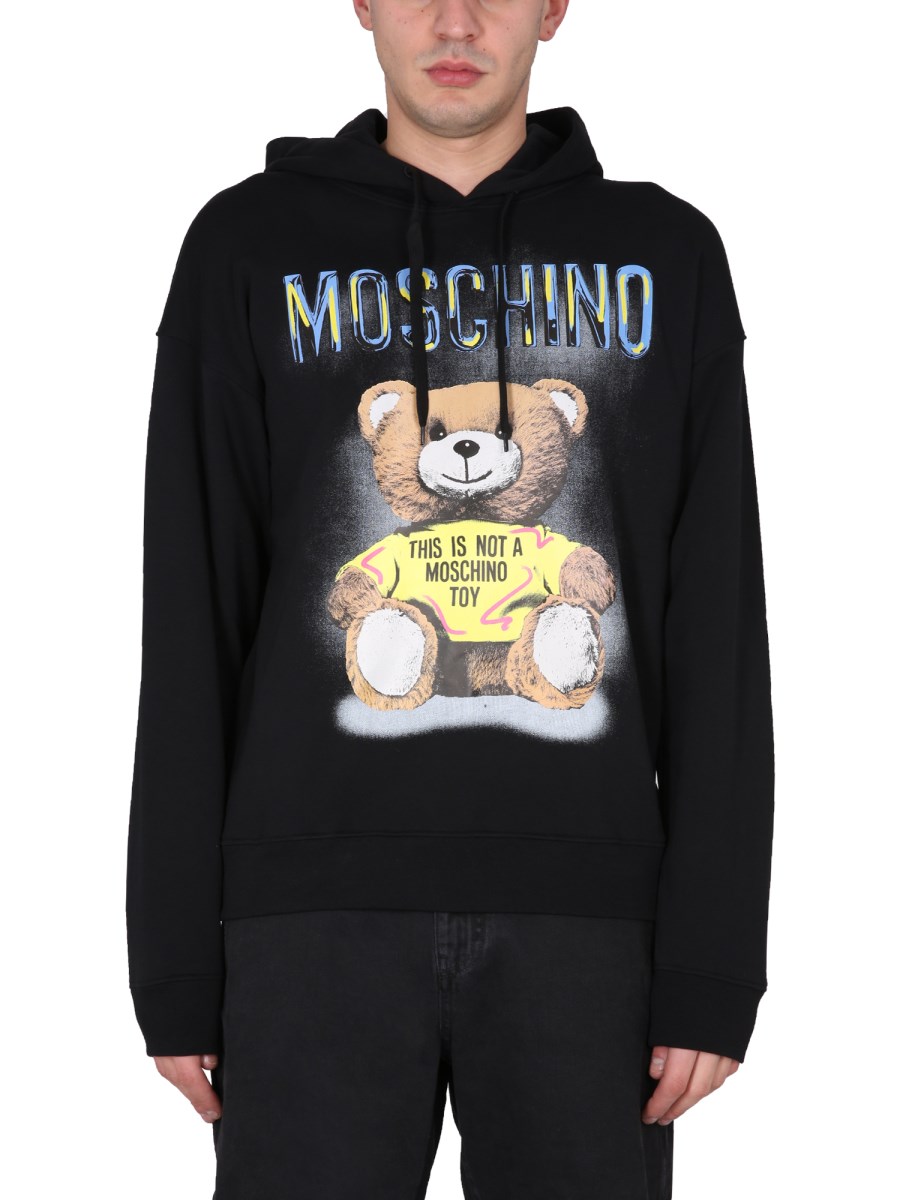 It's the perfect piece for lounging, sleeping, or just hanging out with friends. With a drawstring hood, frontal teddy print, and one pouch pocket, this sweatshirt from Moschino is comfortable and chic. The cotton material is very comfortable and allows for the wearer to enjoy the weather.