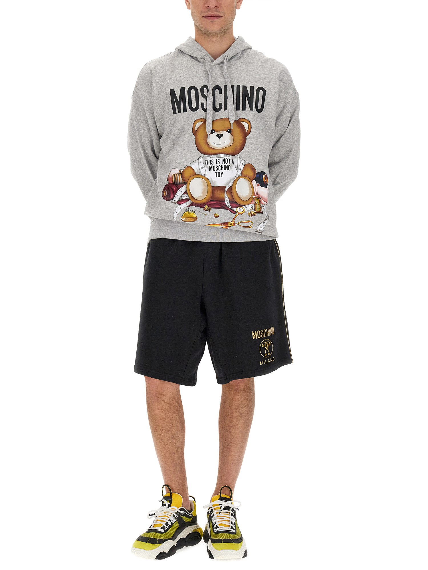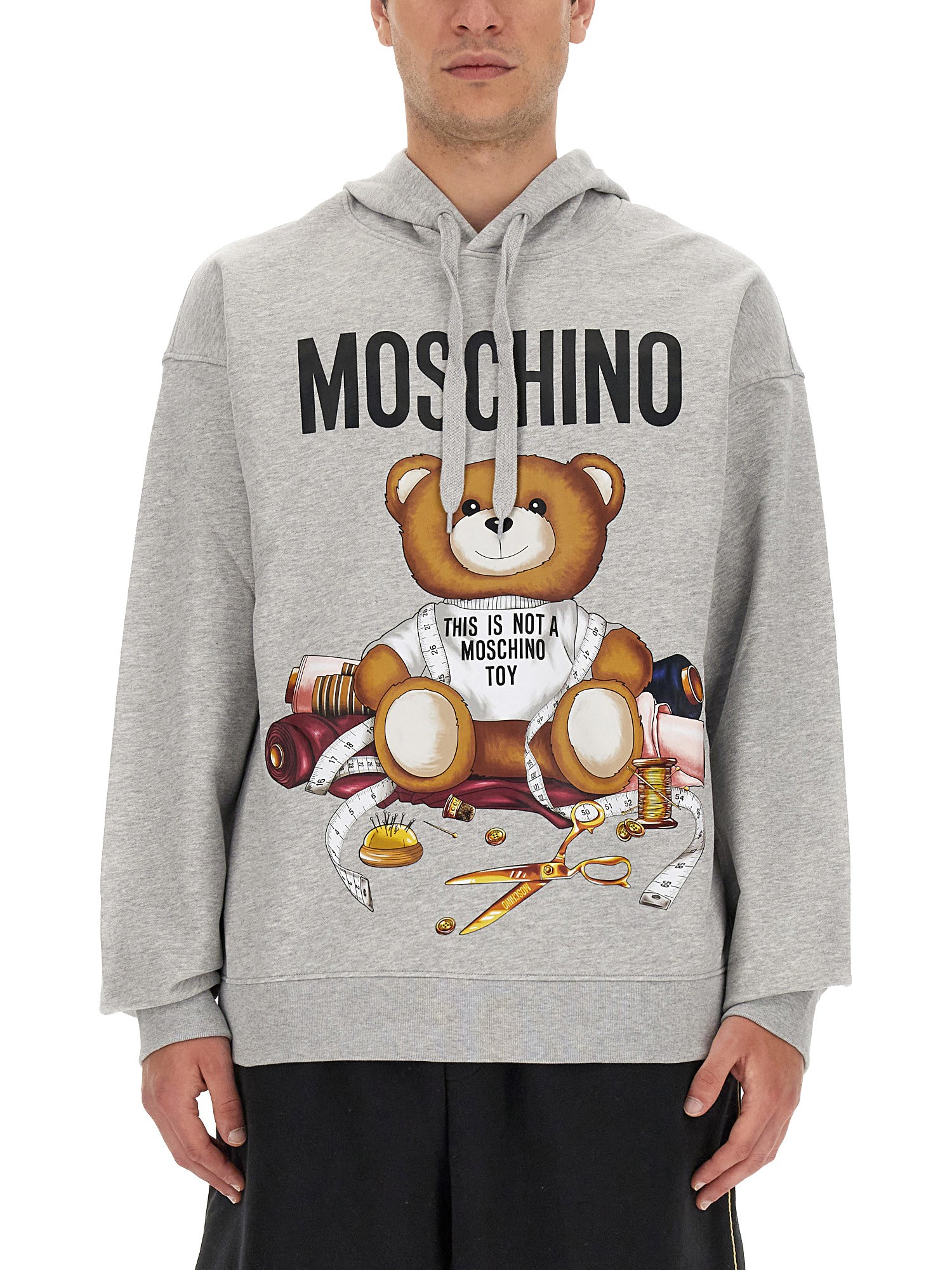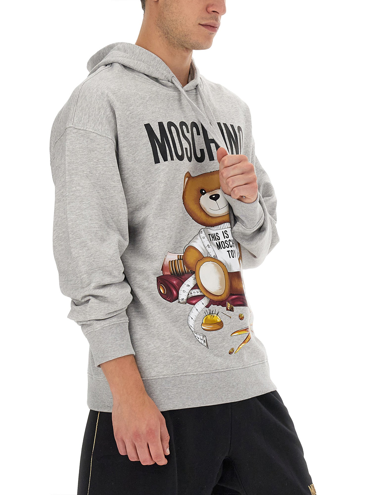 This is a great sweatshirt from Moschino that can be worn as a casual or a work outfit. It features a drawstring hood, front teddy print, one pouch pocket and a signature Moschino style. The material is cotton and the design is adorable. This drawstring hoodie is the perfect casual choice for all your fall days.