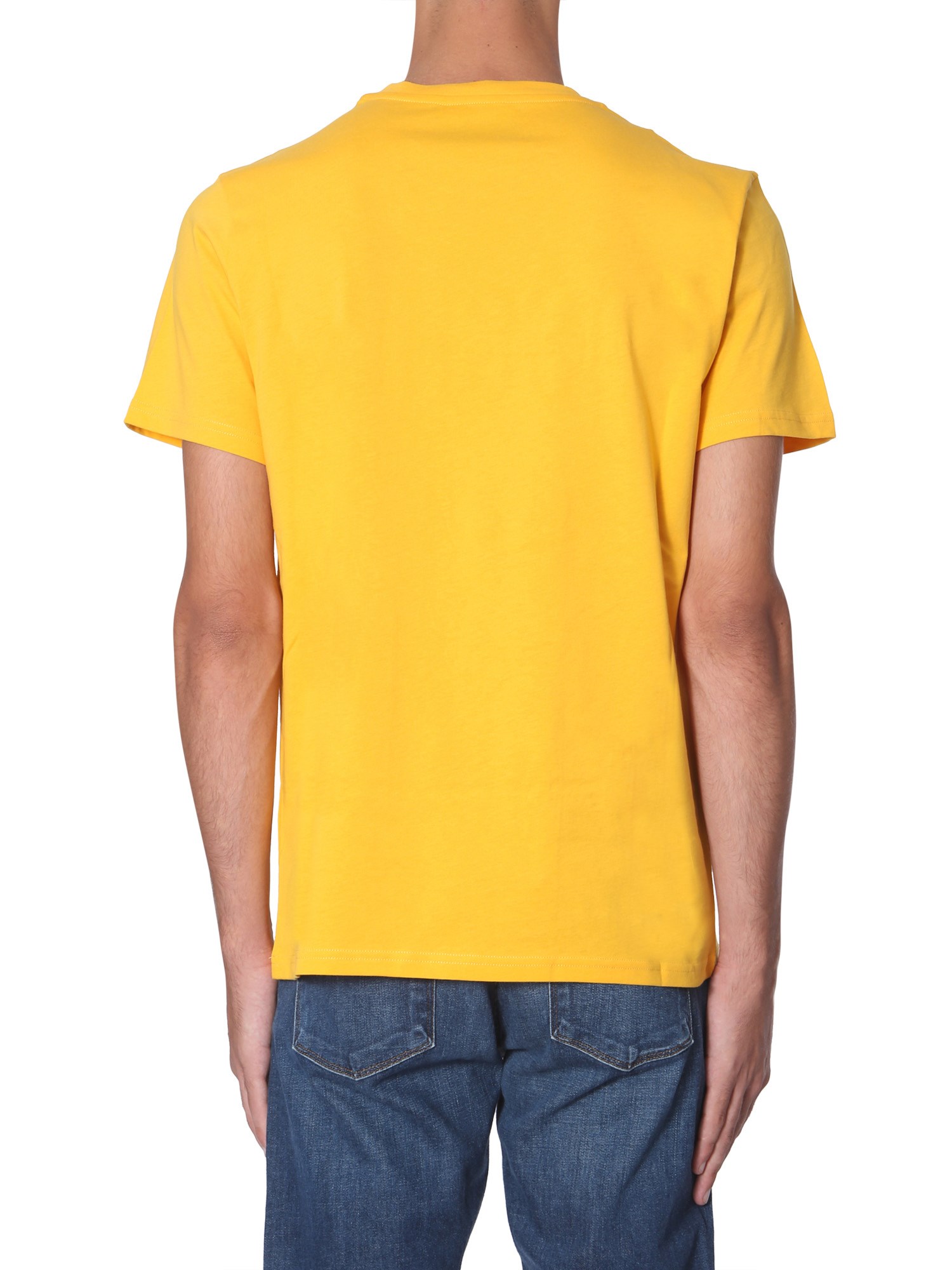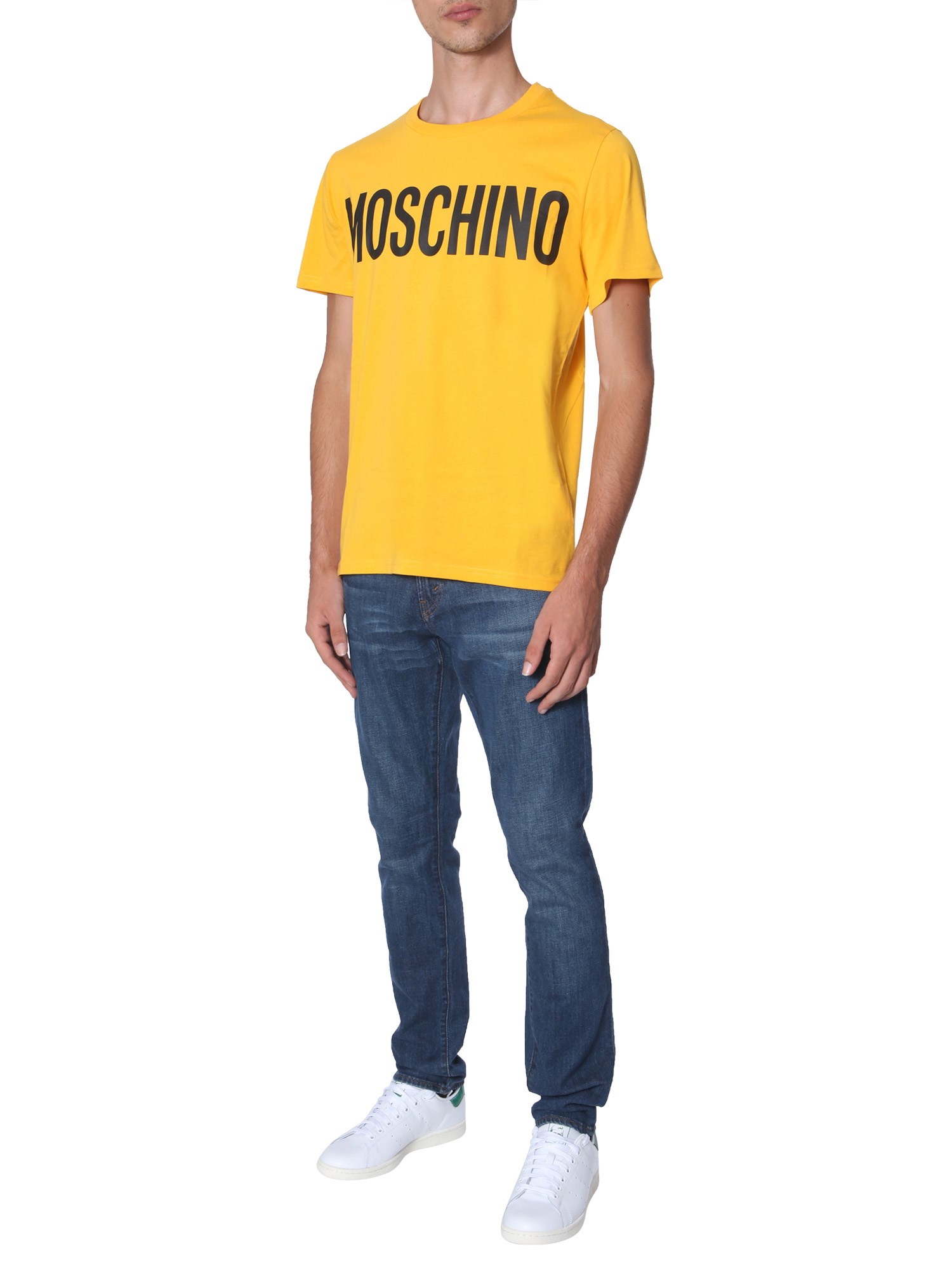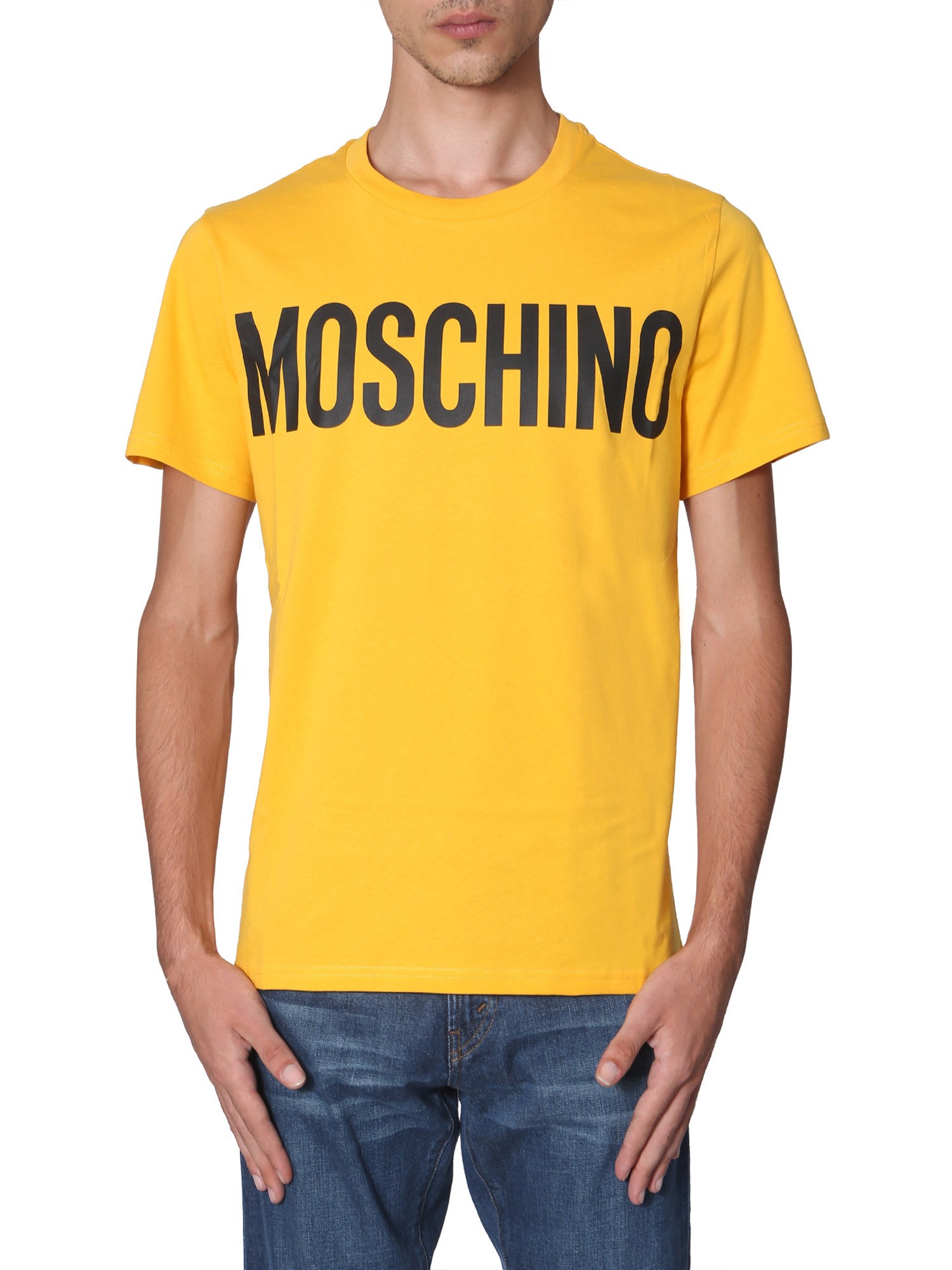 Add a splash of summery colour to your wardrobe with this round neck T-shirt from Moschino. It is designed from fine quality cotton that makes it ideal for summer season. The iconic branding is printed on the front with contrasting colours that aptly complements its funky and vibrant shade.