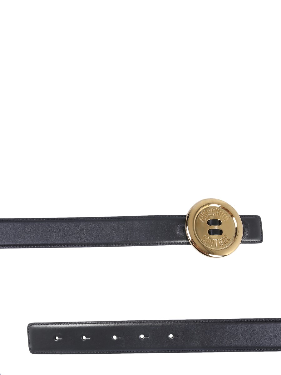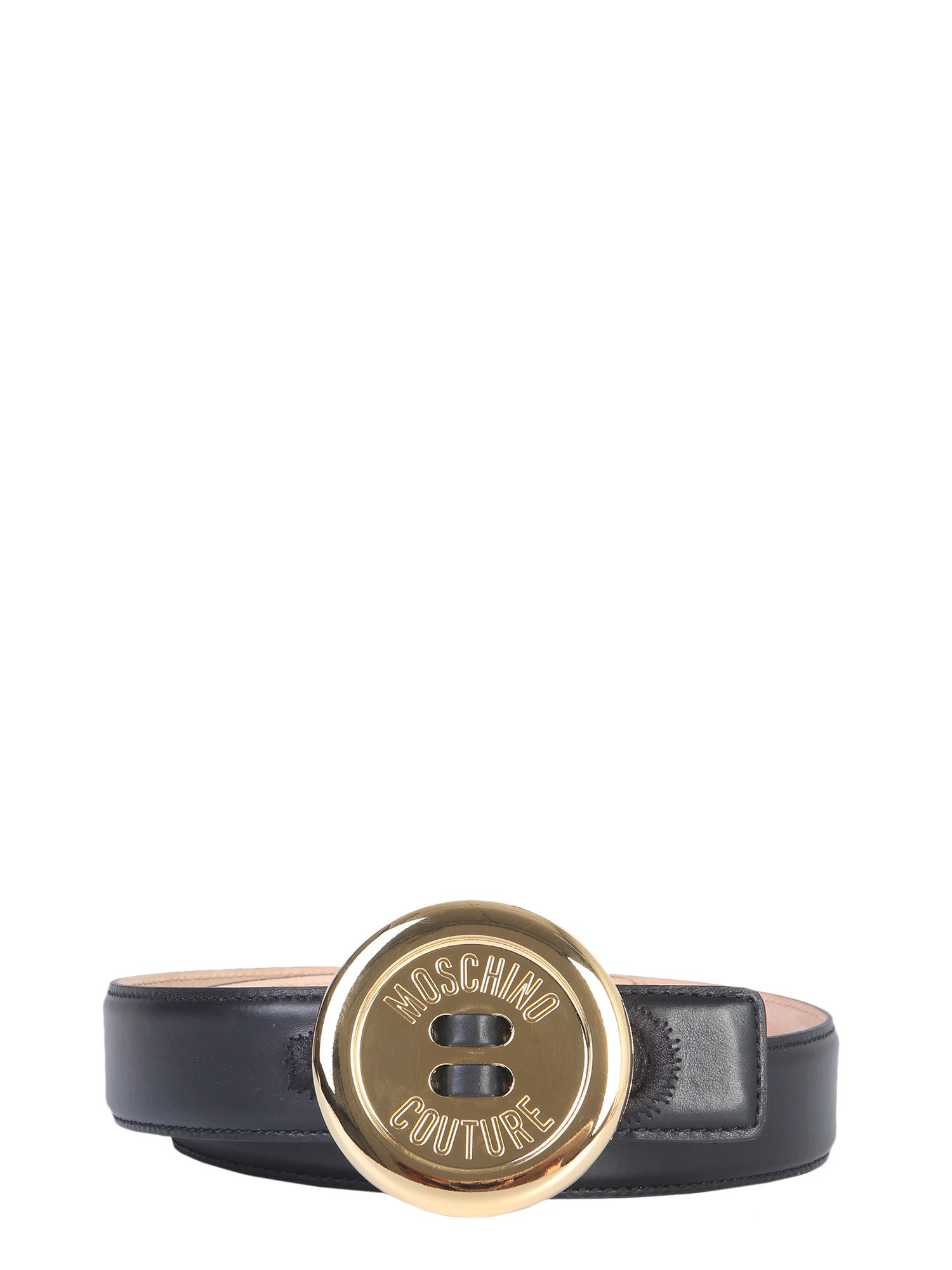 Accessorize in style using this belt with Moschino button buckle from Moschino. This durable belt is made from good quality leather and comes with a round-shaped gold-finished metallic buckle. The buckle features carved branding to add up to its charm. The simple and clean edges of this belt make it ideal for casual looks.