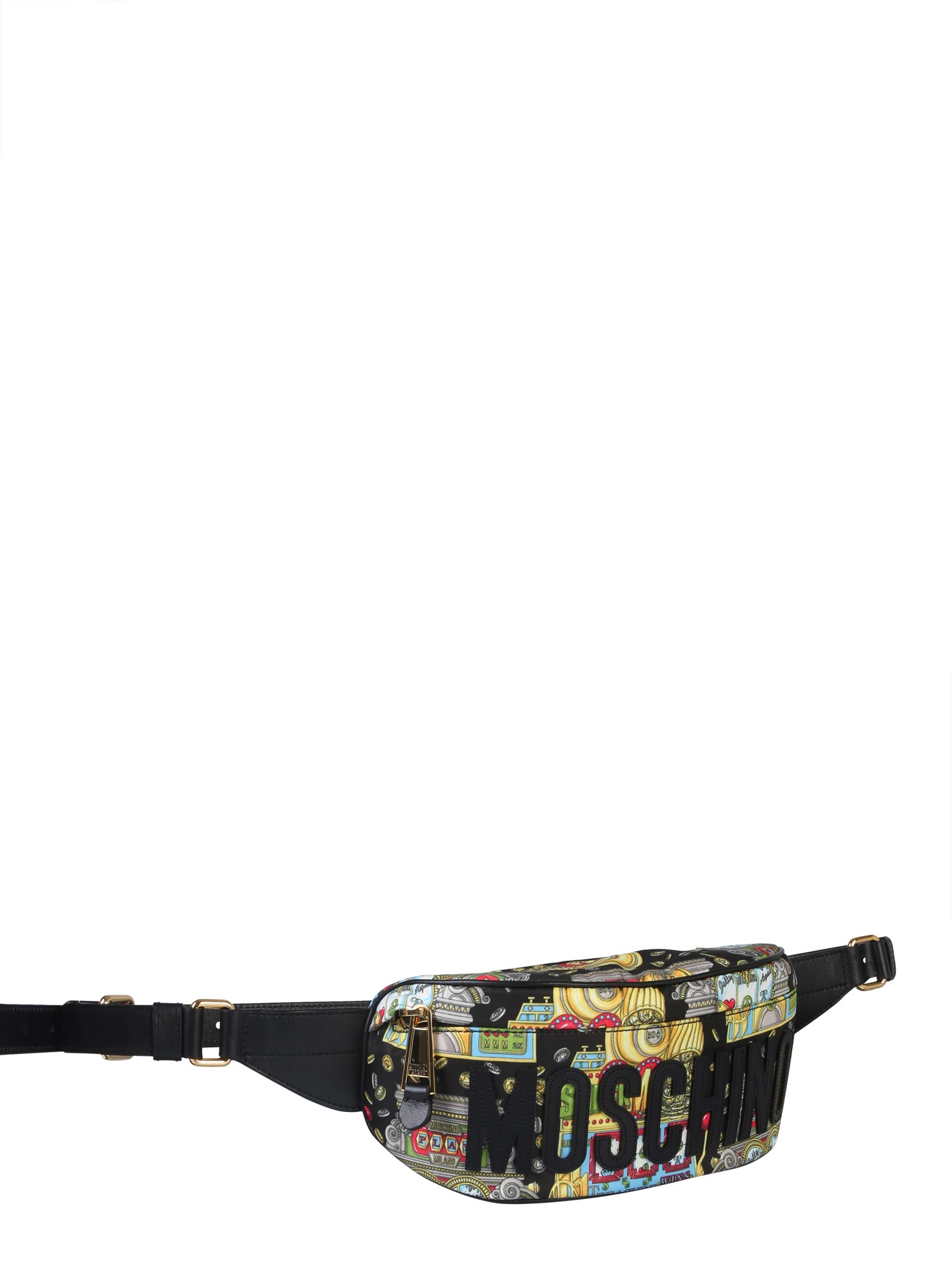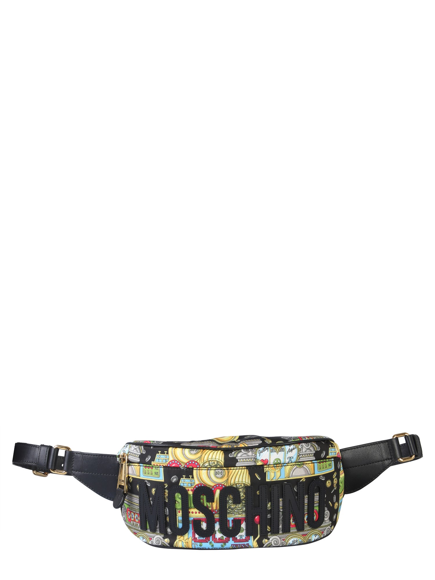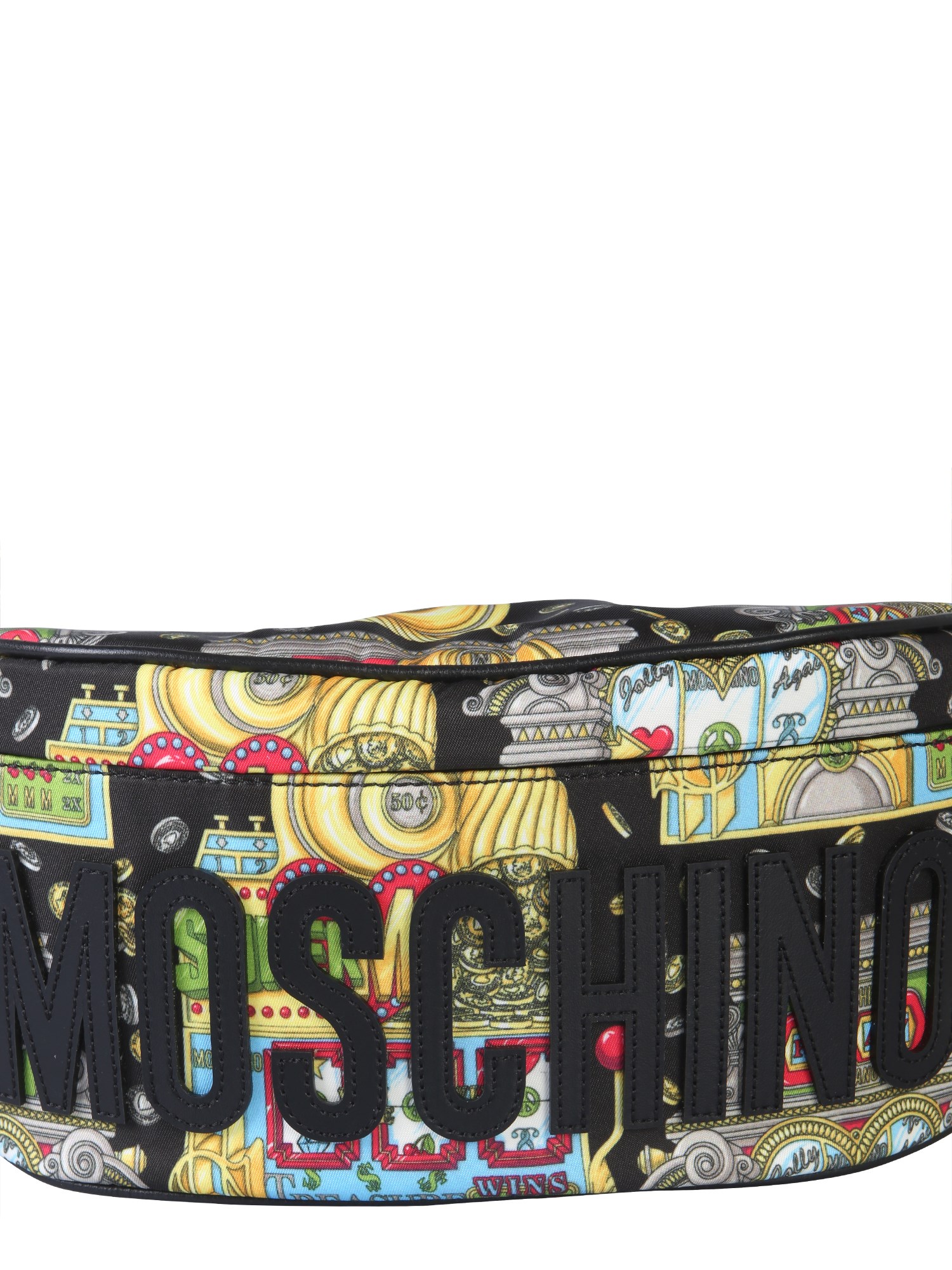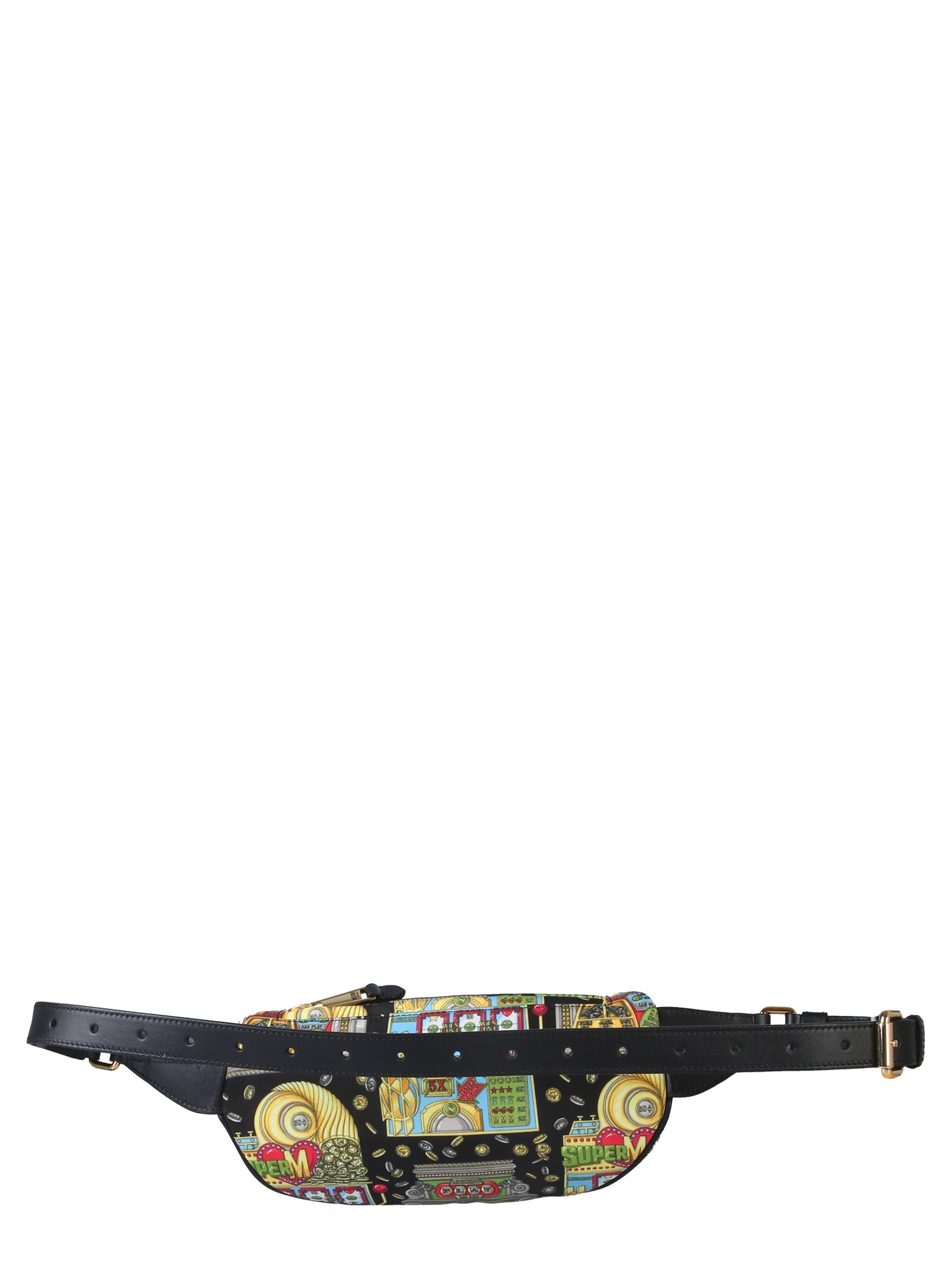 Carry your valuables in style with this slot machine bag from Moschino. The adjustable shoulder strap can be tied around your waistline to roam hands-free. It has an all-over printed surface accented with stitched brand name in black. Made of polyester fabric, the pouch is long-lasting, lightweight and easy to maintain.