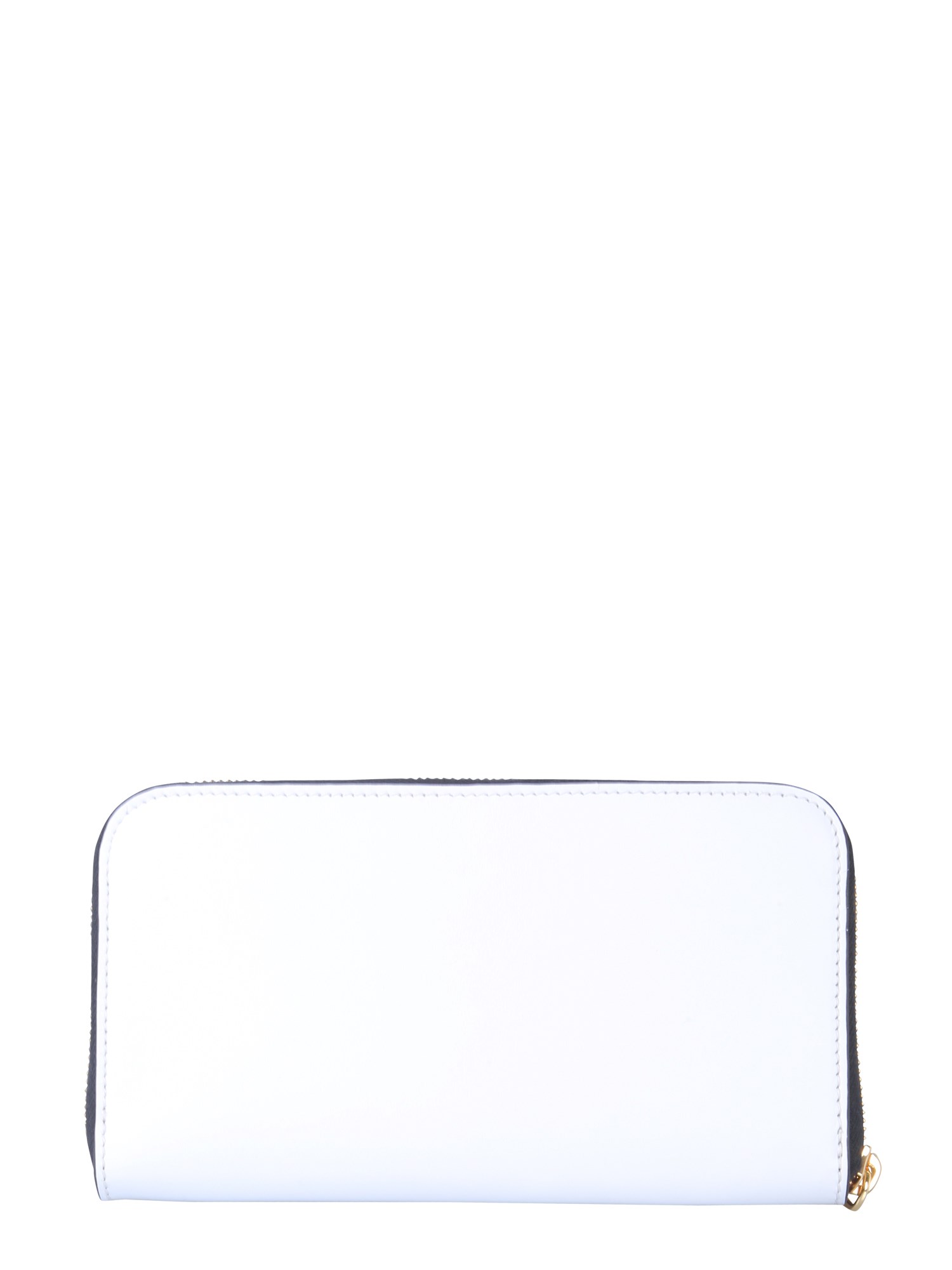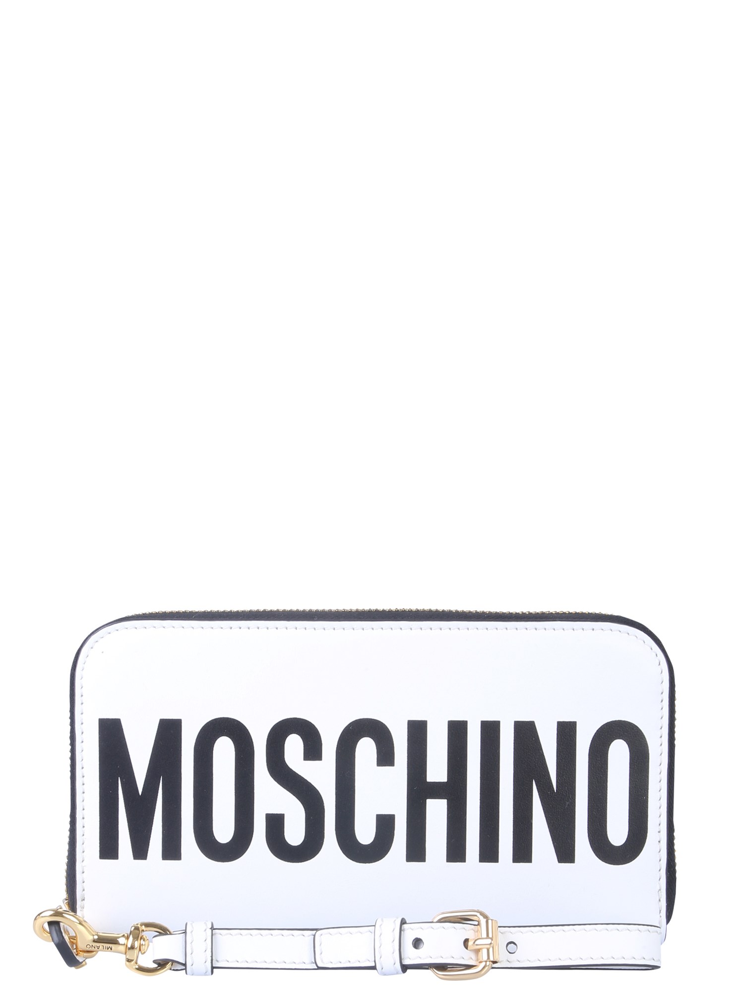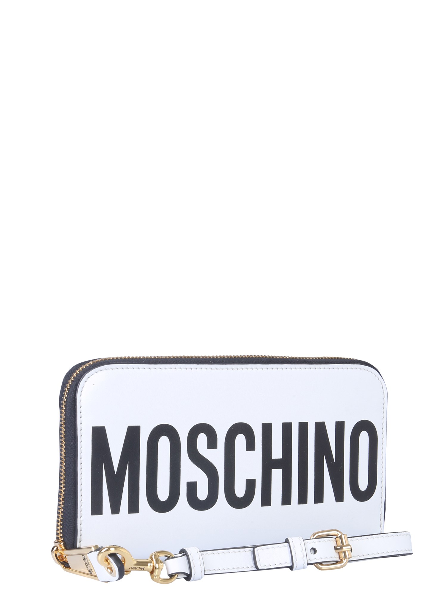 Flaunt your love for Moschino by carrying your essentials in this leather wallet. It has a removable and adjustable wrist strap for easy hold while the zip closure covers three edges of the purse. This wallet comes with numerous compartments and pockets to hold your important documents, banknotes and coins.