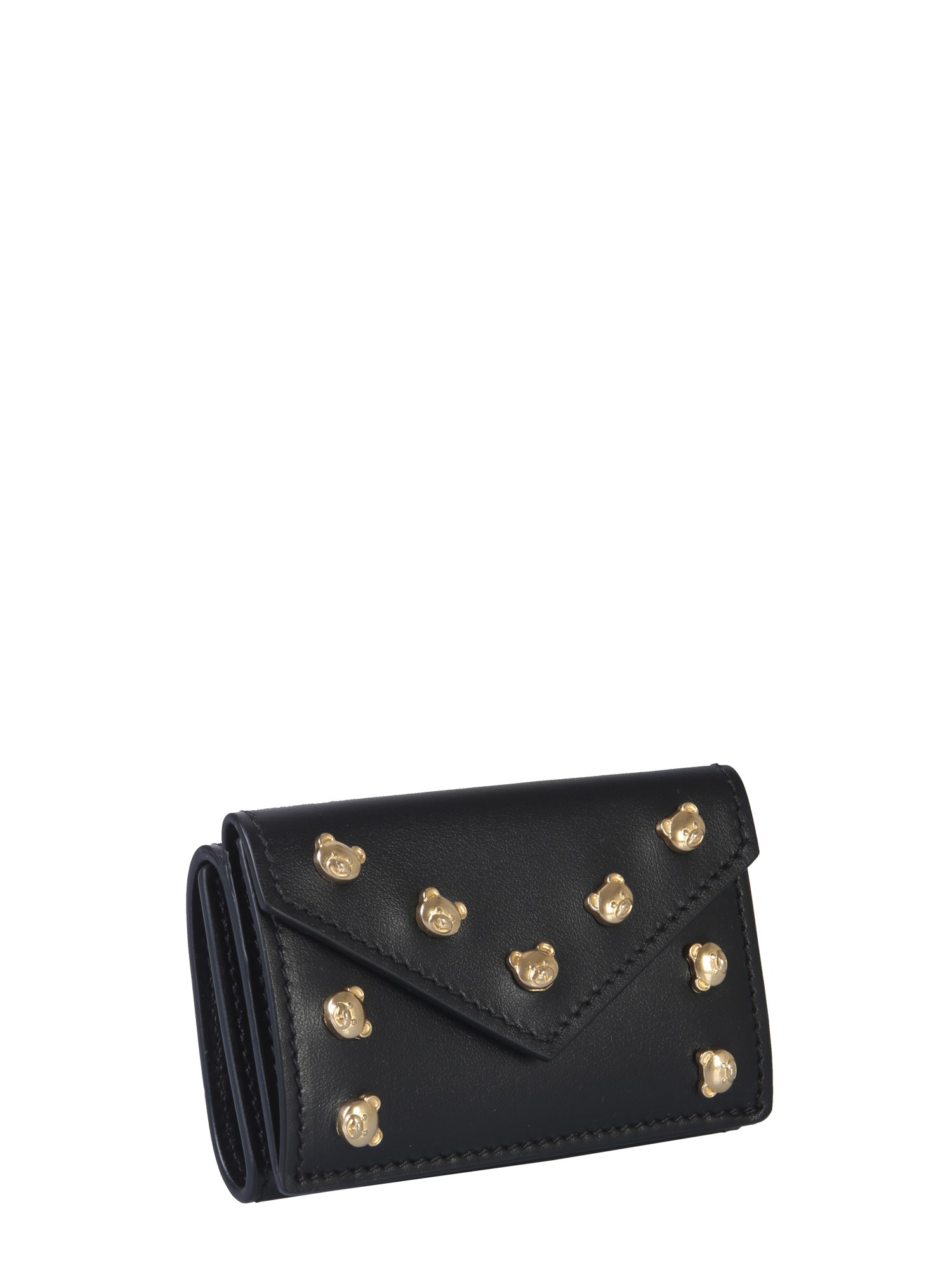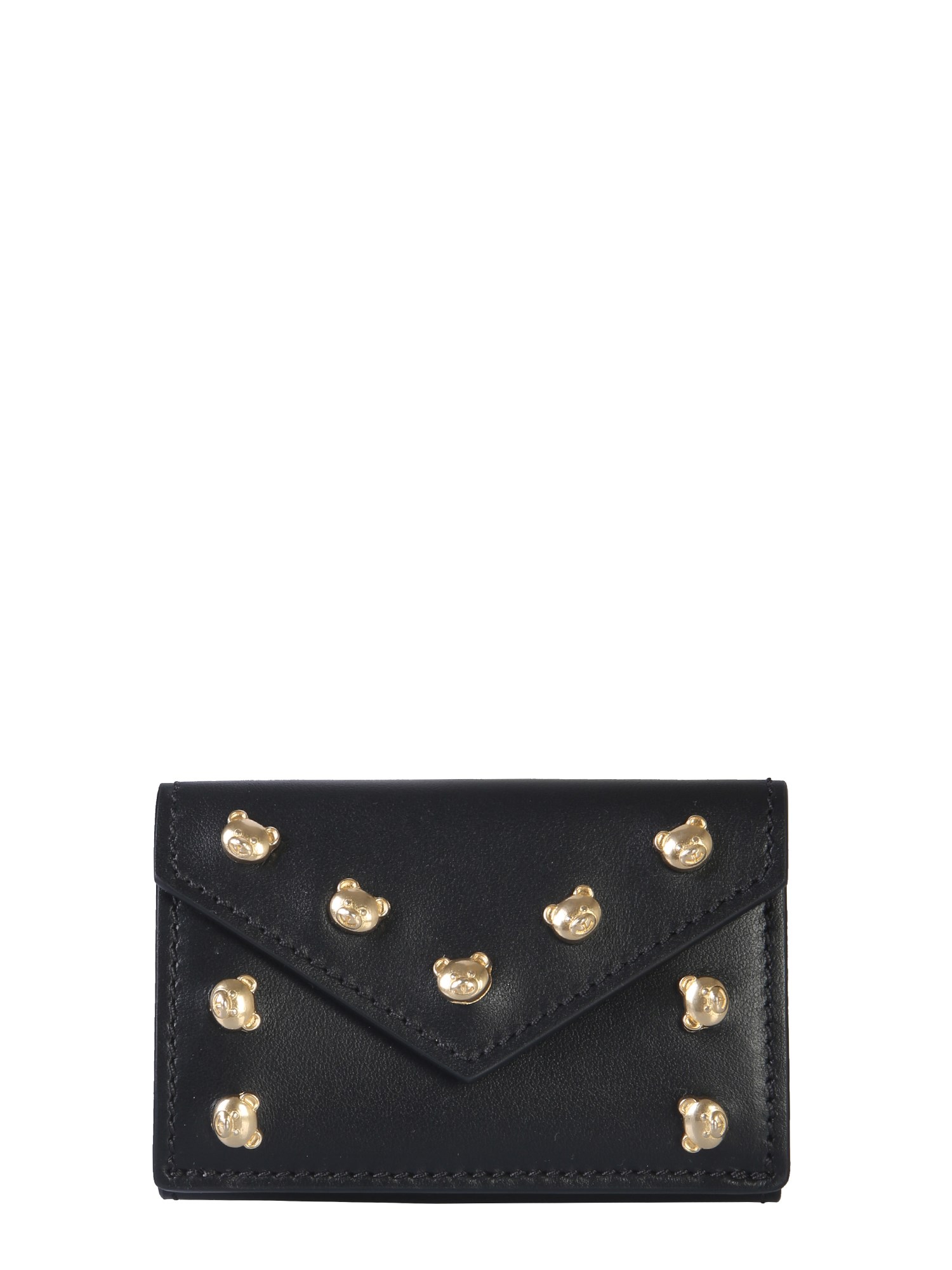 Organise your cards and cash with this wallet with teddy bear studs from Moschino. This envelope-style wallet is made of 100% calf leather for a classy finish and enduring quality. They have cute teddy bear embellishments that look good with the bold colour scheme of this wallet.