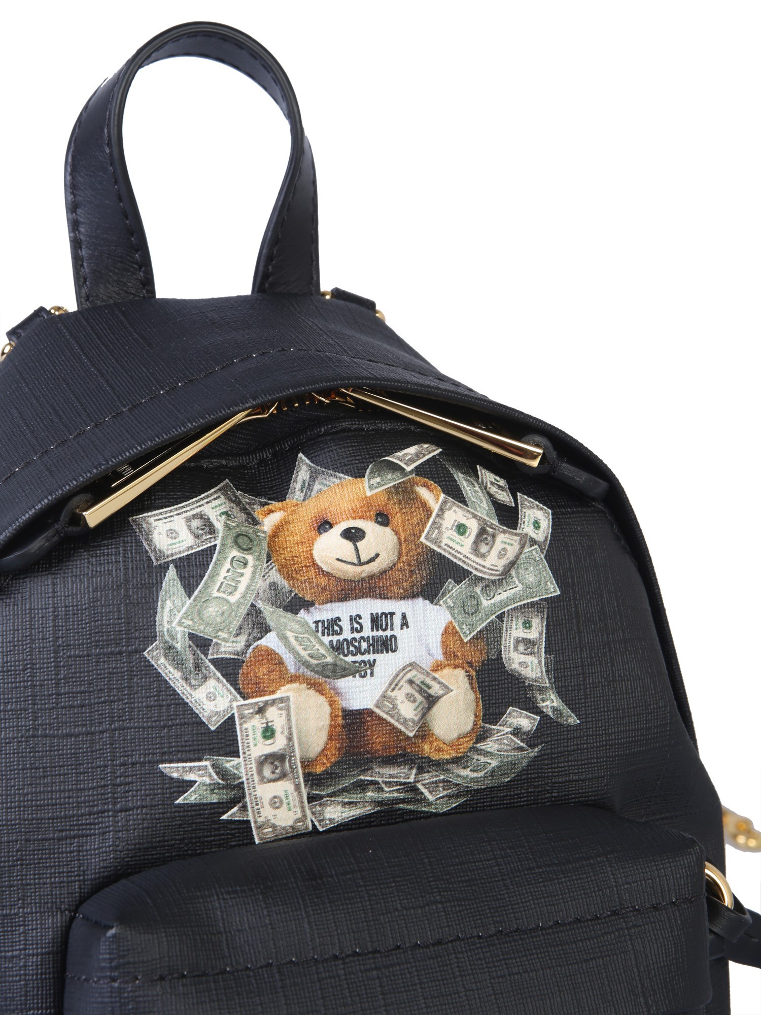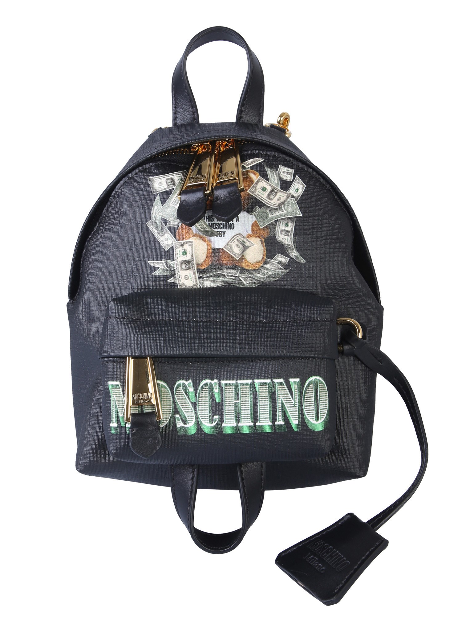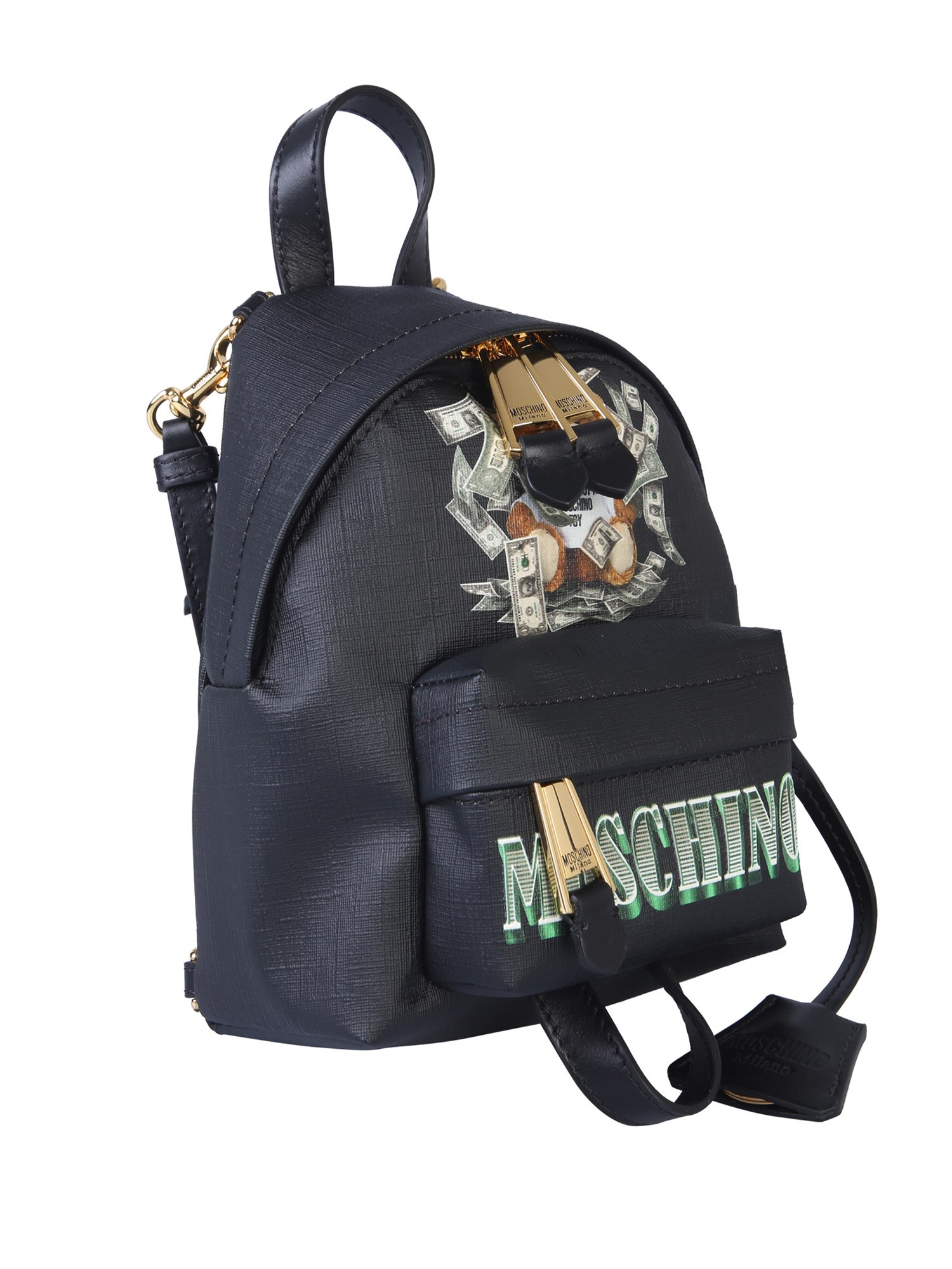 From weekend trips to daily commutes, this mini backpack from Moschino will become your favourite companion every time you step out. It has a 100% polyurethane body that guarantees a long lasting use. The faux leather key ring and teddy bear dollar patch complete its attractive and trendy design.