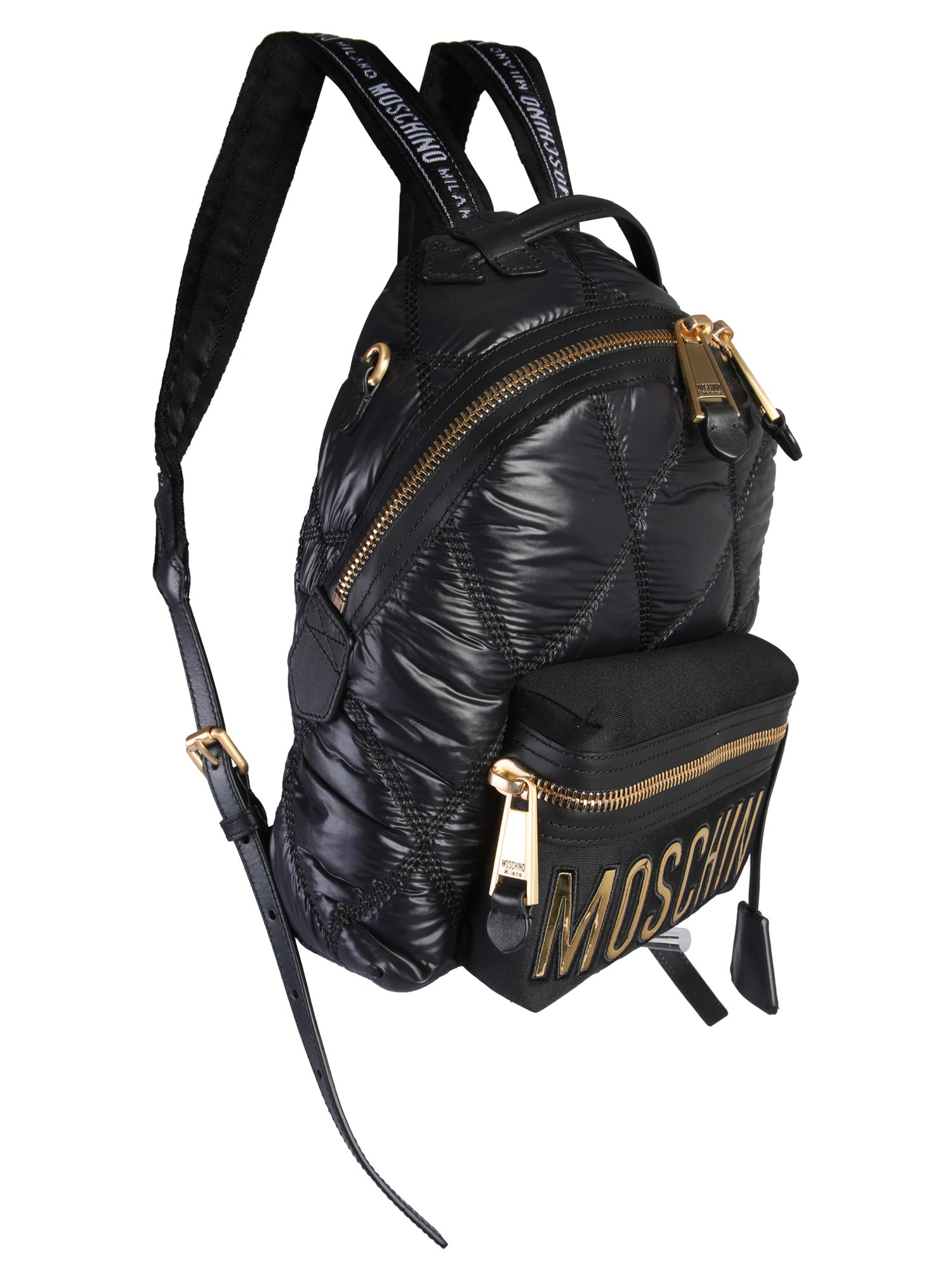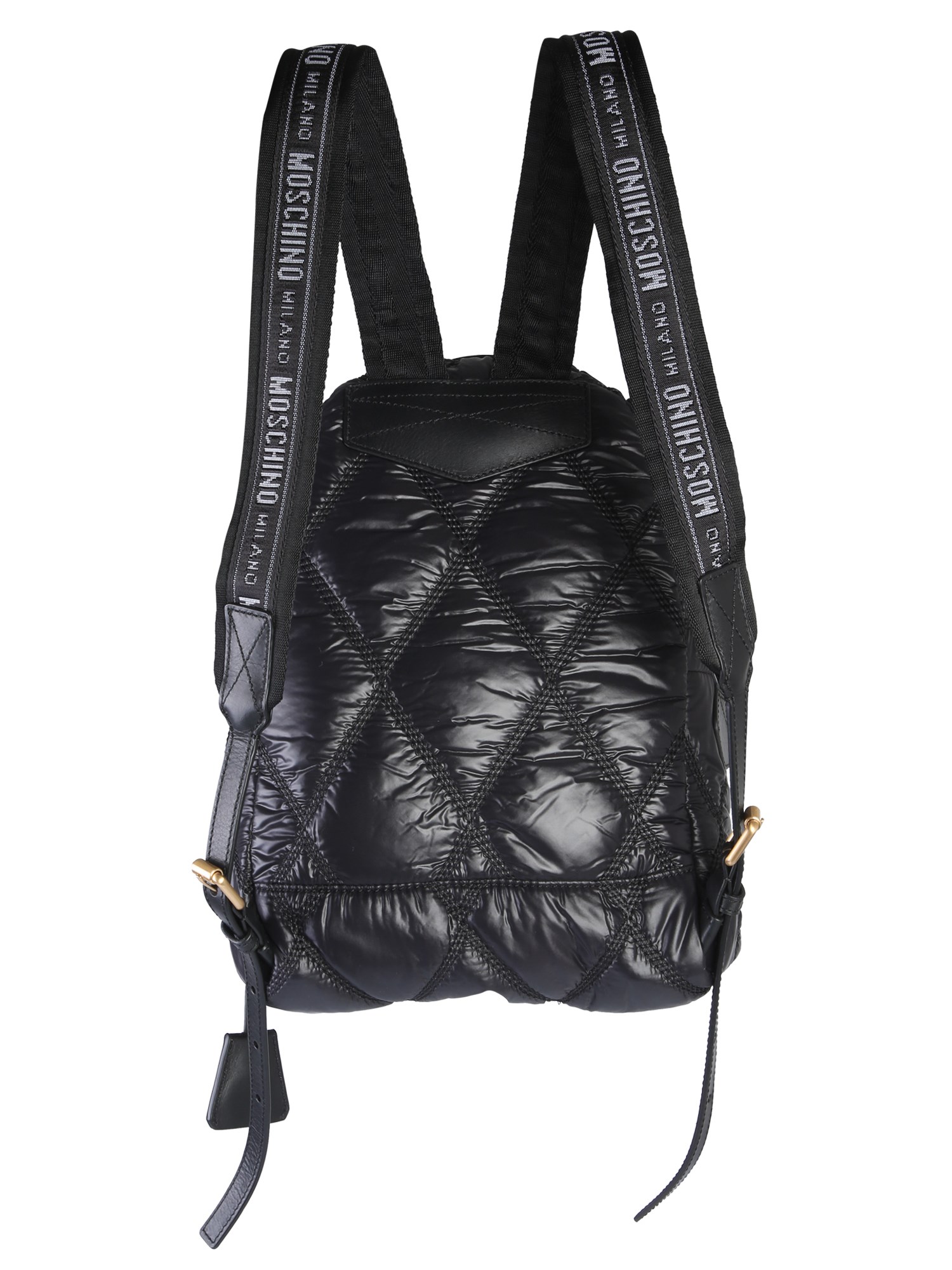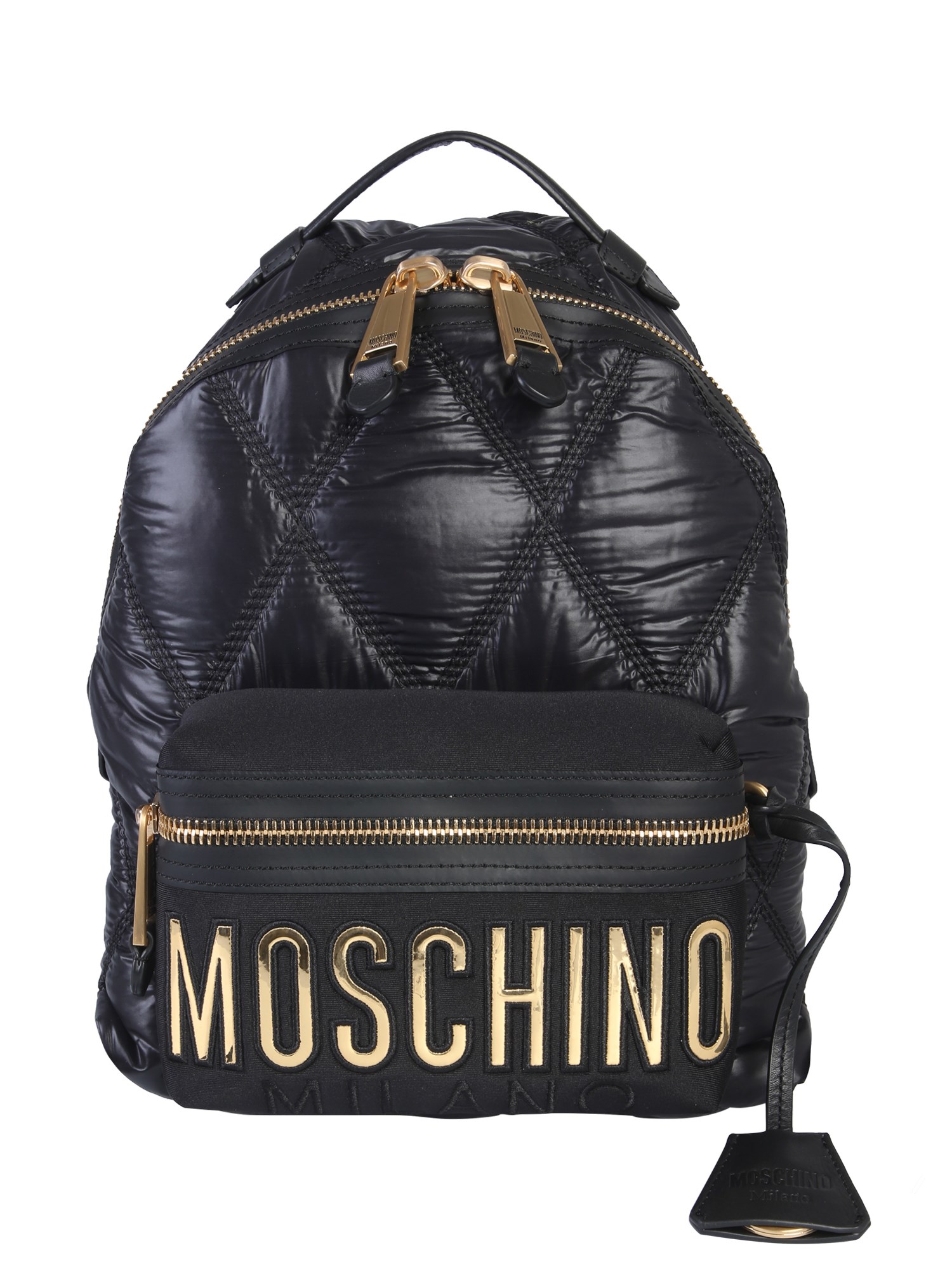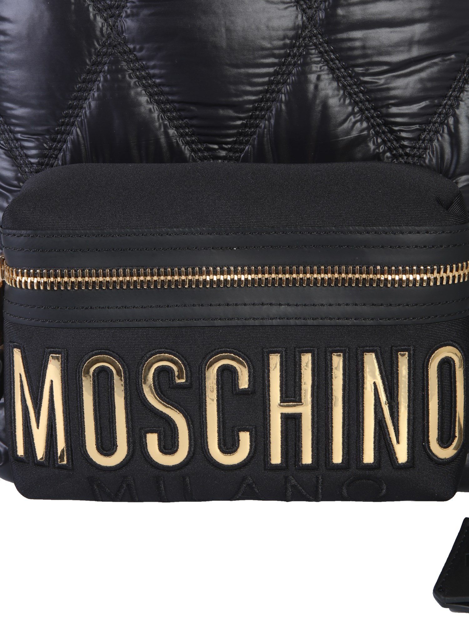 Show off this quilted backpack from Moschino in your workplace or college. The bag is made from good quality leather that ensures durability. It features an adjustable strap with embroidered logo and a zip closure. With the use of multiple compartments, you can keep your essentials in an organized manner. The shiny surface of this bag is aptly complemented by the gold-finished metal detailing.