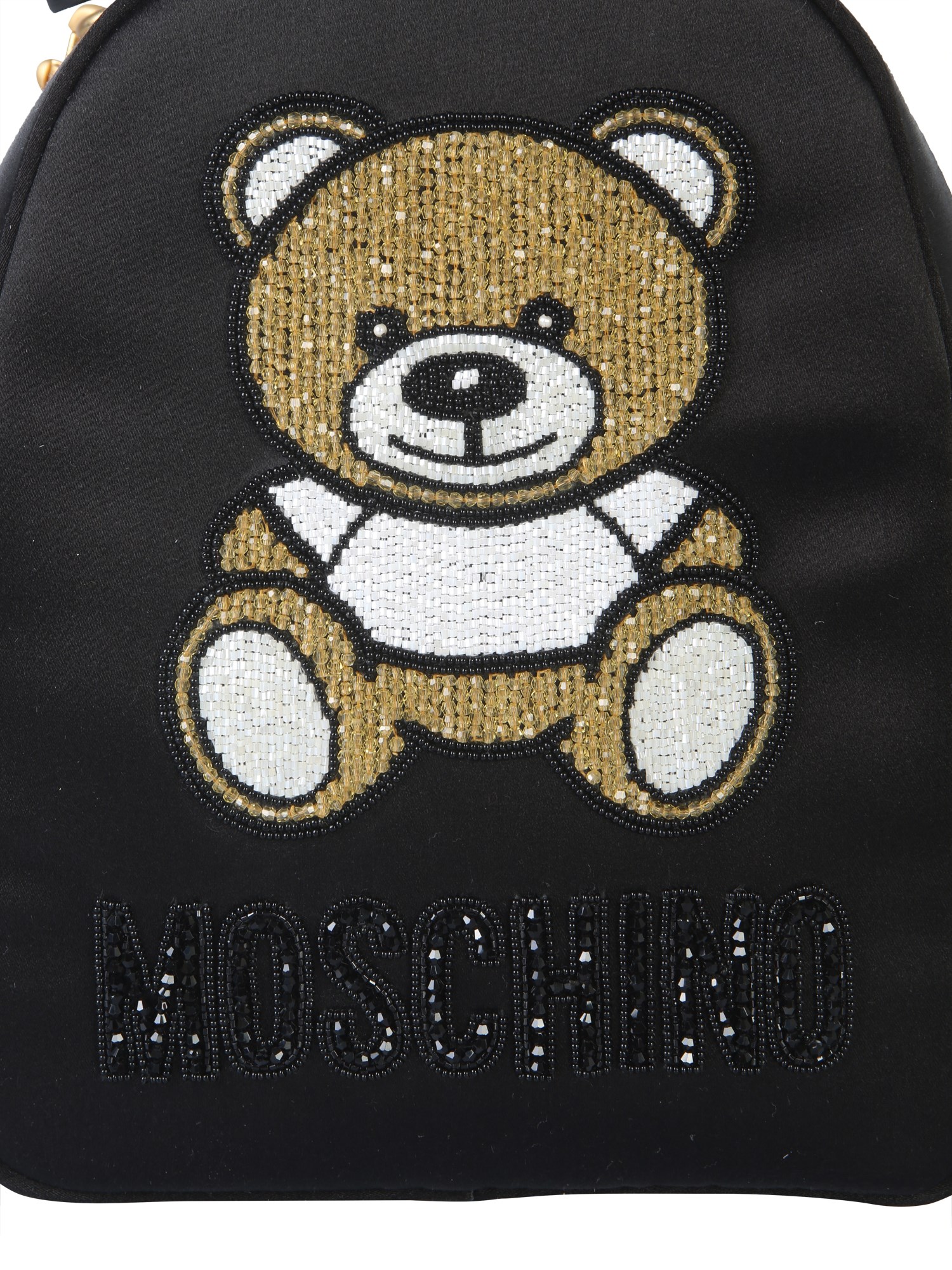 Make an exciting addition to your bag collection with this zaino teddy bear perline from Moschino. Its unique front is designed with a teddy bear print adorned with shiny studs. The lustrous round chain embellishment highlights its funky appearance. It is made of viscose and silk blend fabric for a long-lasting quality.