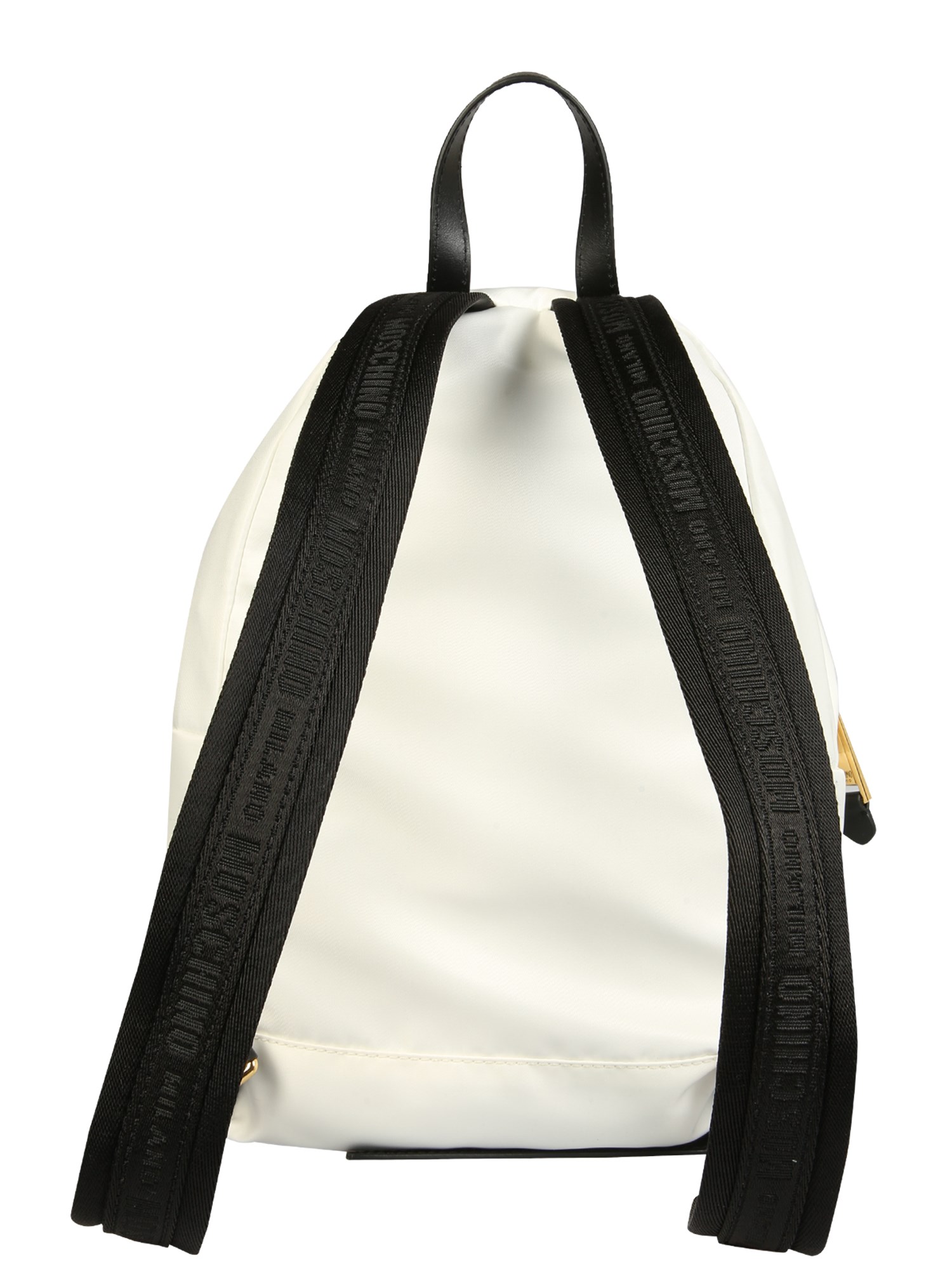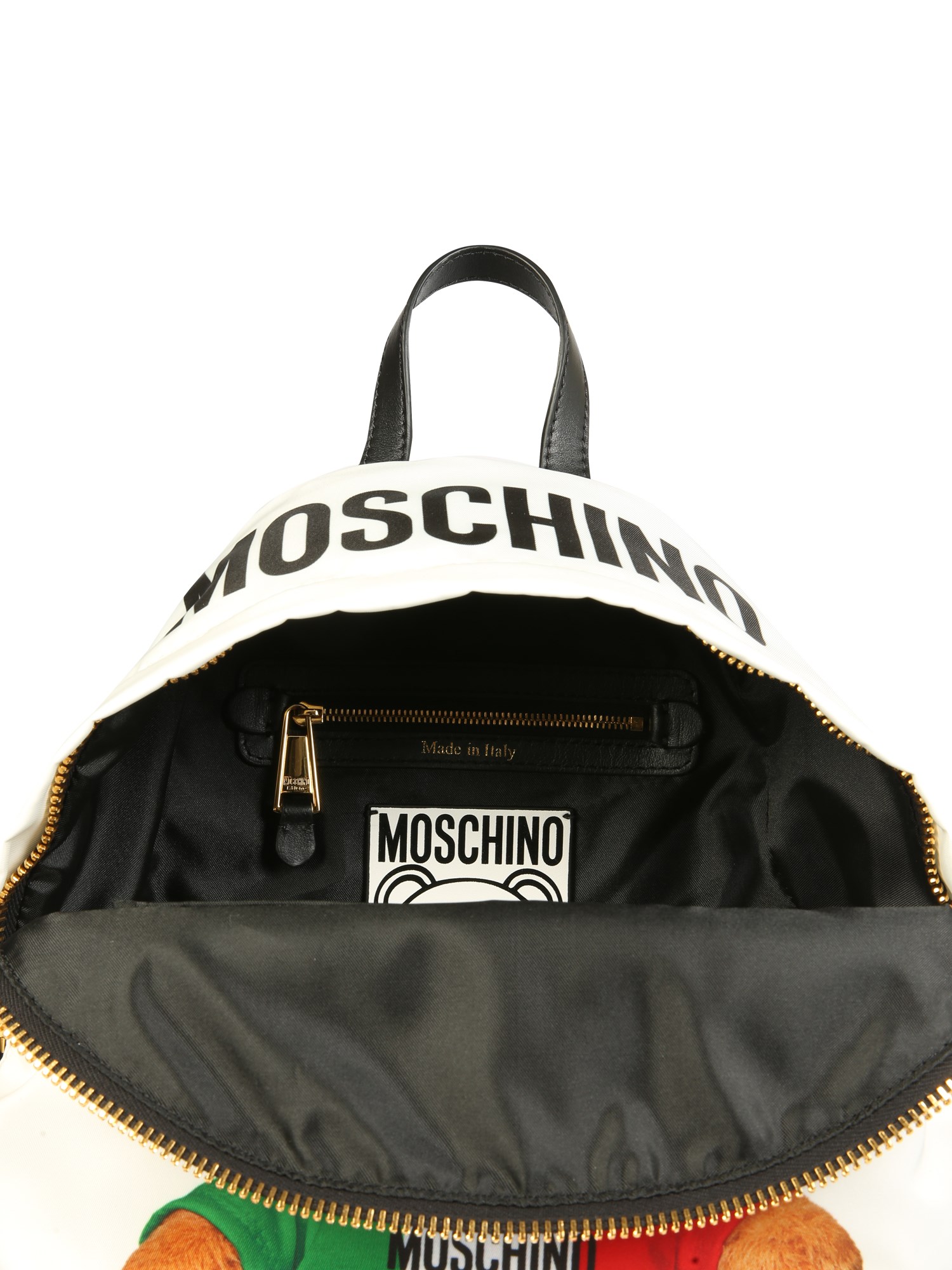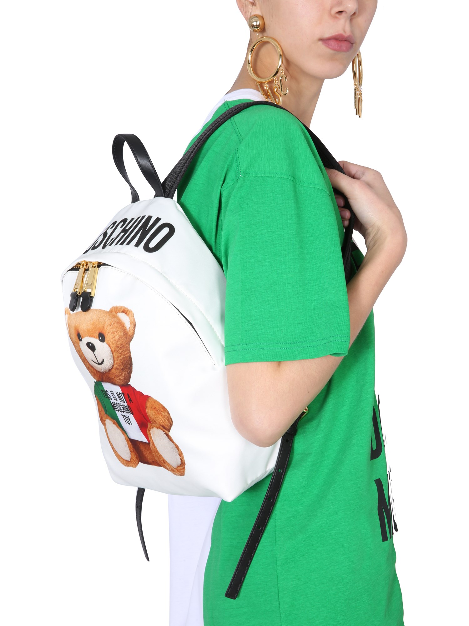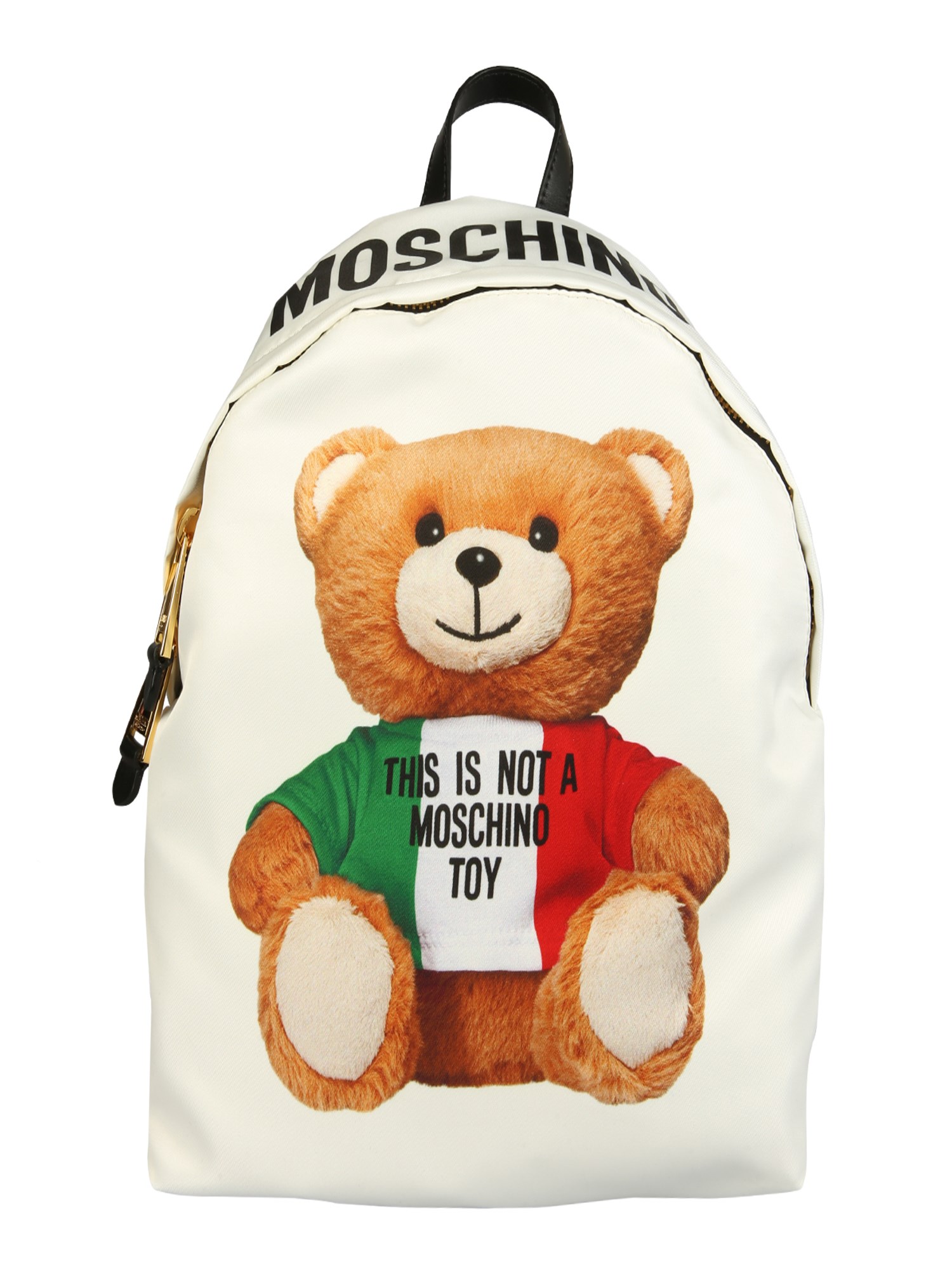This Italian Teddy Bear Backpack from Moschino is sure to add that missing charm to your casual style. Crafted from polyester, this adorable bag features a zippered closure, an exterior zippered pocket, and two interior open and one zippered pocket. The front logo with the Italian teddy bear print and the gold-tone metal accessories add to the charm of this functional piece.