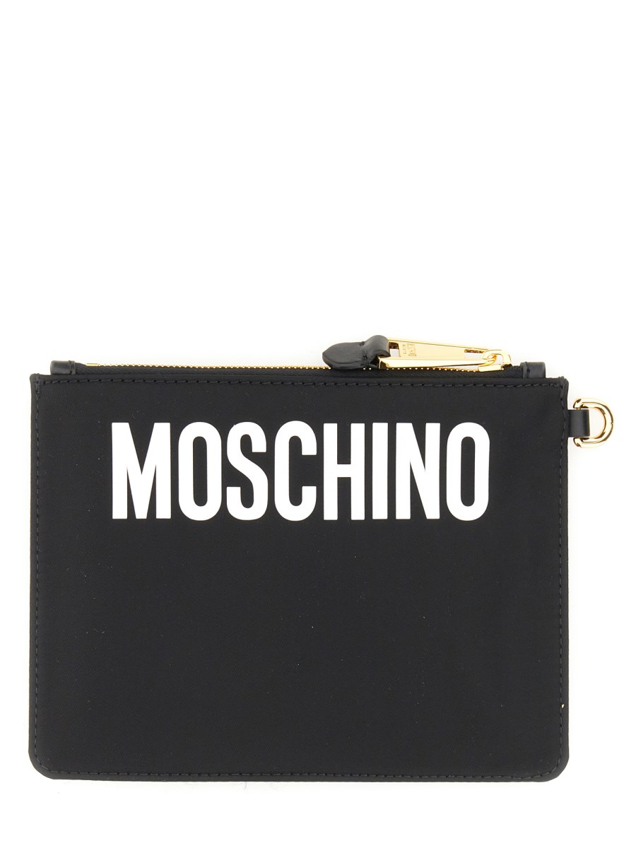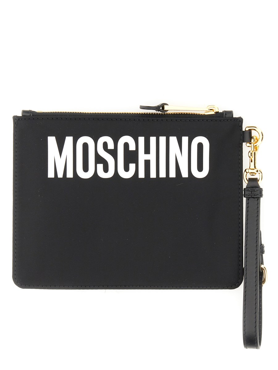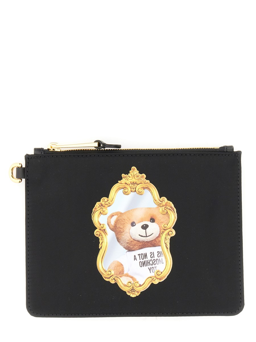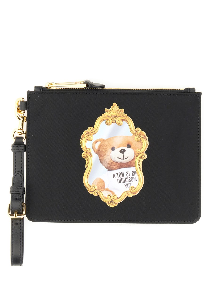 A practical and chic "Teddy Bear" leather clutch bag from the house of Moschino that is both classic and modern. This clutch bag is made of soft and smooth black leather that is a bit textured to give it a beautiful, sleek finish. It features a printed logo on the back, top zipper closure, and a removable wrist strap.