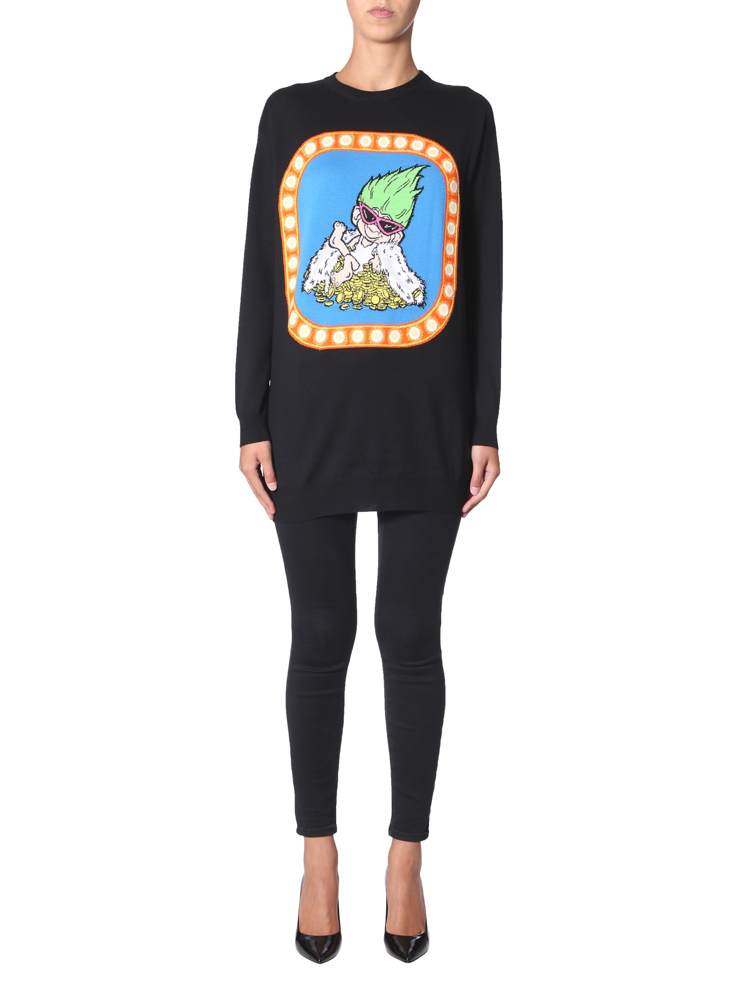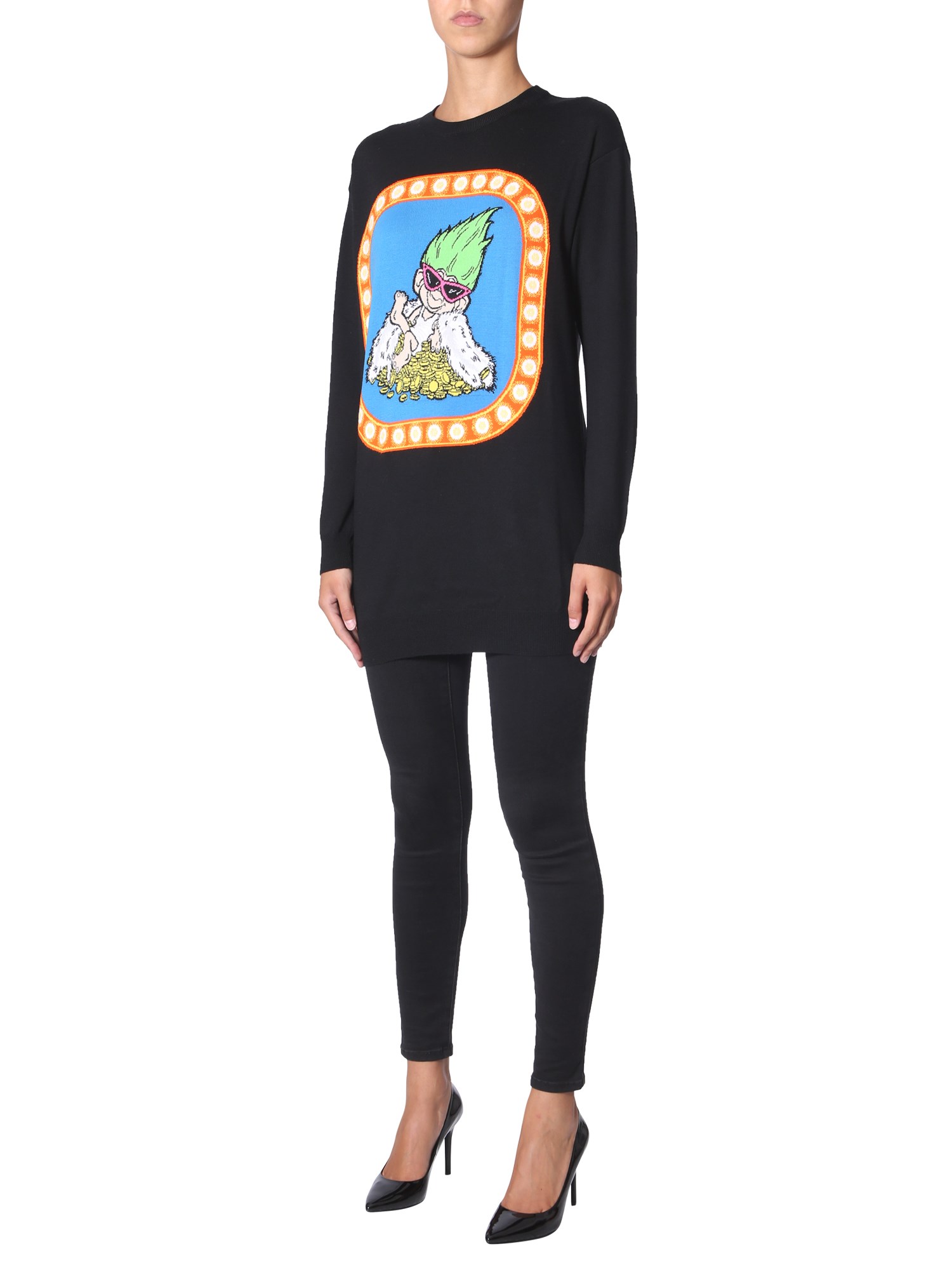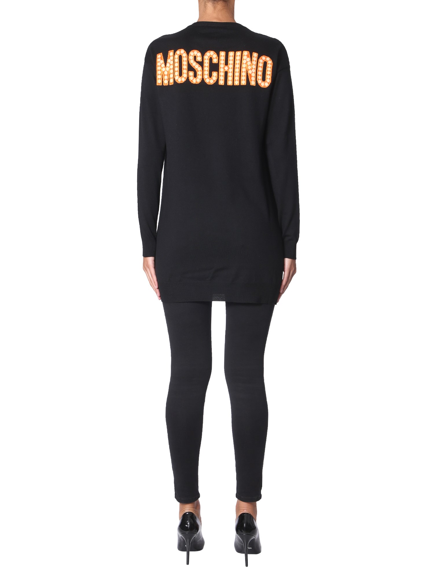 Flaunt your amazing choice in clothing with this cool and casual knit dress from Moschino. The dress is knitted from 100% virgin wool for a soft and smooth texture. This dress comes with bold base decorated with vibrant colours to make it an exceptional addition to your closet. Match it with black tights and thigh-high boots for a stunning appearance.