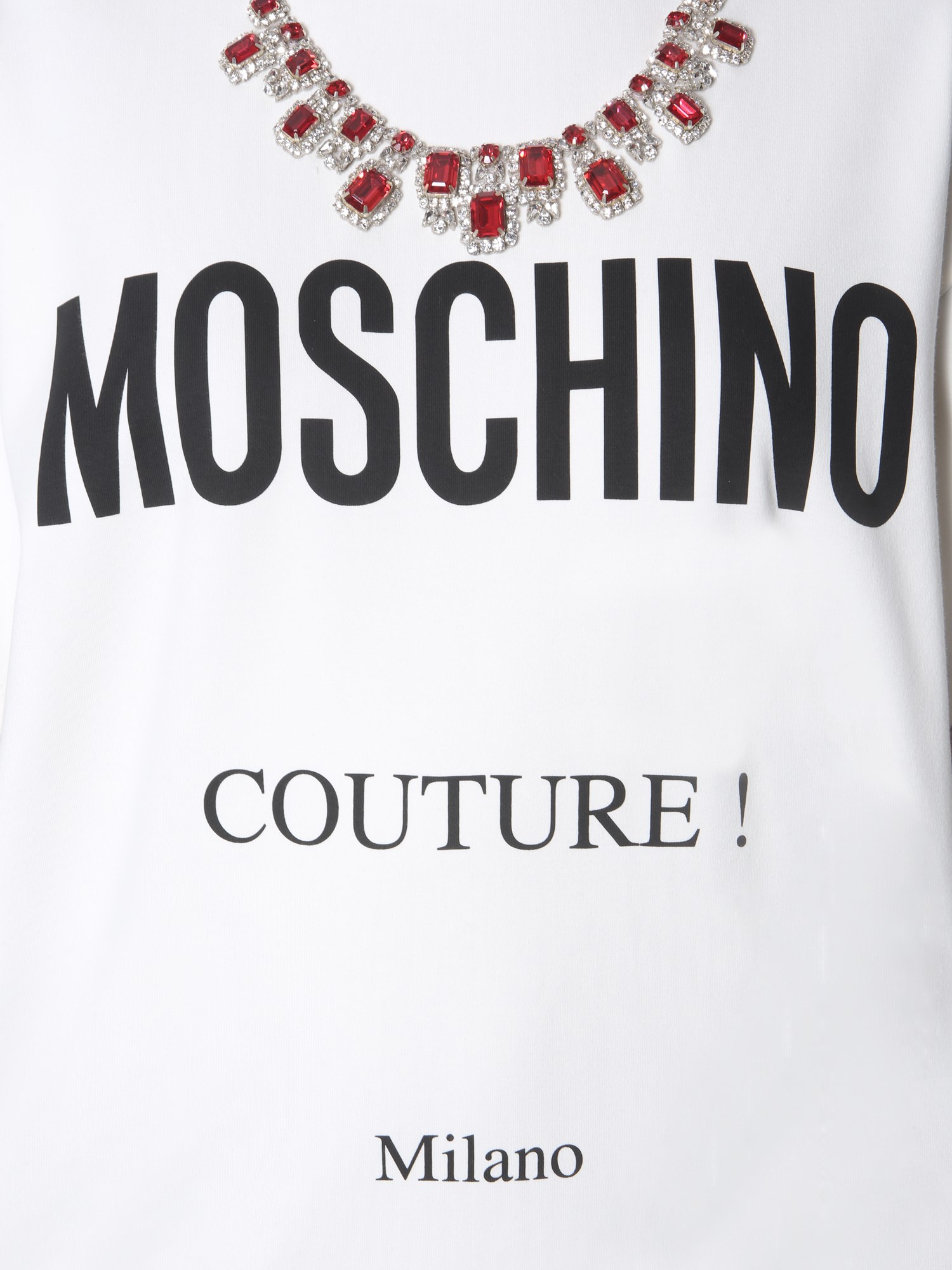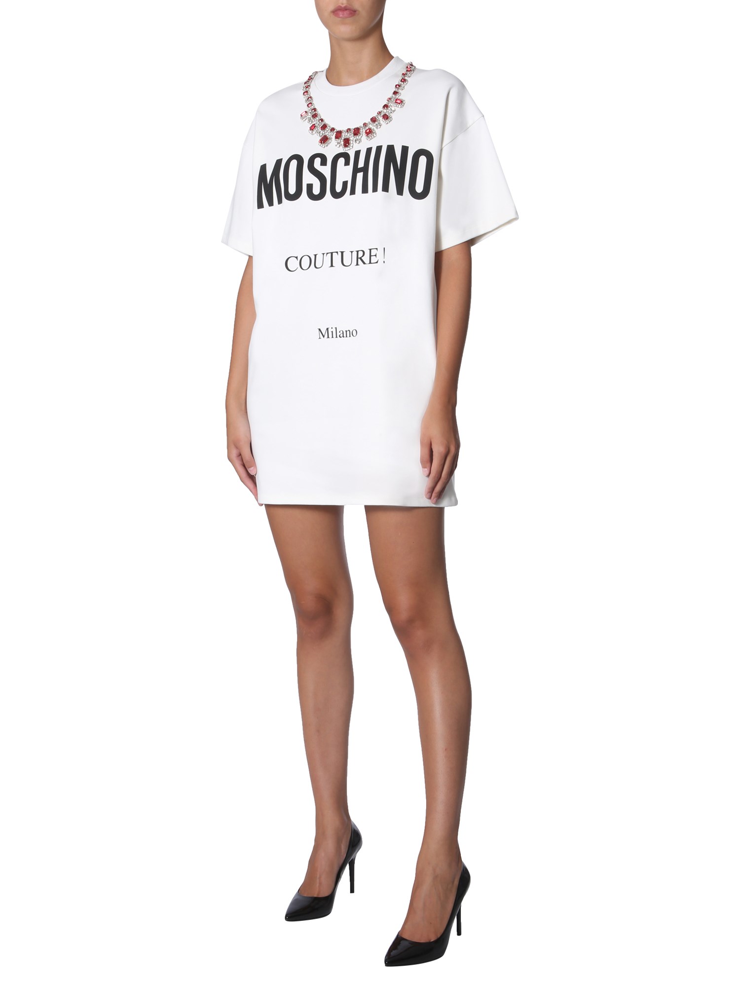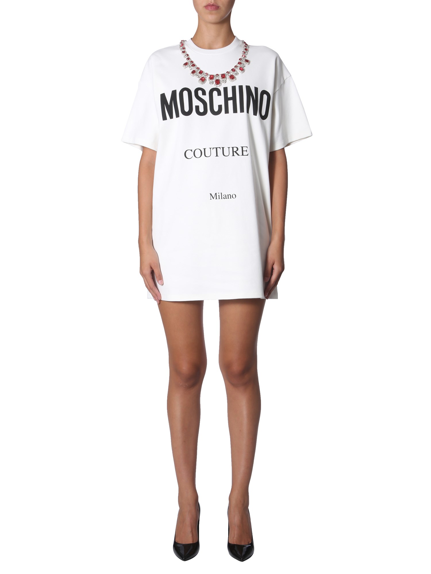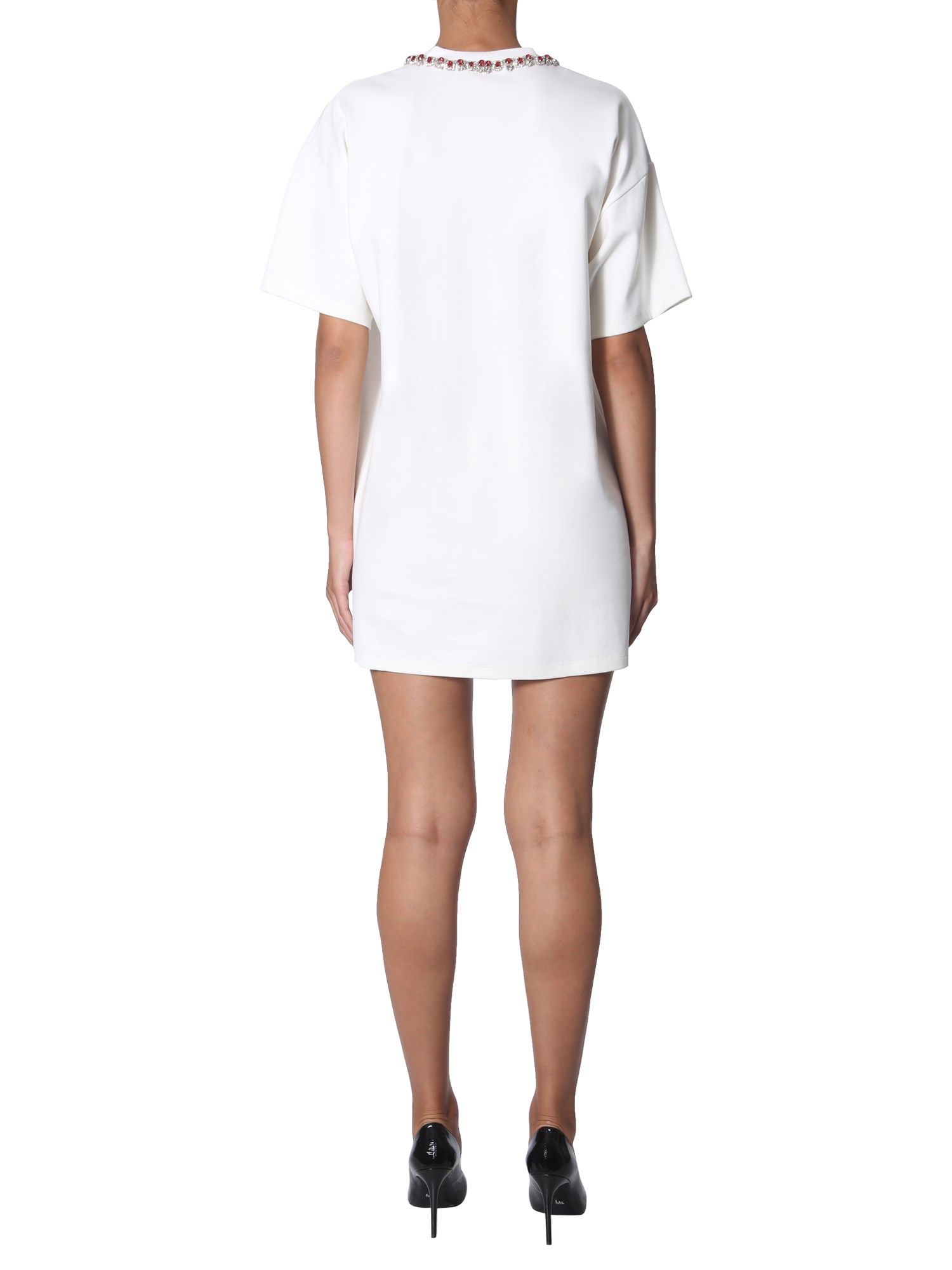 Give your summer wardrobe with this crew neck dress from Moschino. The dress is adorned with a shiny and studded necklace for an unmatched look. The use of fine quality cotton makes it soft and breathable. Just wear it over a pair of black stilettos for a complete look.