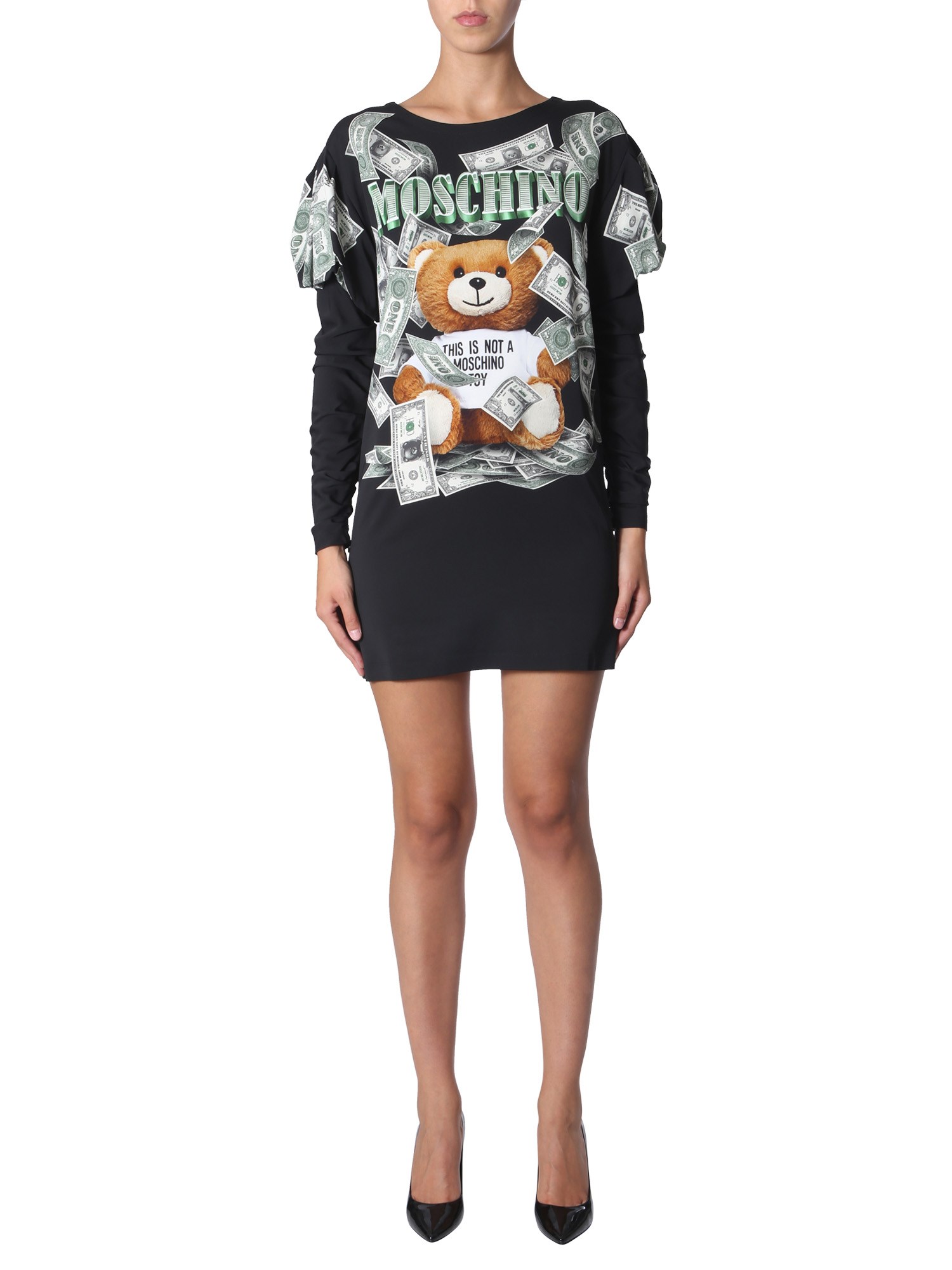 The dollar teddy bear dress from Moschino is the perfect choice for your next casual outing. This winter dress is made of viscose to keep you warm and comfortable all day long. The curled balloon sleeves give the dress a funky yet cute look. Pair it up with your favourite sneakers and head out with friends.