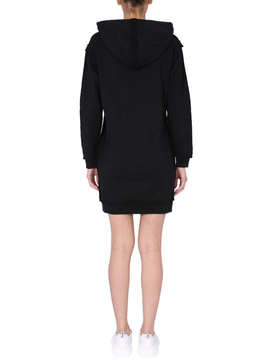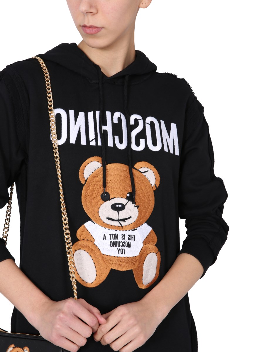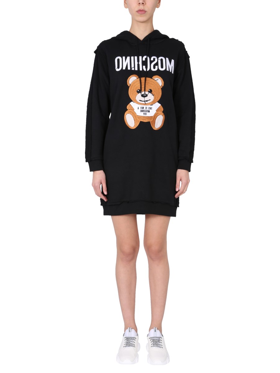 Look pleasant and lovely wearing the beautiful and simple hooded cotton dress from the house of Moschino. It has a hood with coulisse and is made 100% from cotton. Featuring two side pockets to keep your essentials safe, the dress is adorned with the teddy bear embroidered inside out.