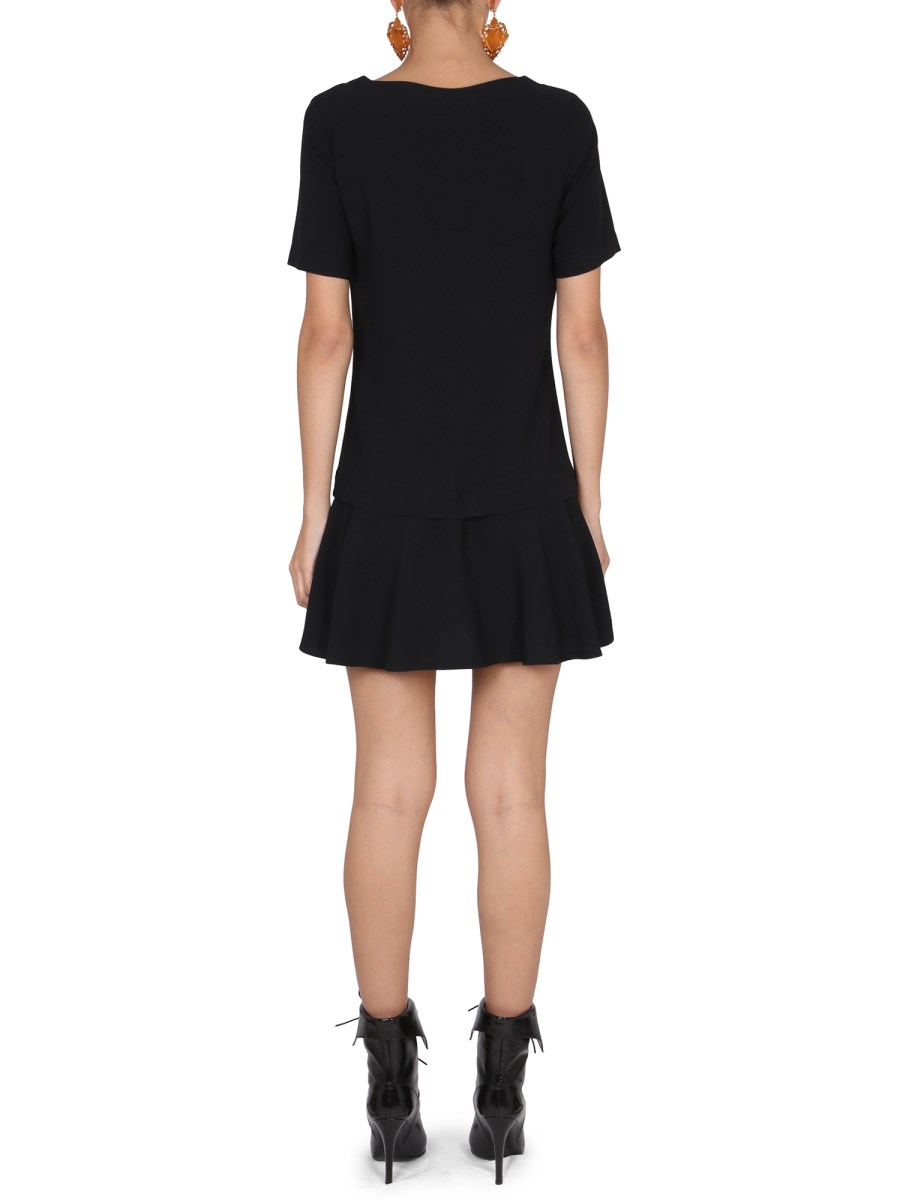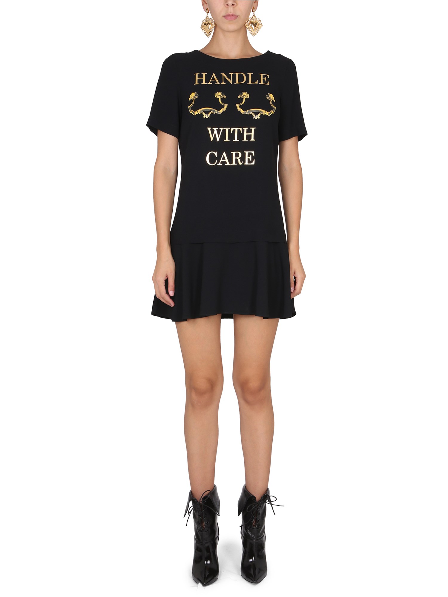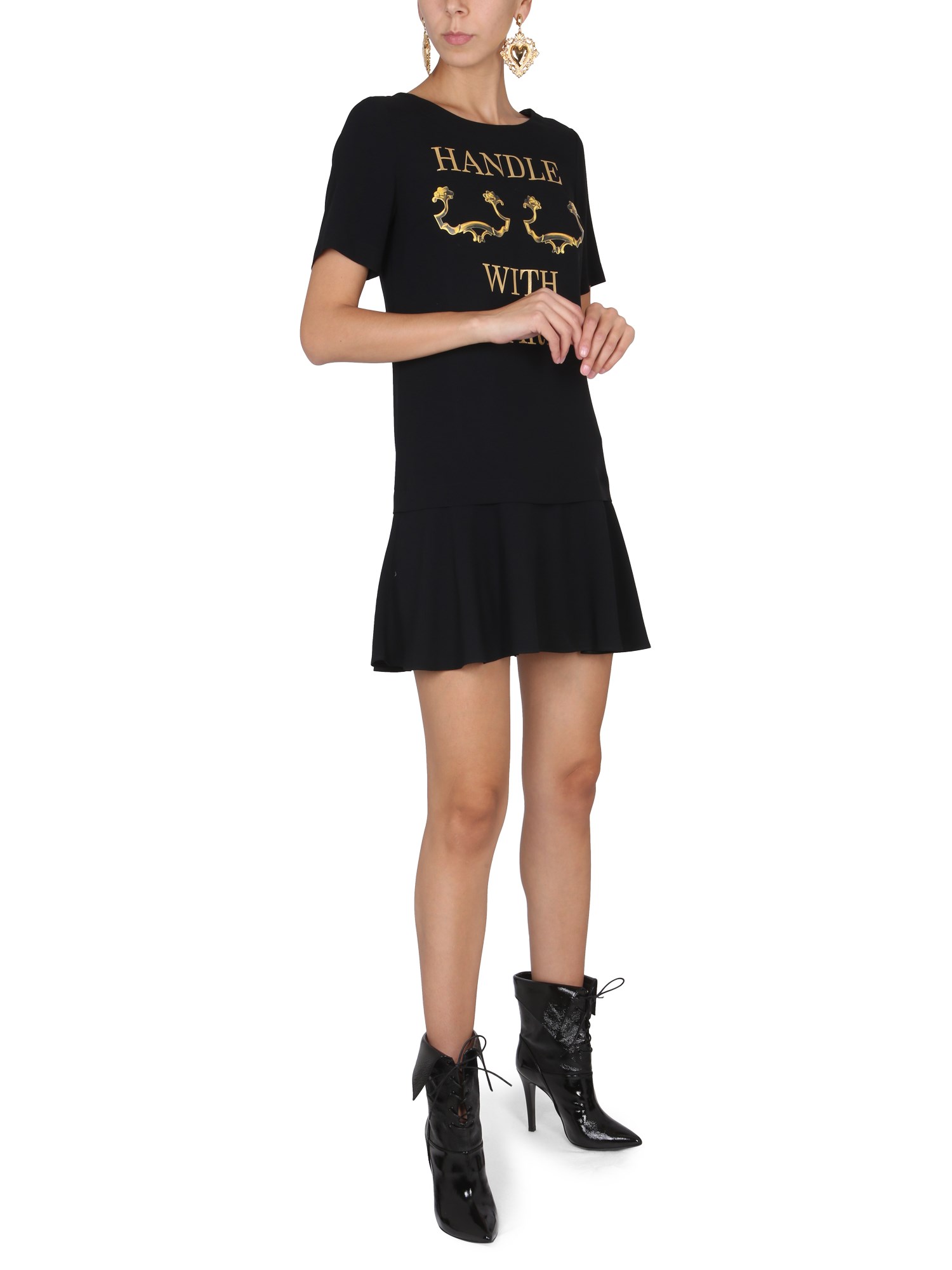 The dress from the house of Moschino is a fun and flirty piece that can be worn in any season. The pull-on style dress has a crew neckline, short sleeves, and a straight hem. Crafted from pure and durable cotton, the dress features a front logo print and ruffles on the bottom.