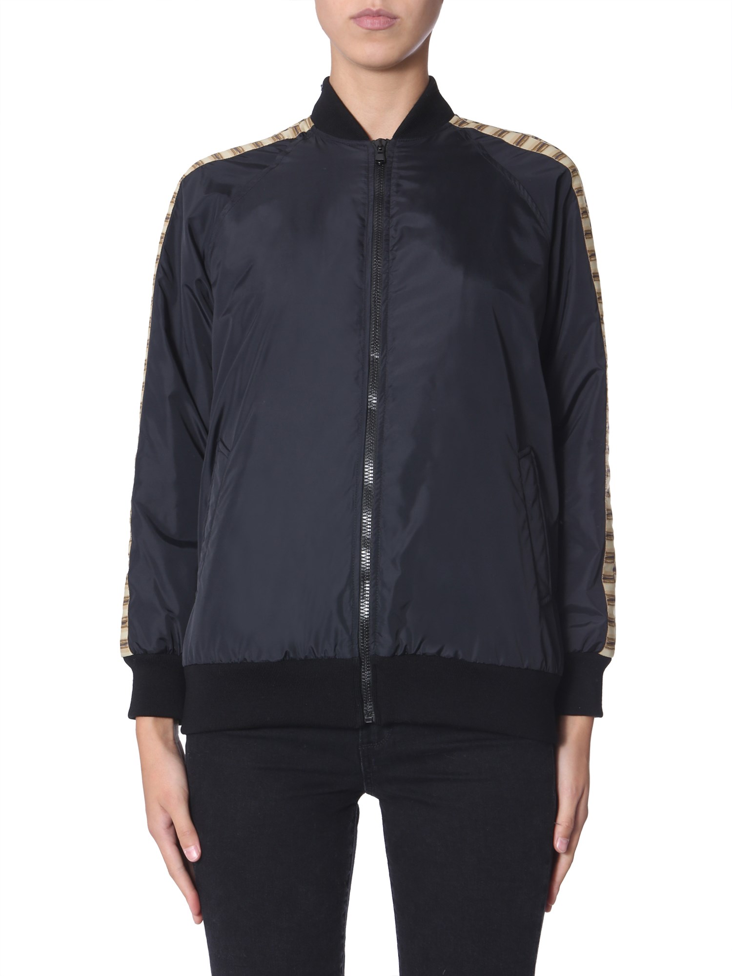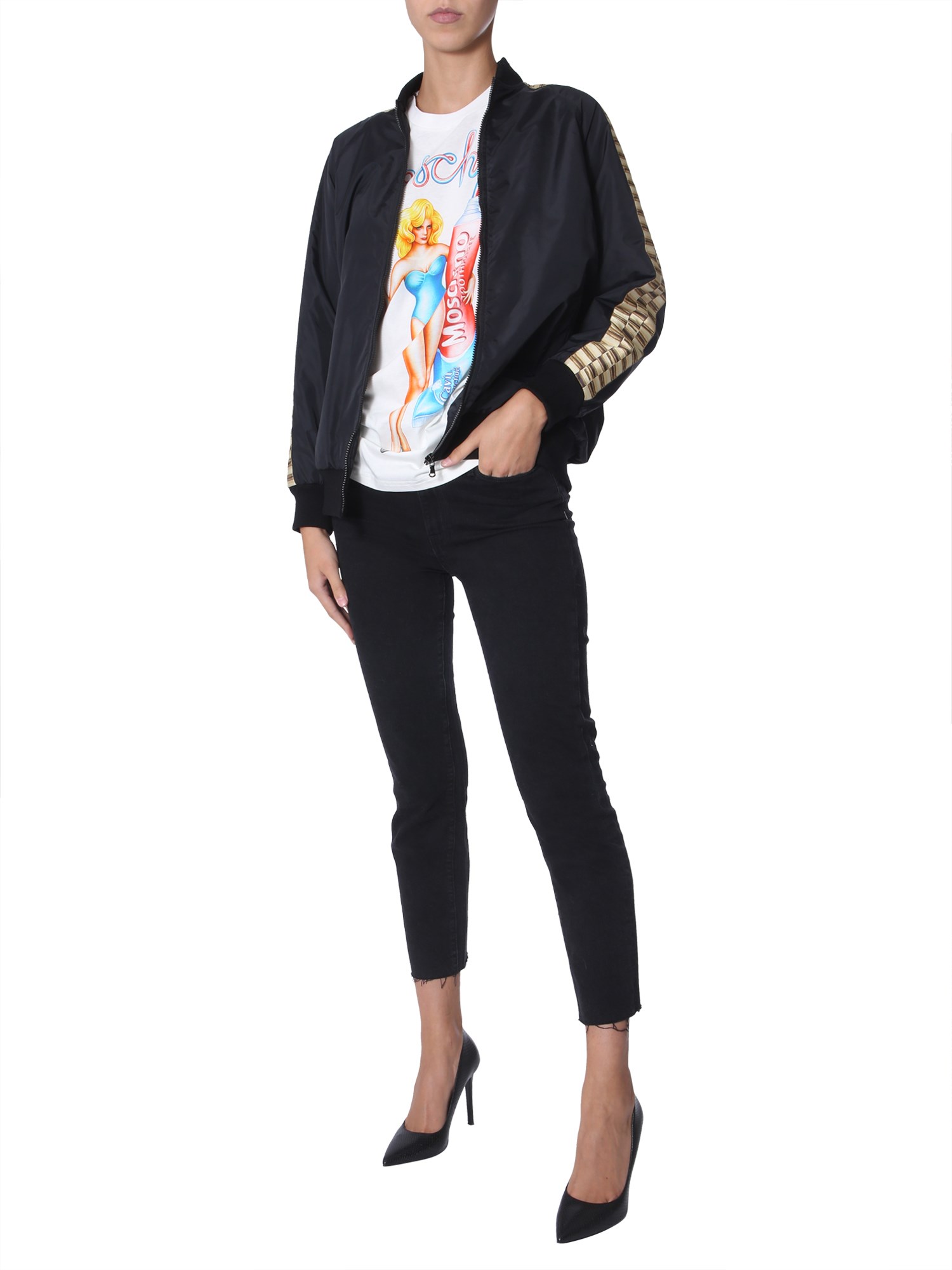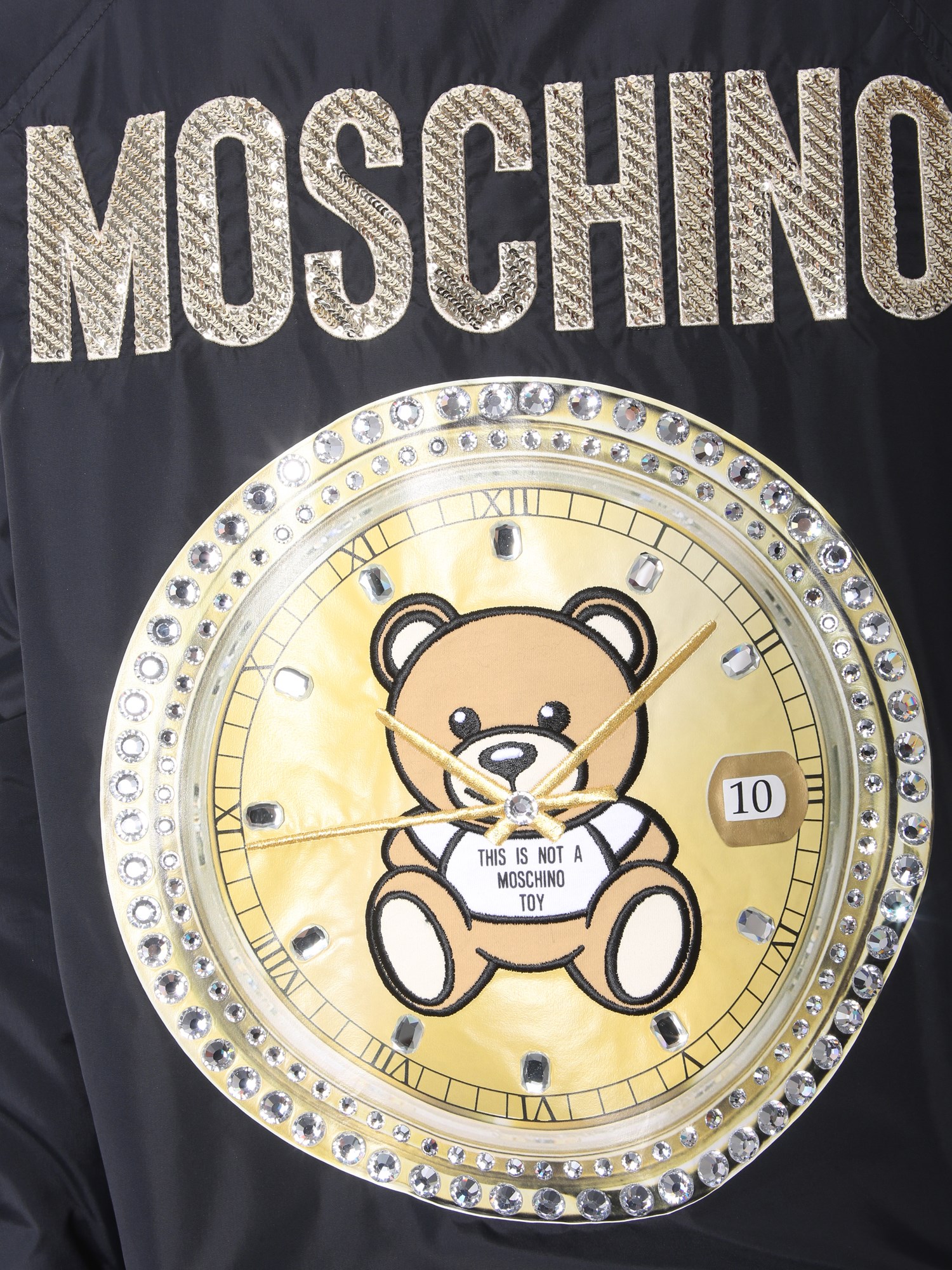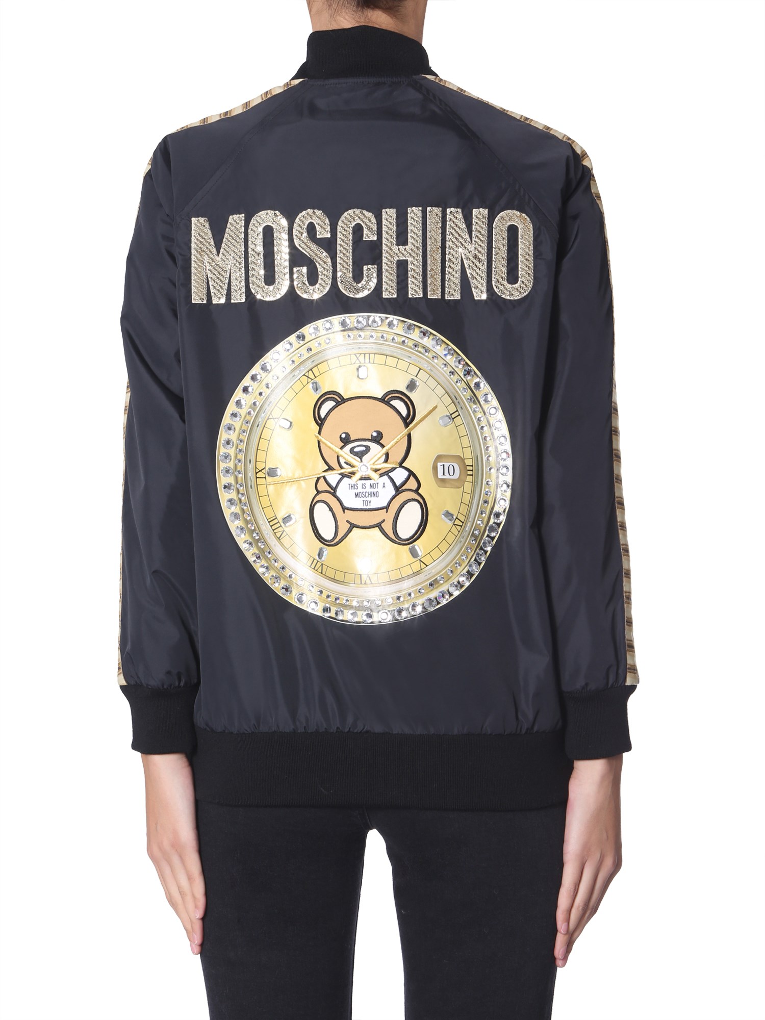 This winter, add this bomber with teddy bear from Moschino to your wardrobe. Its surface is comprised of 100% polyamide that makes it water and tear resistant. This durable jacket has teddy print at the back with sequin and stud details that give it an unmatched appeal. From night outs to casual parties, the jacket is perfect for every event.