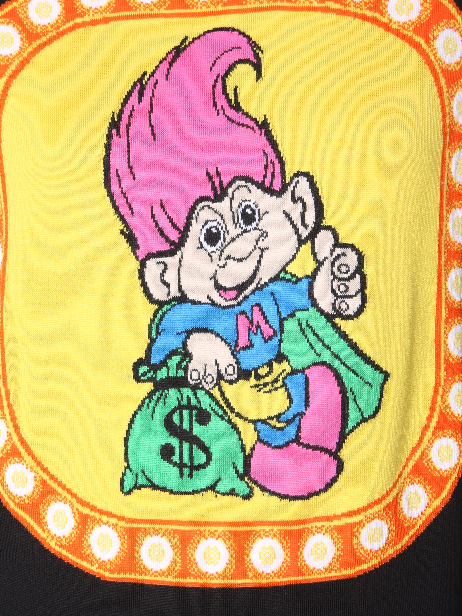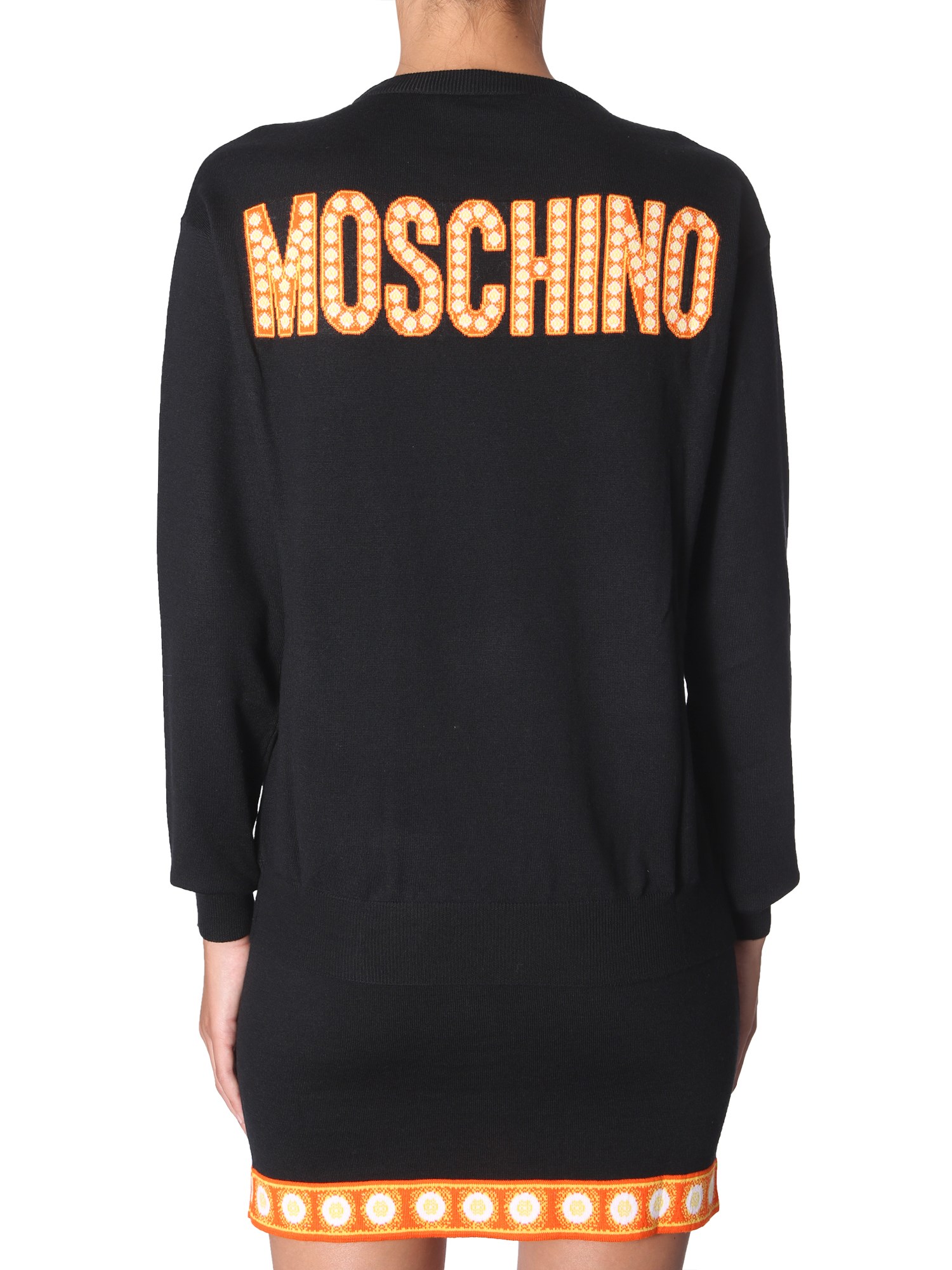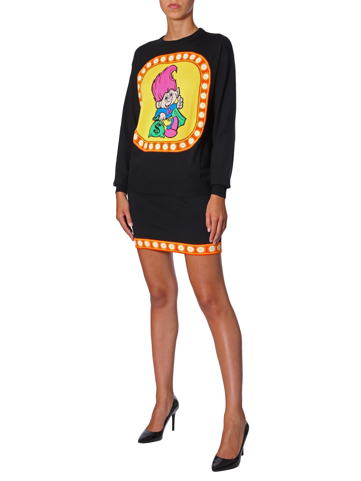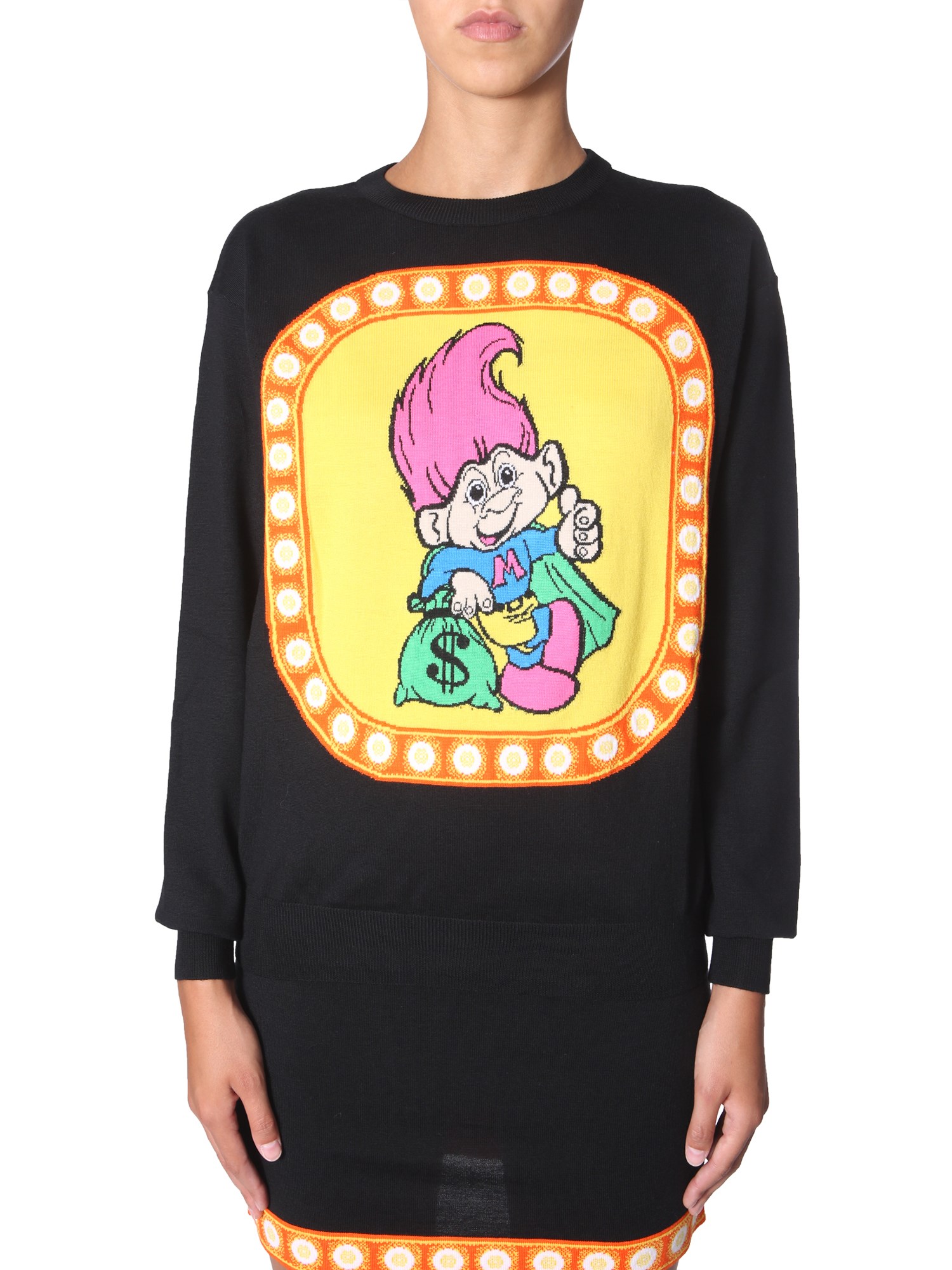 Add some funkiness to your wardrobe with this crew neck sweater from Moschino. Weaved using soft and pure virgin wool, this sweater gives complete comfort and warm. The vivid print detailing on the front adds a trendy touch. With ribbed neck cuffs and hem, it can be teamed with light shade denims and sneakers for a casual weekend look.