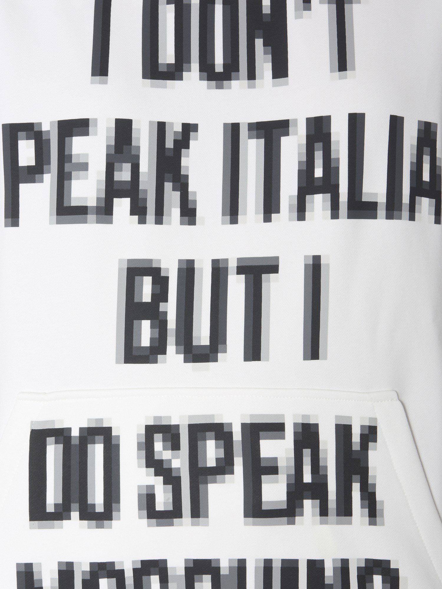 Ensure warmth and cosiness during winter hooded sweatshirt from Moschino. The sweatshirt is made with good quality cotton with a brushed interior to enjoy a comfortable fit. The printed front panel perfectly complements its light shade and allows it to be paired with any bottom wear. You can complete the look by wearing a pair of converse shoes.