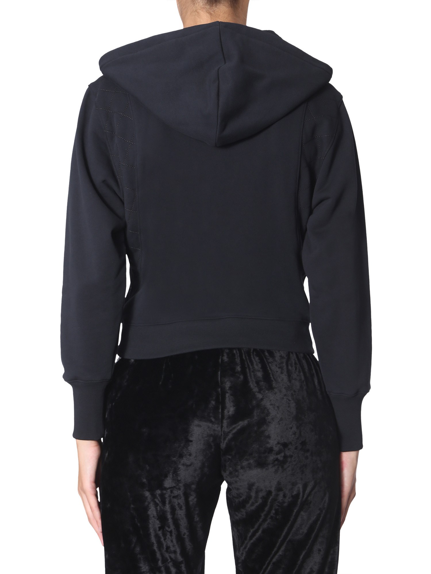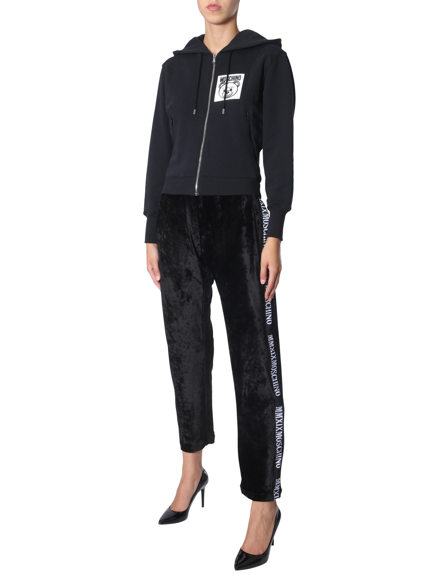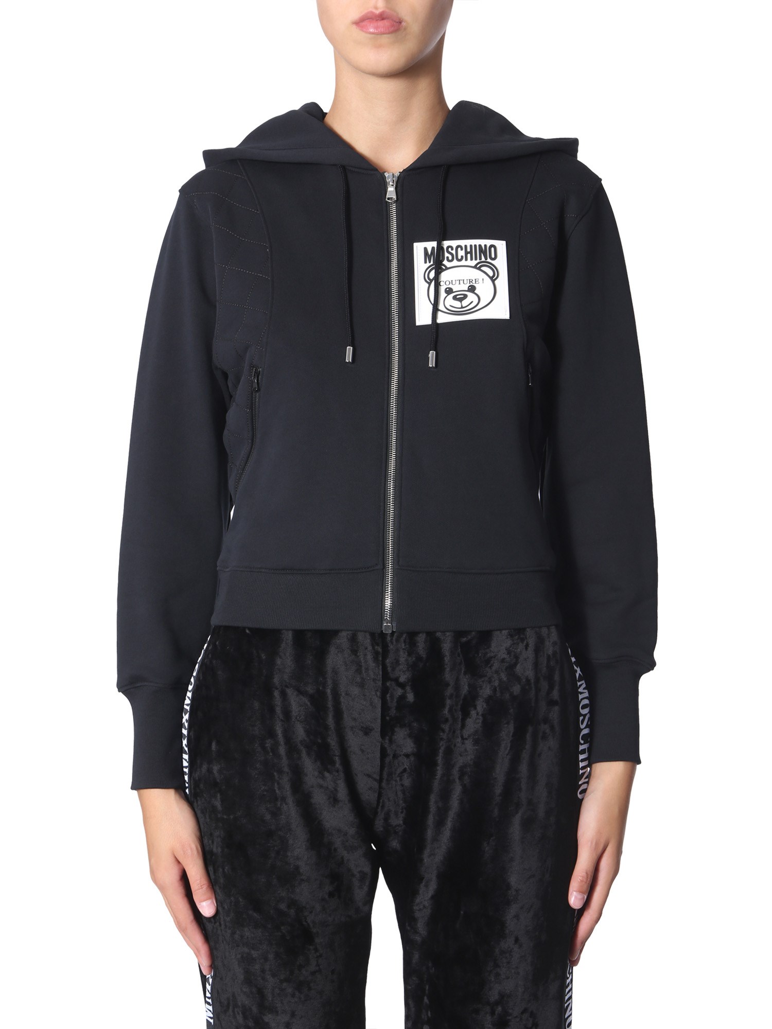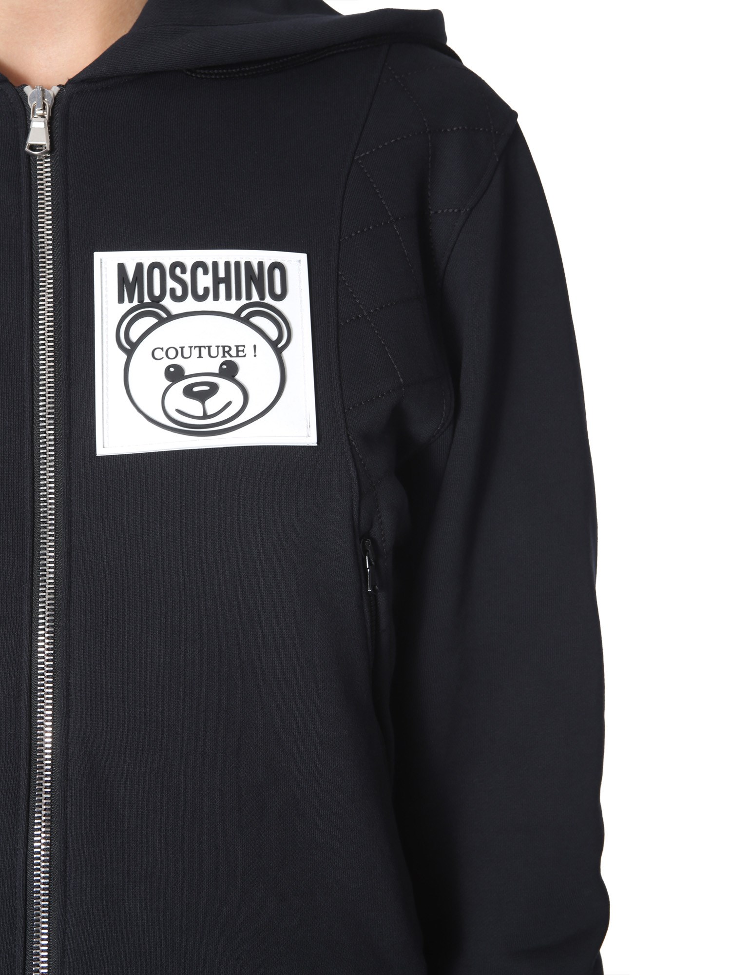 Create a style statement in the sweatshirt with teddy label from Moschino. This sweatshirt is made of 100% cotton and has a brushed inner to keep you warm throughout the day. Either side has a zip pocket for you to keep the necessary items close and safe. You can pair this sweatshirt with your favourite T-shirt and jeans to complete the look.