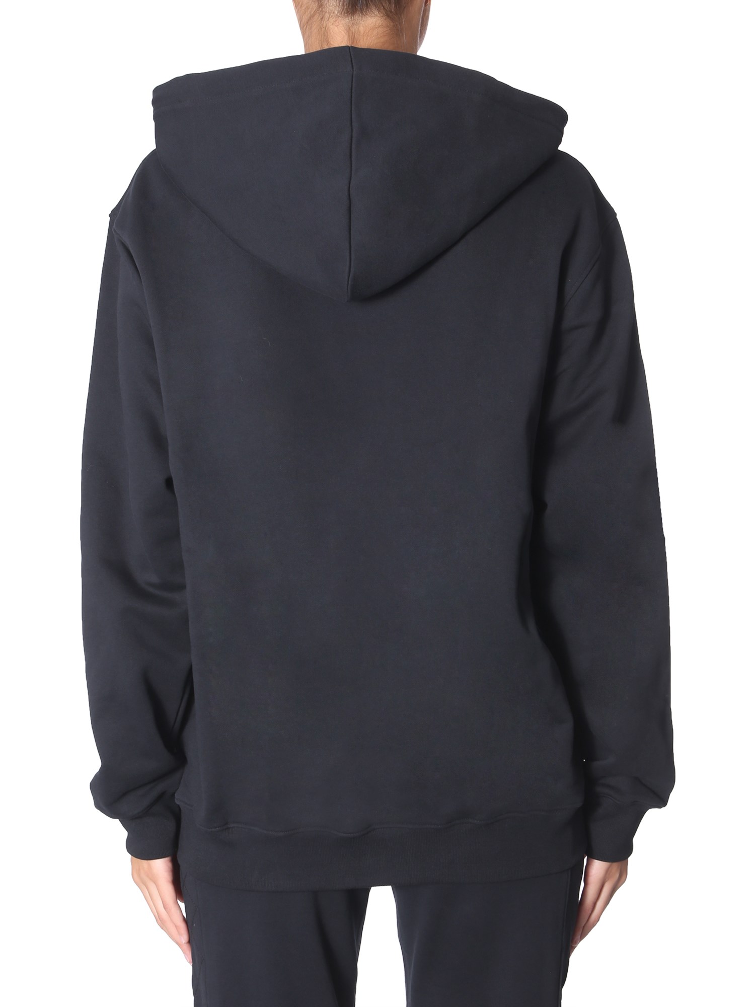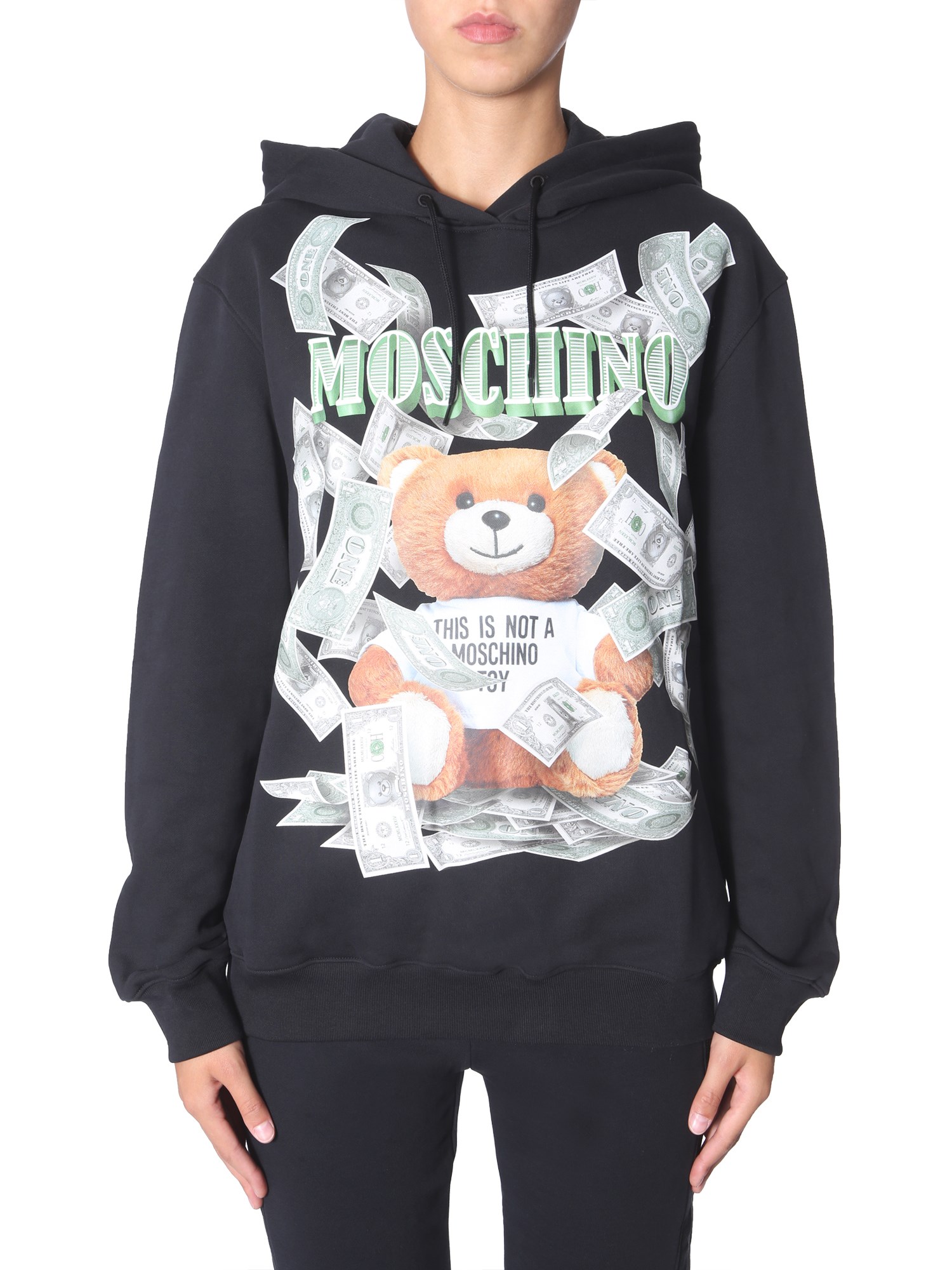 This hooded sweatshirt from Moschino will be a great addition to your winter wardrobe. Made of 100% cotton fabric, the apparel is breathable and soft on the skin. It is designed with a hooded neckline and ribbed cuffs to keep the wind away. The attractive print at the front makes it look fashionable and stylish.