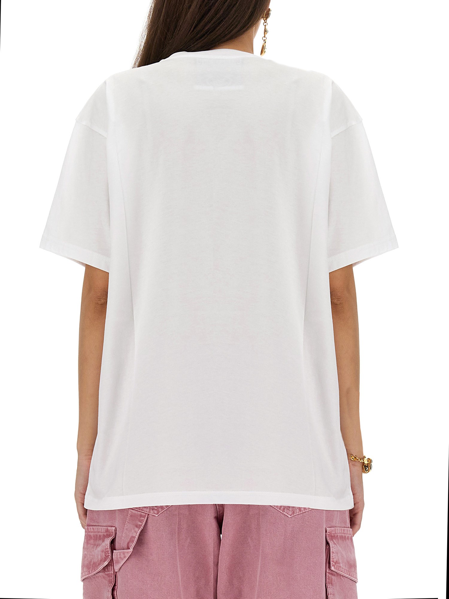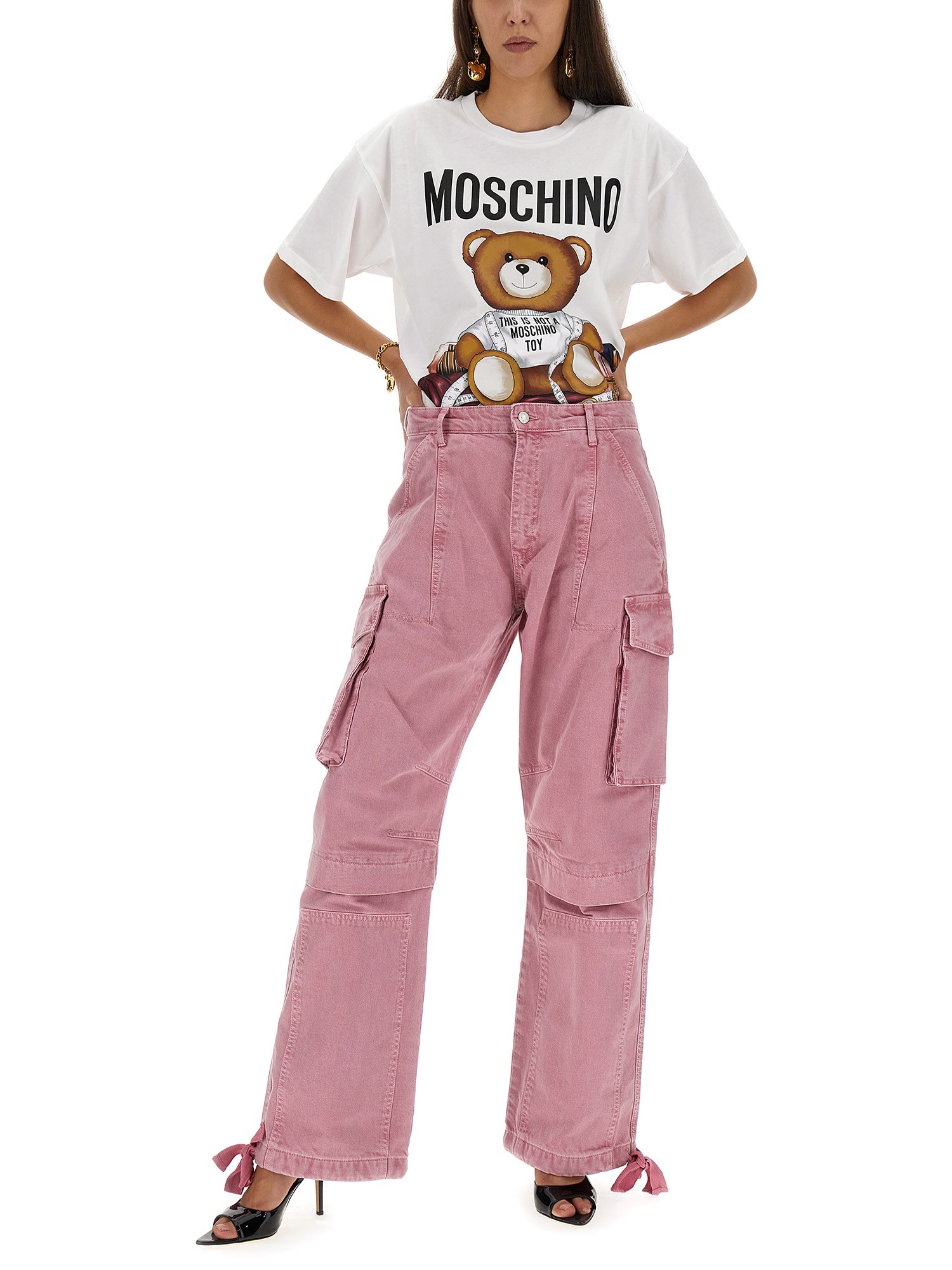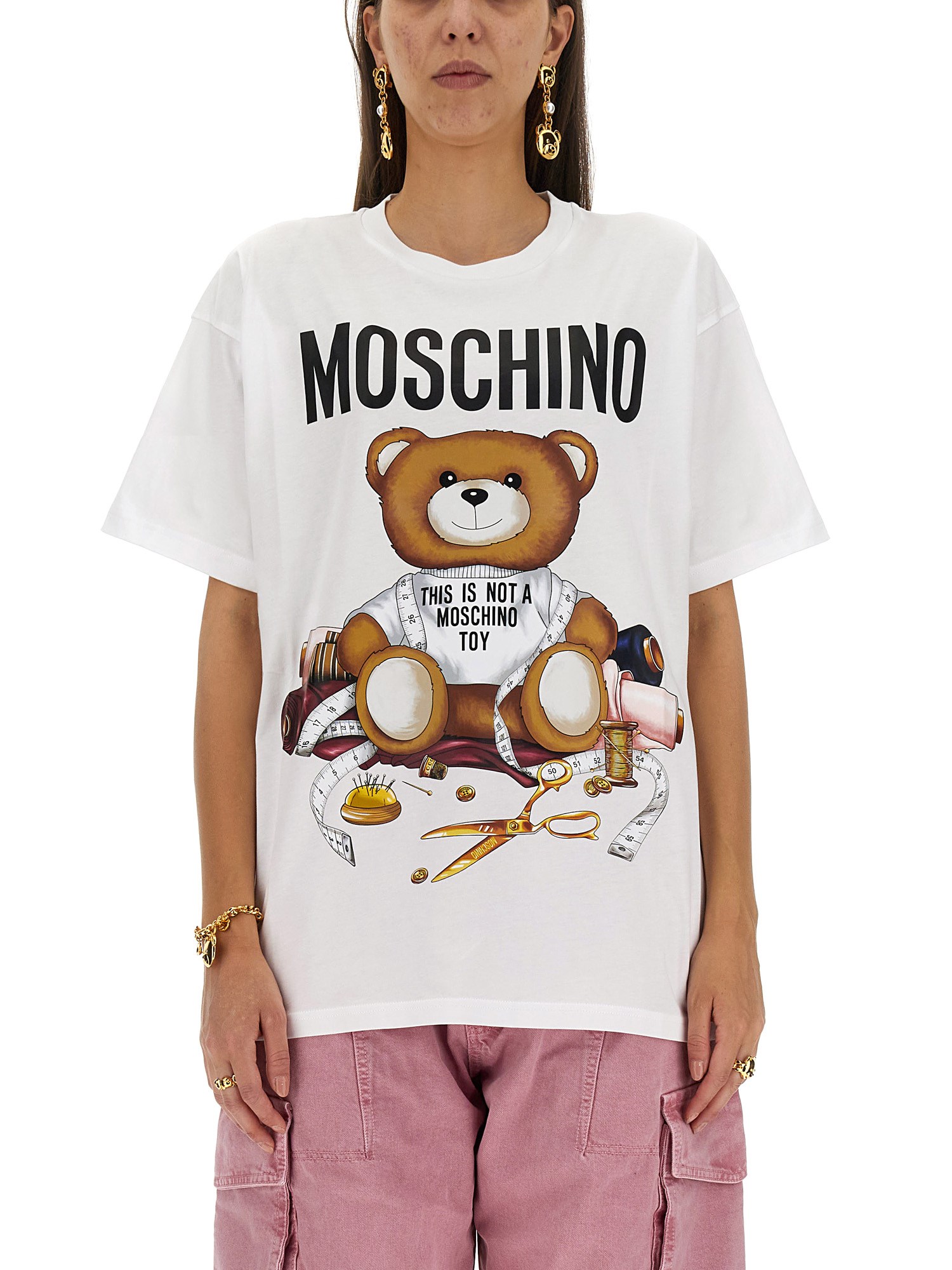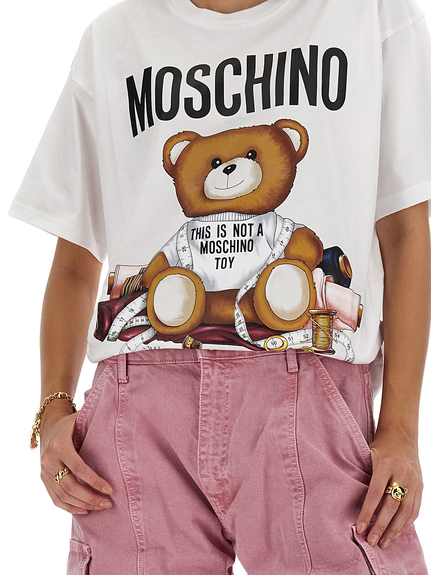 This Moschino T-shirt is perfect for those who love a comfortable and casual look. Made of soft cotton, it features an oversize fit that will make you feel cosy all day long. The white colour is versatile and easy to match with any outfit. The crew neck adds a classic touch to the design, while the teddy bear print gives it a playful and fun vibe.