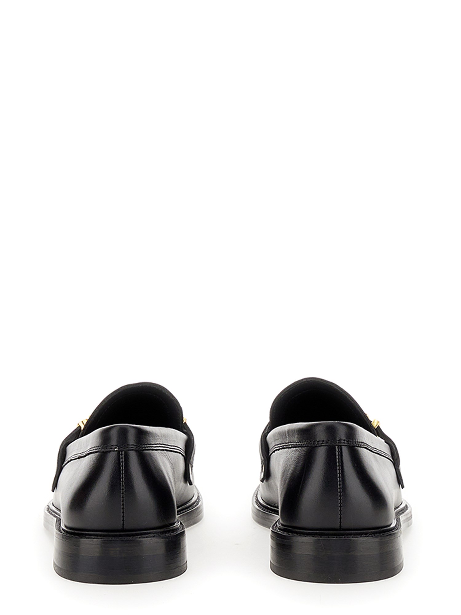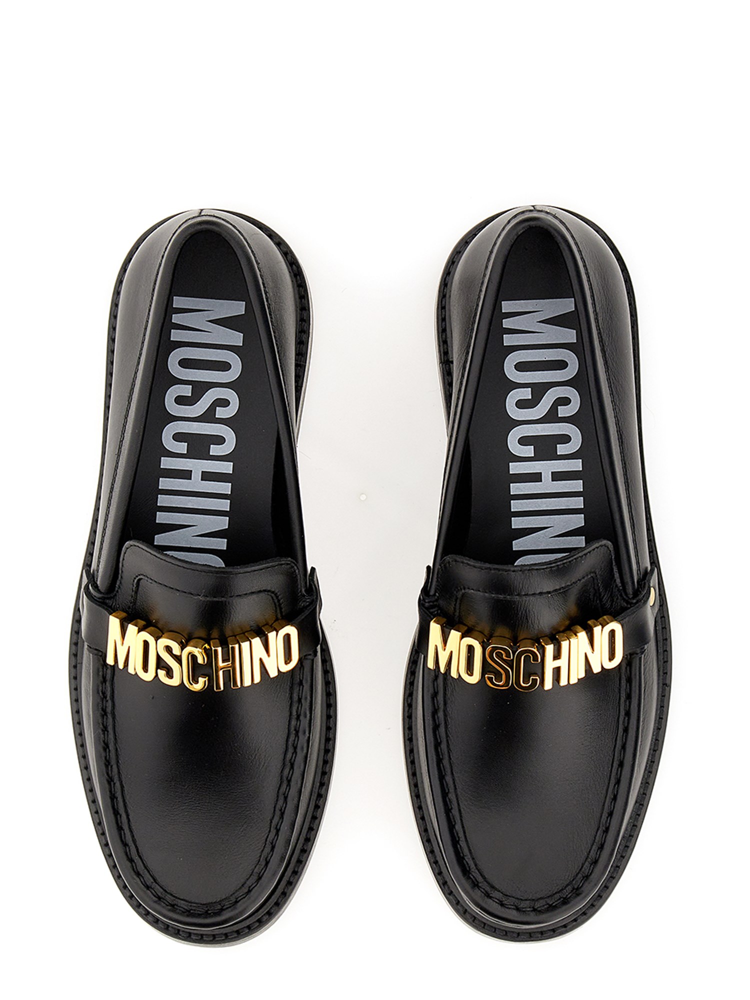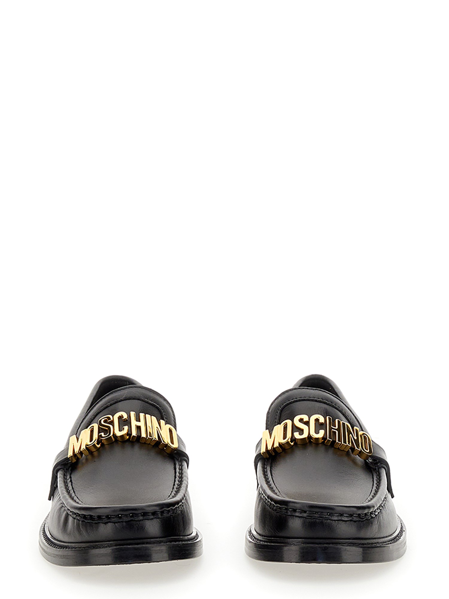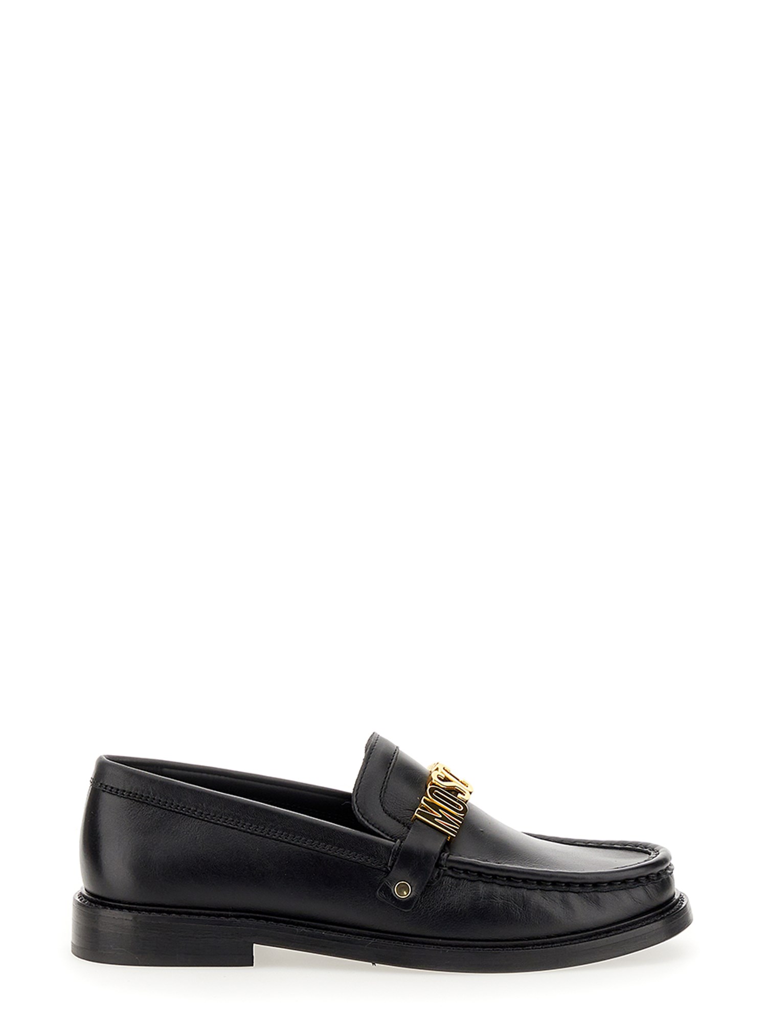 The Moschino loafer has leather construction and is a beautifully crafted shoe that features a supple leather upper. The padded footbed and roomy interior shoe are perfect for walking around town or relaxing at home. It has an easy slip-on style and a stacked heel silhouette. The upper has gold finish logo lettering hardware.