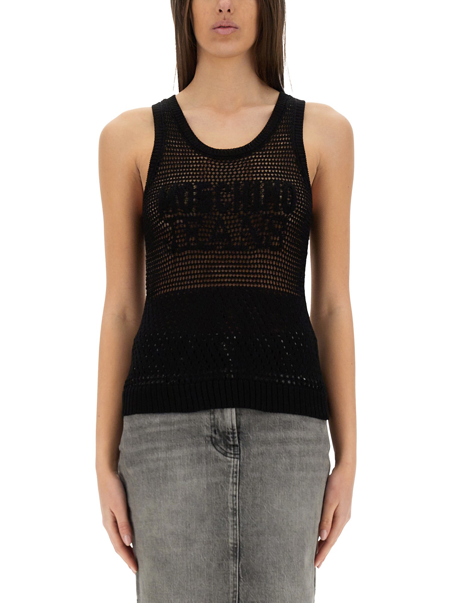 Elevate your wardrobe with the Moschino Jeans Mesh Top, a perfect blend of style and comfort. This eye-catching top features a bold logo design that showcases your fashion-forward sensibility while the breathable mesh fabric ensures you stay cool and comfortable all day long. Ideal for layering or wearing solo, this versatile piece effortlessly transitions from casual outings to chic evening events. Make a statement and express your unique style with this must-have addition to your collection.