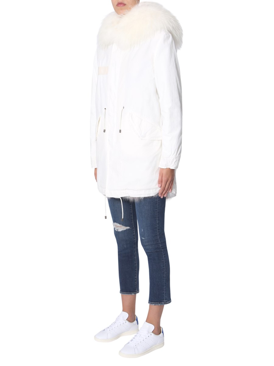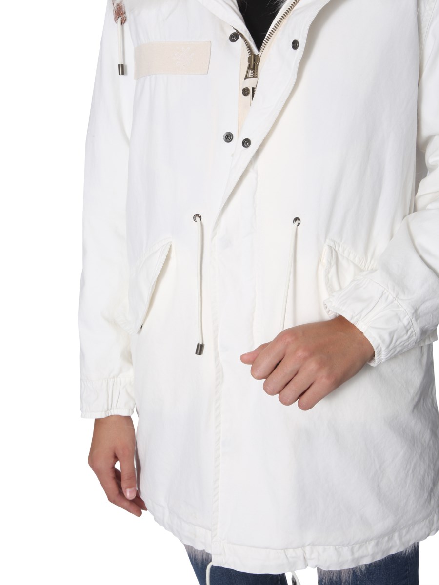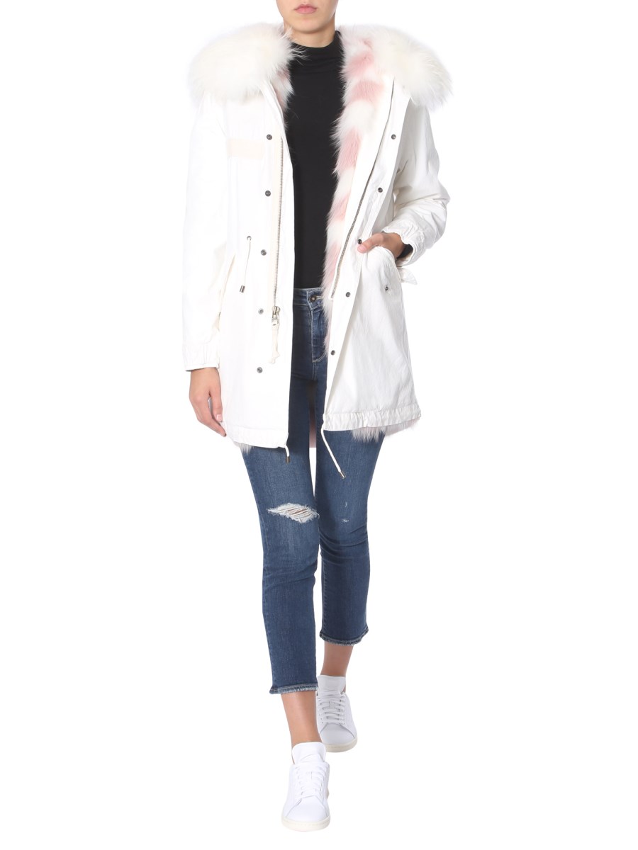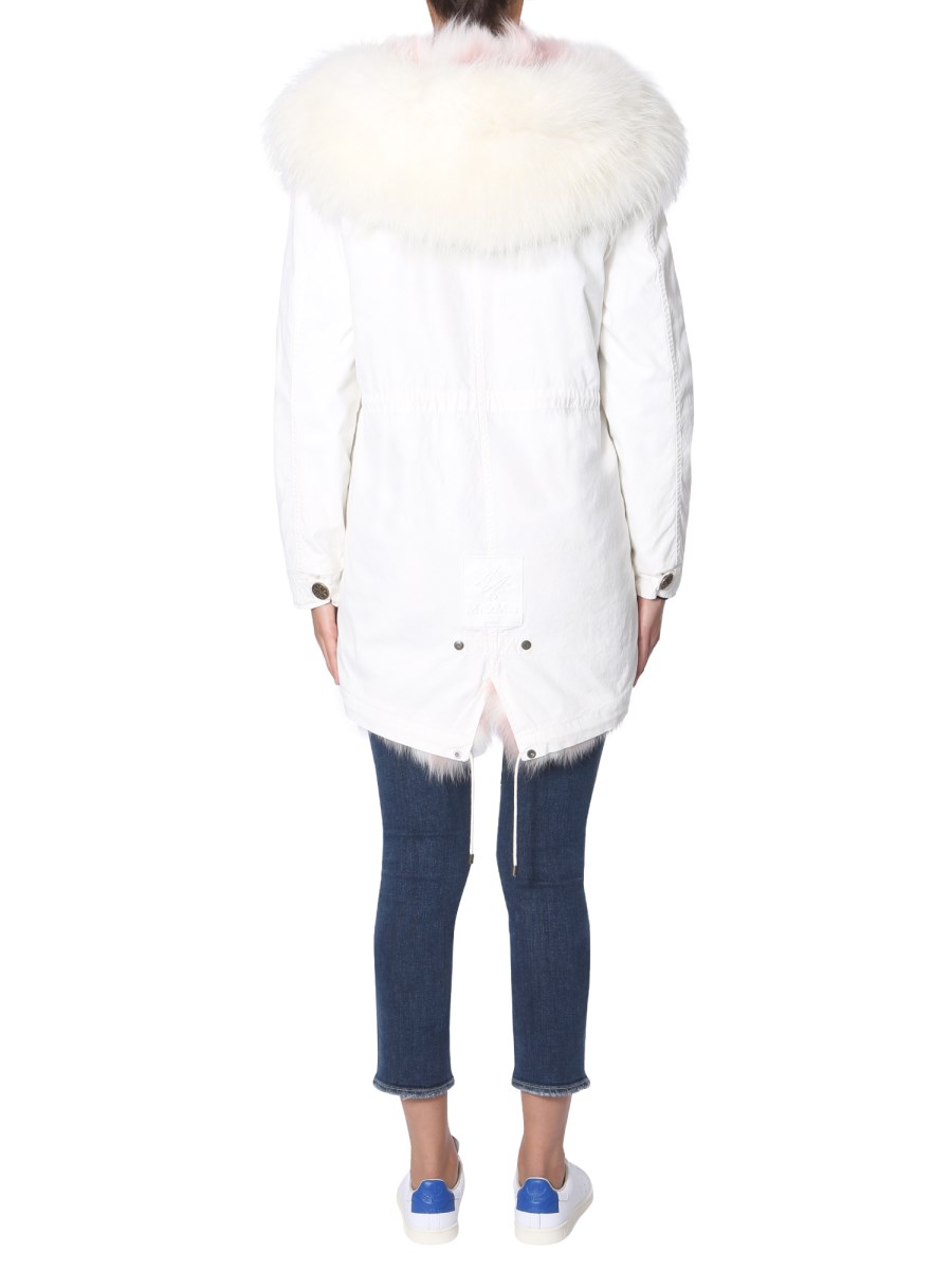 Head out in style with the Jazzy Midi parka by Mr & Mrs Italy. This long jacket has a zip and button closure at front for tight fit and elastic waistband to highlight your silhouette perfectly. The side pockets with flap are designed to keep small essentials safe. It is made with a blend of cotton and fox fur to keep you warm and comfortable.